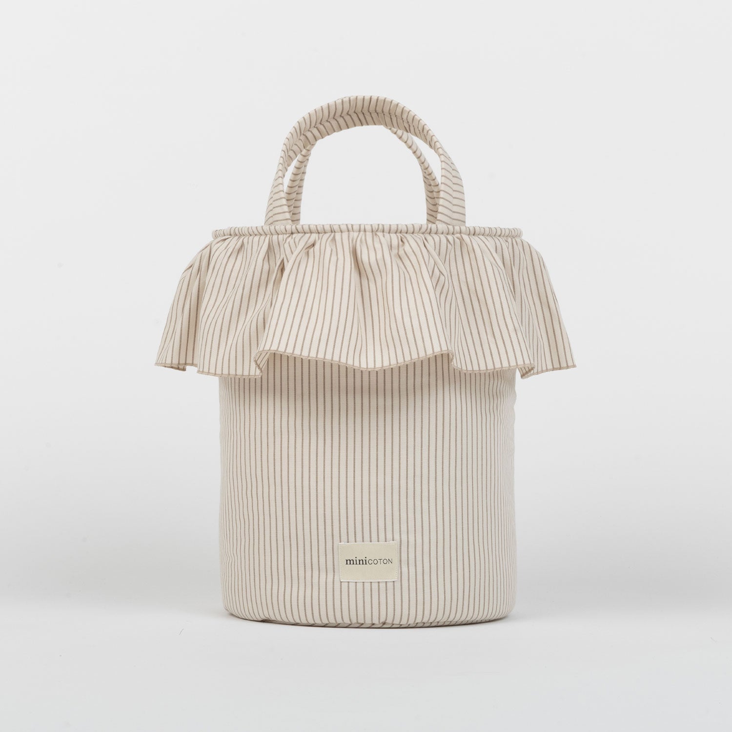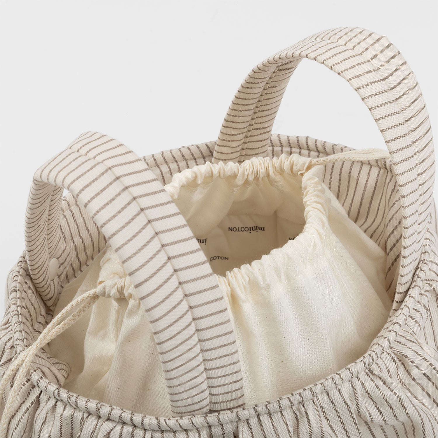 Una bossa molt especial per les seves anses de posar i treure, que adopten diferents posicions perquè sigui perfecta com a bossa de mà o bossa per al cotxet. Amb només dos clics la teva bossa canvia de format per acompanyar-te de la millor manera. Es tanca de manera molt pràctica amb els seus cordons a la part superior, com una bossa d’esmorzar. Té una gran capacitat i el seu interior és de teixit que repel·leix l’aigua i les taques, fàcil de netejar amb un drap humit. L’exterior és 100% cotó orgànic.