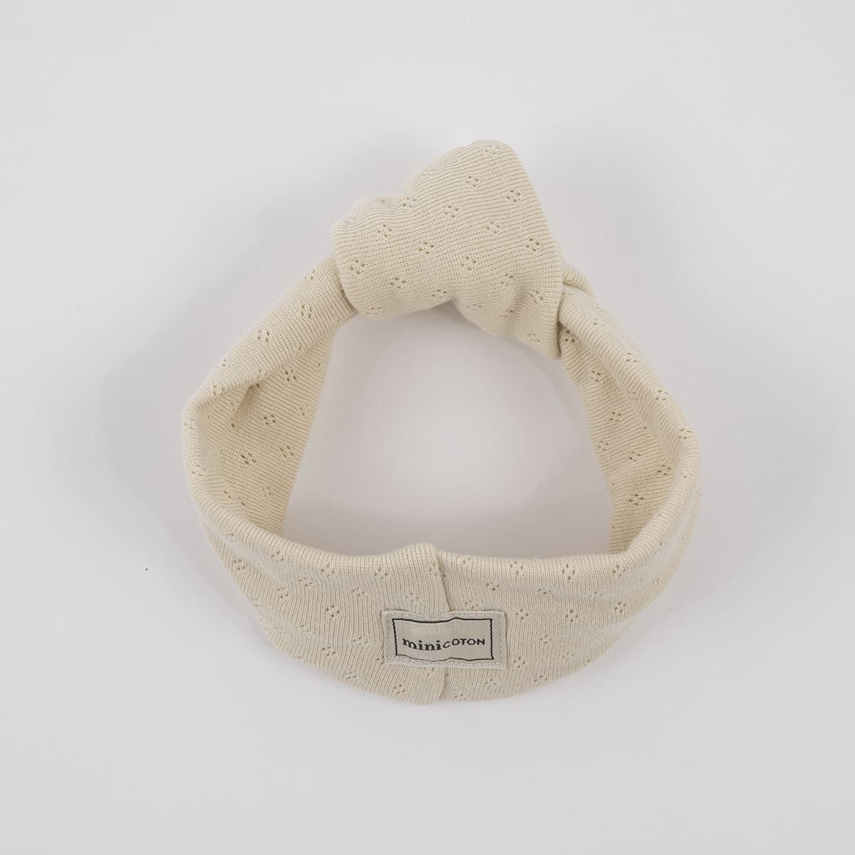 Diadema de nus de la col·lecció NEWBORN en punt holey de cotó. Gràcies al nus, es pot regular i ajustar la mida, per la qual cosa es pot usar des de nadó, deixant el nus més gruixut sense apretar, i anar ajustant el nus quan van fent-se grans. Sorprèn com s’adapten tan bé. Una manera ideal de completar els looks i fer-los ben estilats.
