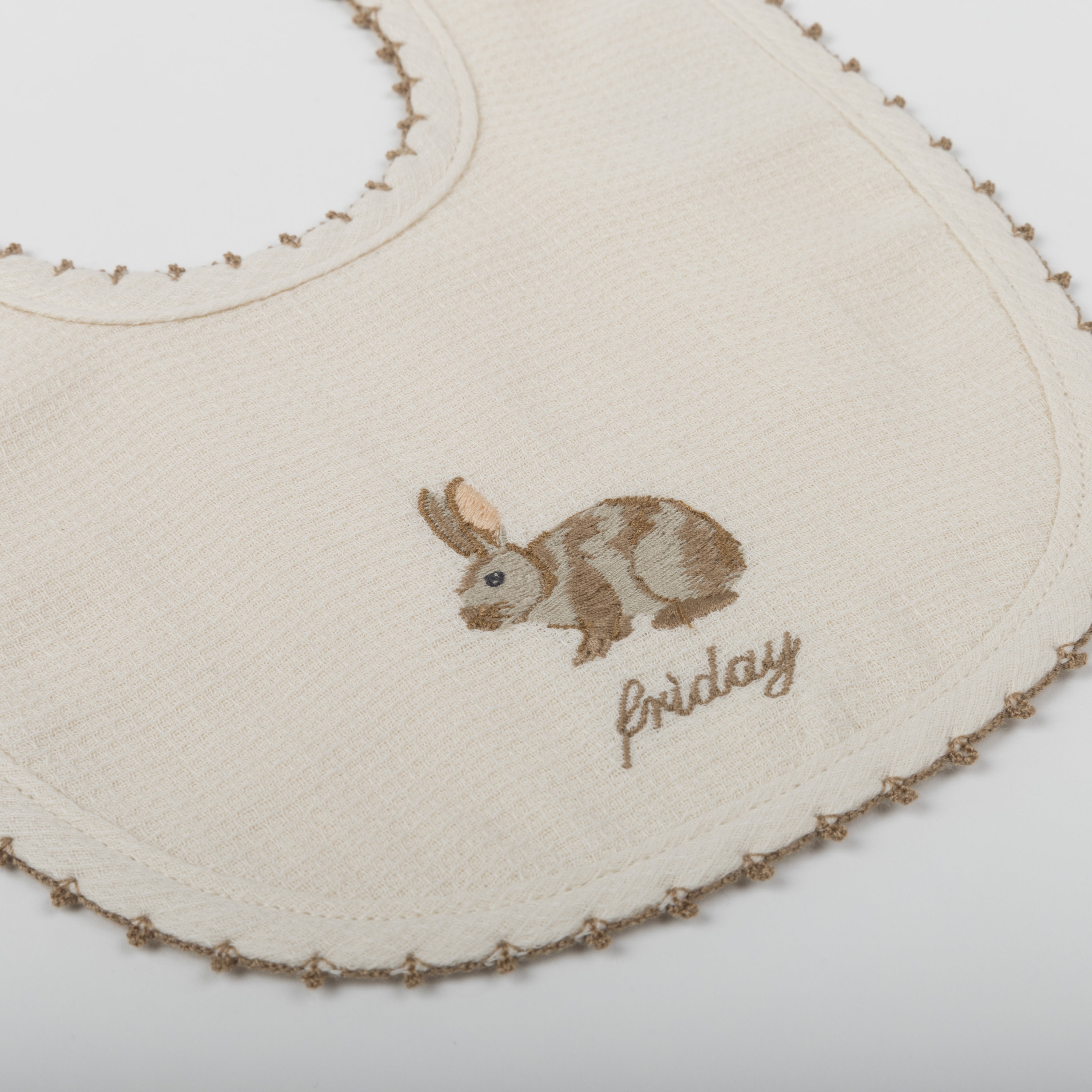 Set de 7 baberos amb els dies de la setmana, brodats i ribetejats amb suau fil de cotó. Amb dues capes de teixit perquè absorbeixi la humitat.