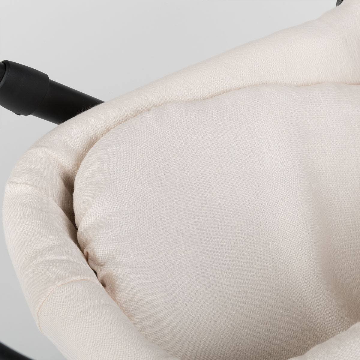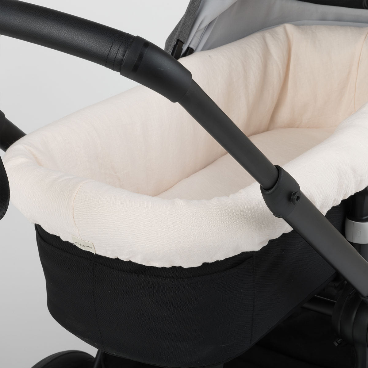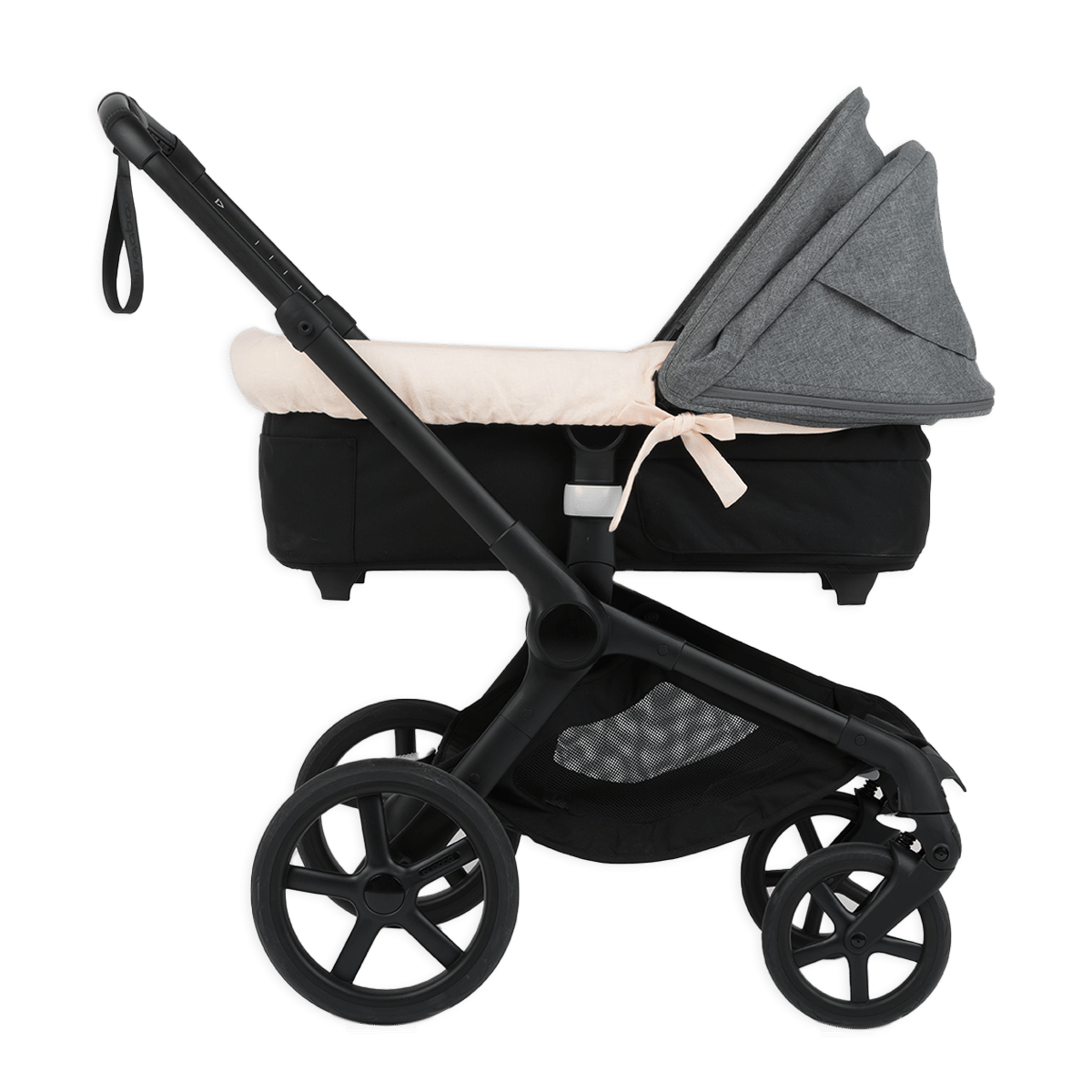 Dies ist unser Tragewannebezug für den Bugaboo Fox, Cameleon, Donkey und Buffalo. Minimalistisch, so wie wir es lieben. Er ist in die Tragewanne integriert und passt sowohl mit als auch ohne Fußabdeckung dank seiner seitlichen Bänder. Er wird über die Matratze gelegt und schafft einen Komfortbereich für das Baby.