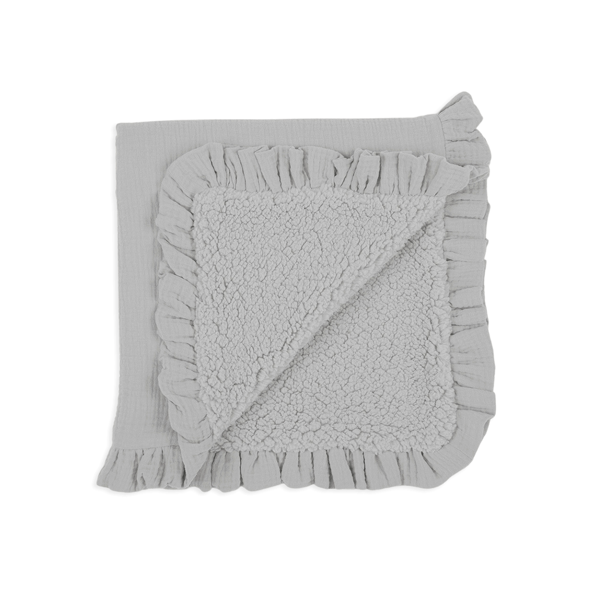 Viele Babys gewöhnen sich an ihre Decke und diese wird dann zu ihrem unzertrennlichen Begleiter, da sie ihnen Komfort schenkt und sie entspannt. Diese Decke ist aus 100% BIO-Baumwoll-Batist gefertigt, mit einem weichen Schafsfell-Innenfutter und einem Volant am Rand.