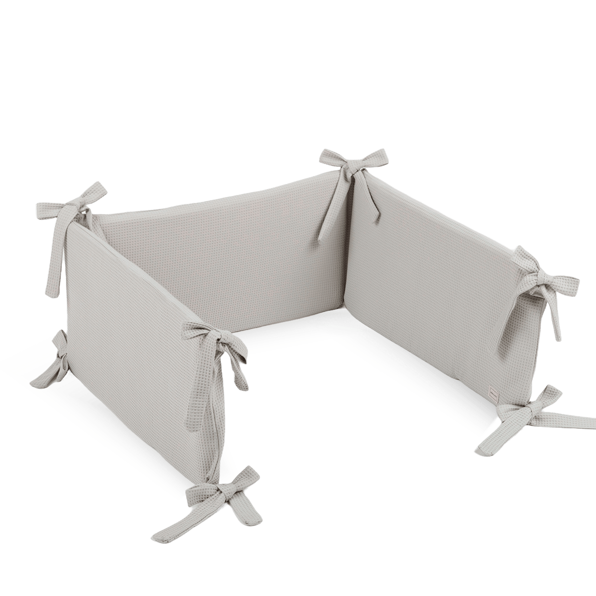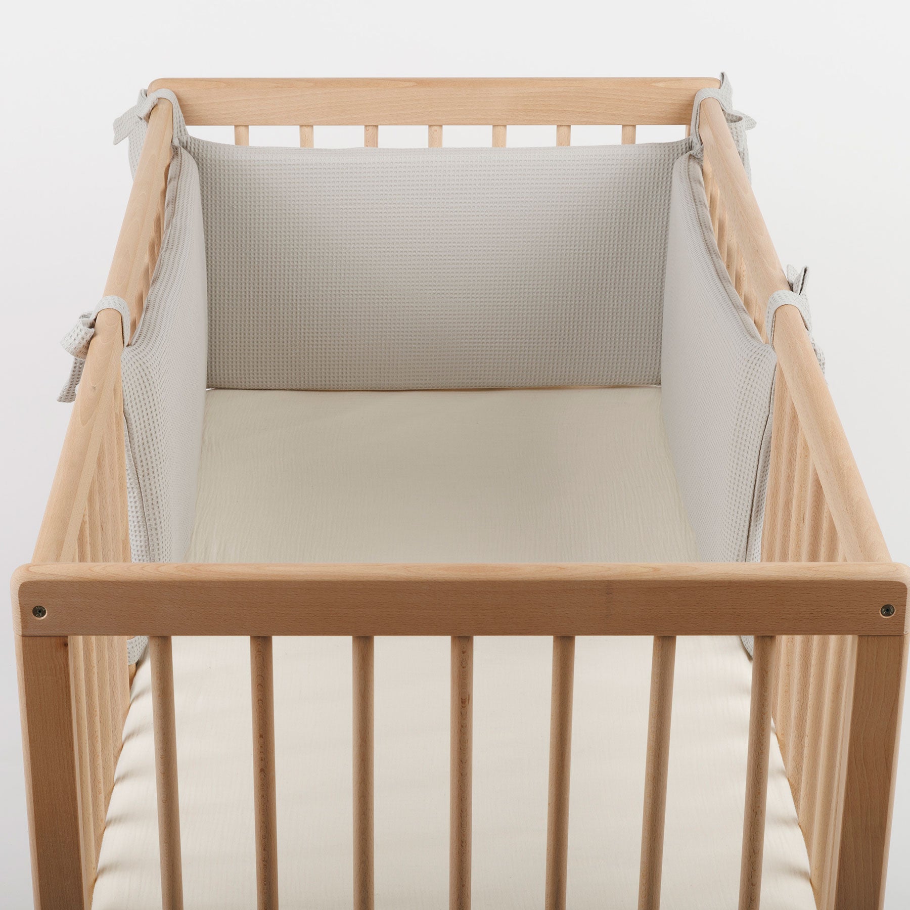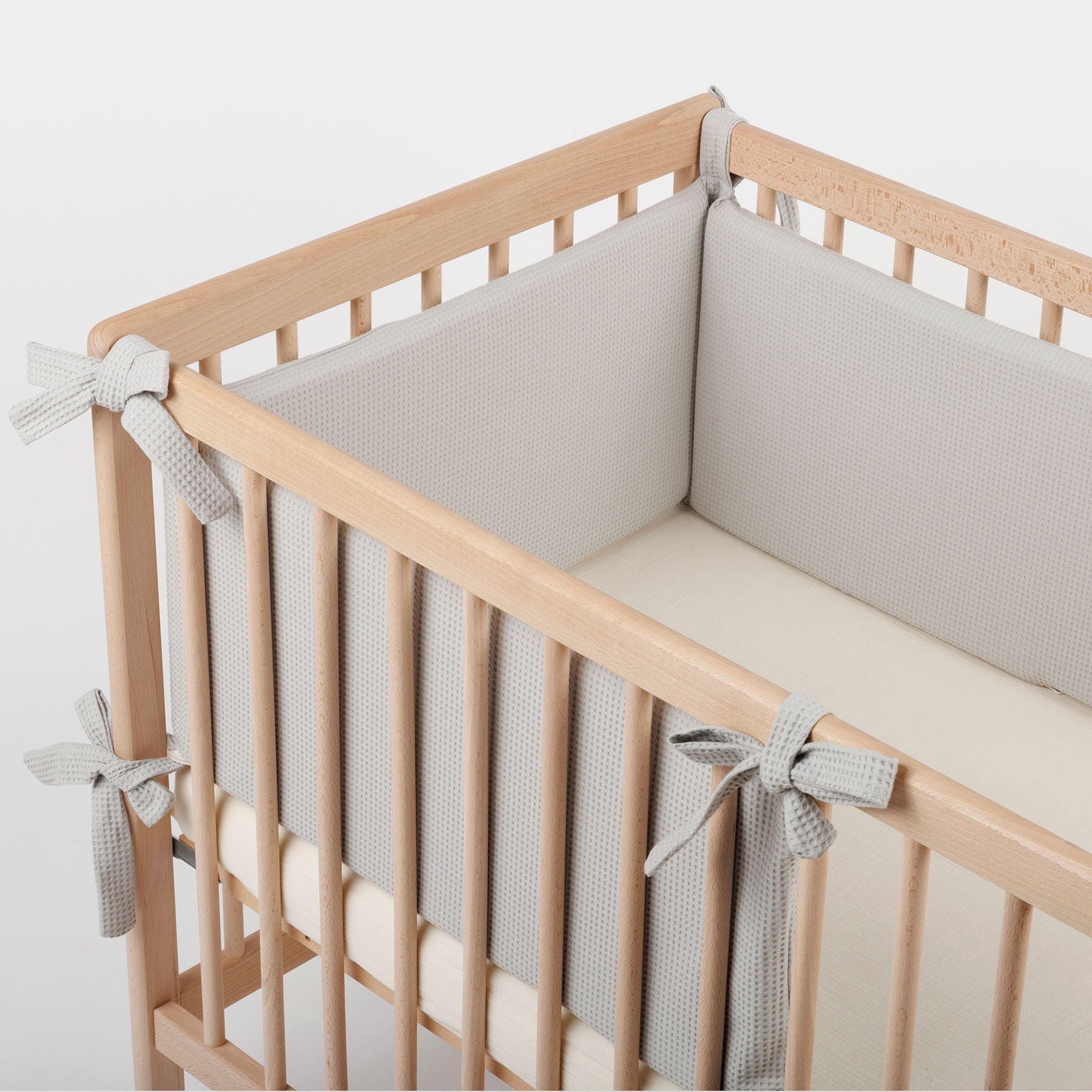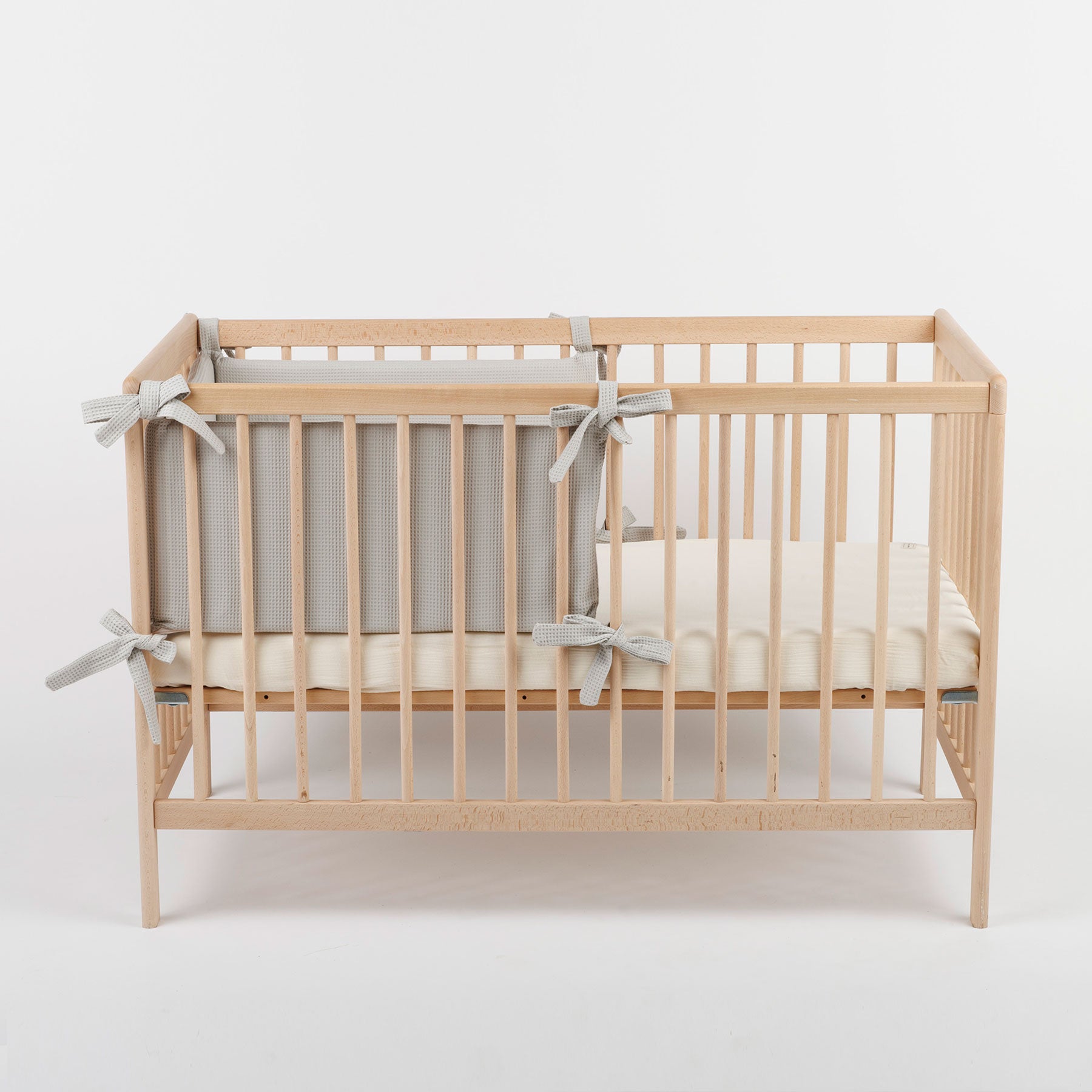 Er ist abnehmbar, hat Reißverschlüsse unten, um die Füllungen herauszunehmen und den Bezug zu waschen. Er wird mit Schleifen an den Gitterstäben befestigt.