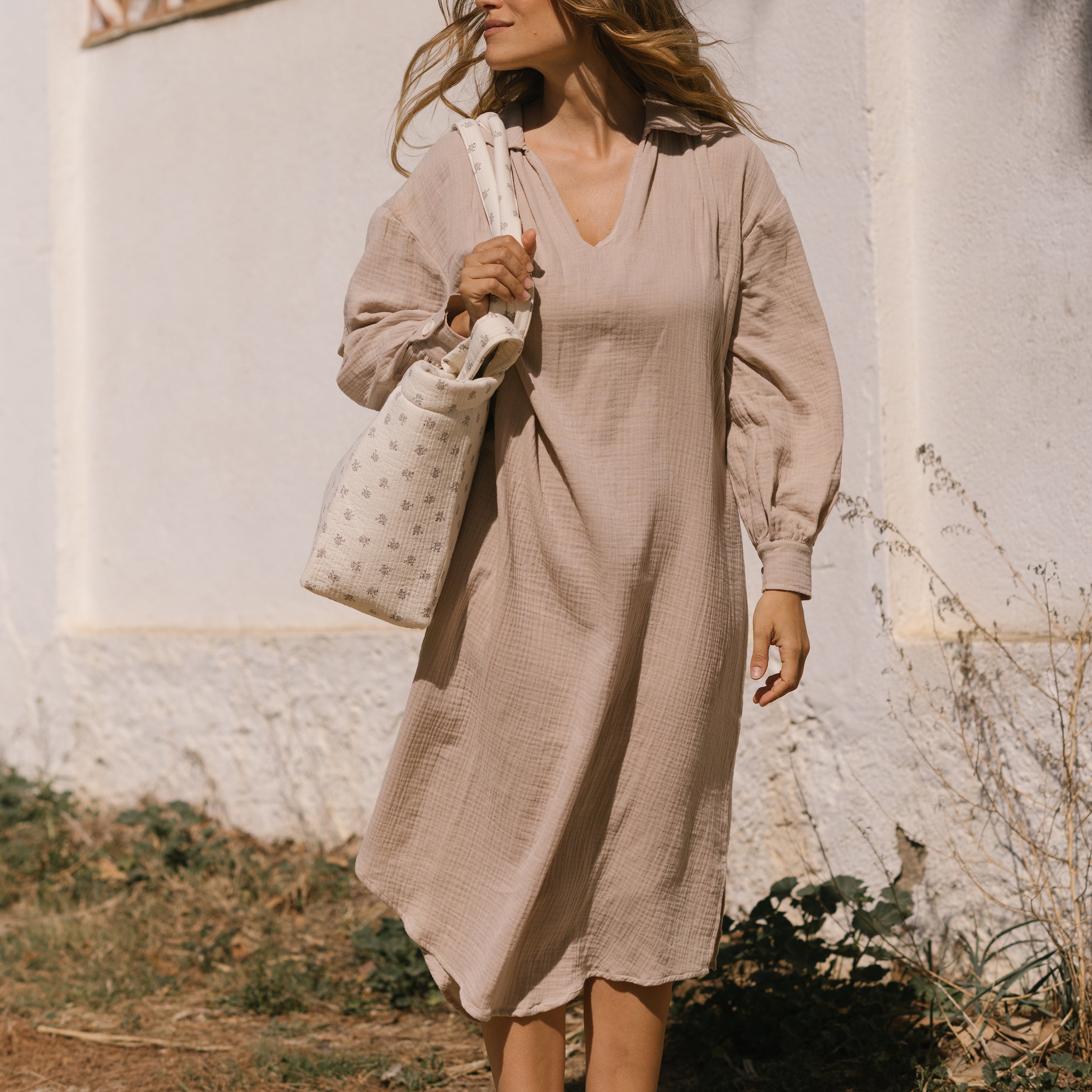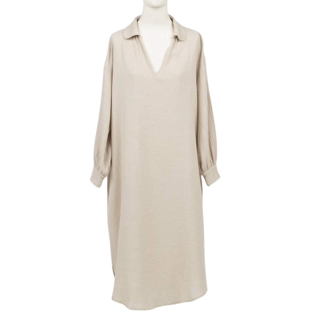 Kleid aus 100% Bio-Baumwoll-Batist. Ein sehr bequemes Kleid mit langen Ärmeln und rundem Blusenkragen.