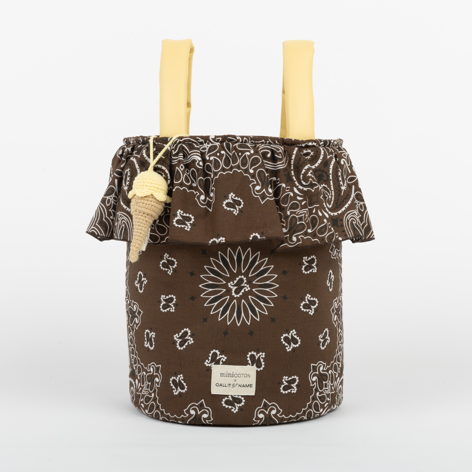 Eine ganz besondere Tasche mit abnehmbaren Griffen, die verschiedene Positionen einnehmen, damit sie perfekt als Handtasche oder Kinderwagen-Tasche geeignet ist. Mit nur zwei Klicks ändert deine Tasche ihr Format, um dich bestmöglich zu begleiten. Sie wird sehr praktisch mit Kordeln oben verschlossen, wie eine Brotzeittasche. Sie hat ein großes Fassungsvermögen und ihr Inneres besteht aus wasser- und schmutzabweisendem Stoff, der sich leicht mit einem feuchten Tuch reinigen lässt. Hergestellt aus Bandanas aus den USA aus 100 % Baumwolle.