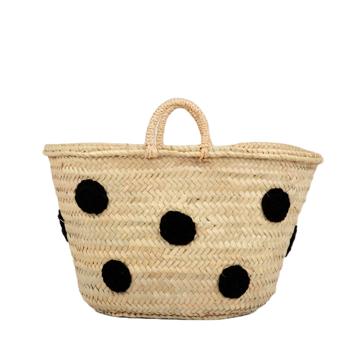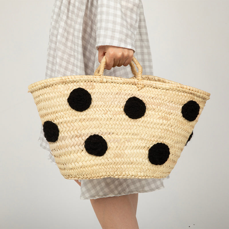 Der Korb besteht ebenfalls aus Palmblättern und ist handgefertigt, daher können die Maße leicht variieren, aber ungefähr misst er 40 x 24 cm. Die schwarzen Punkte sind einzeln von Hand gestickt.