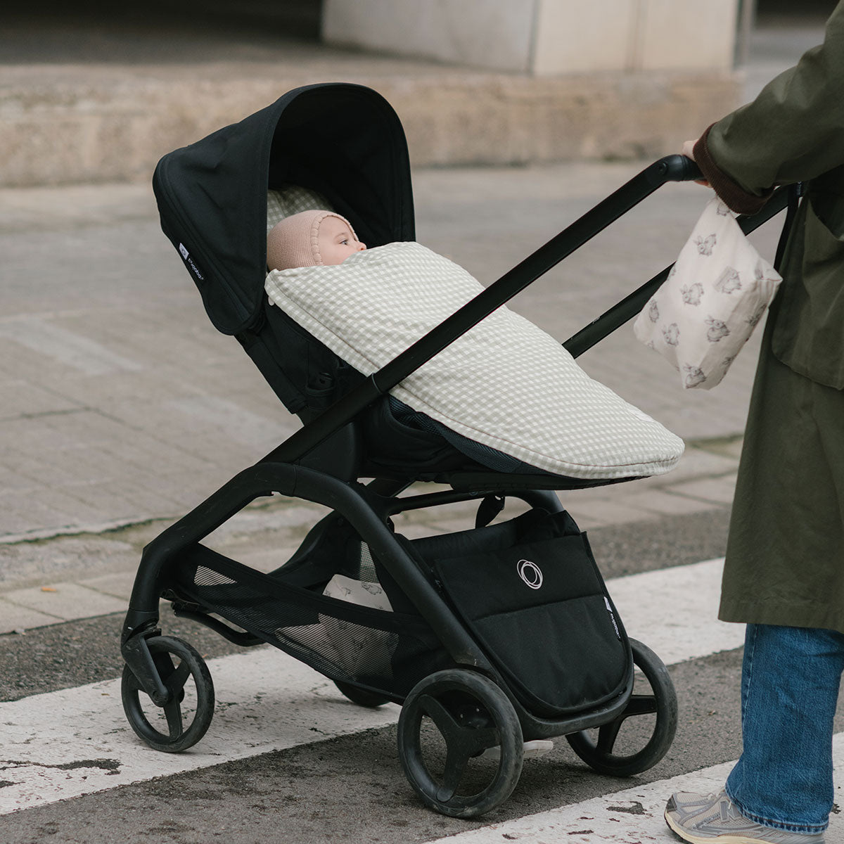 Das ist unser universeller Fußsack für den Kinderwagen. Er besteht aus dem Sitzbezug, dem Fußsack und zwei Füllungen: einer dünnen und einer dickeren mit Dauneneffekt, beide leicht und flauschig. Sie können je nach Bedarf einzeln oder zusammen verwendet werden. Der Fußsack ist abnehmbar und alle Teile lassen sich voneinander trennen, was das Waschen erleichtert, da nicht alles komplett gewaschen werden muss, sondern nur die Teile, die es benötigen. Die Innenseite des Fußsacks besteht aus samtweichem Baumwollstrick in meliertem Grau, der sich angenehm anfühlt und unempfindlich gegenüber Reibung ist.
