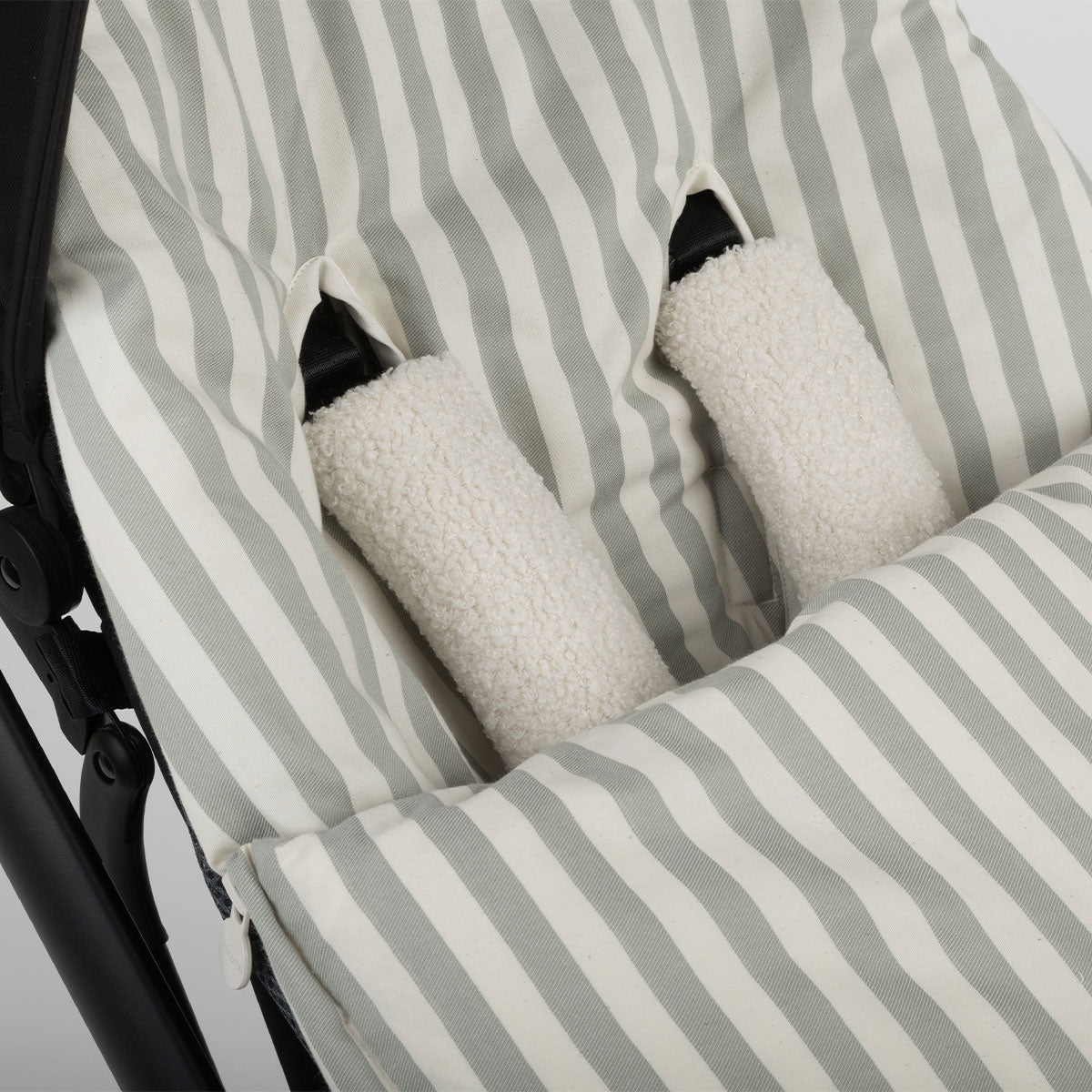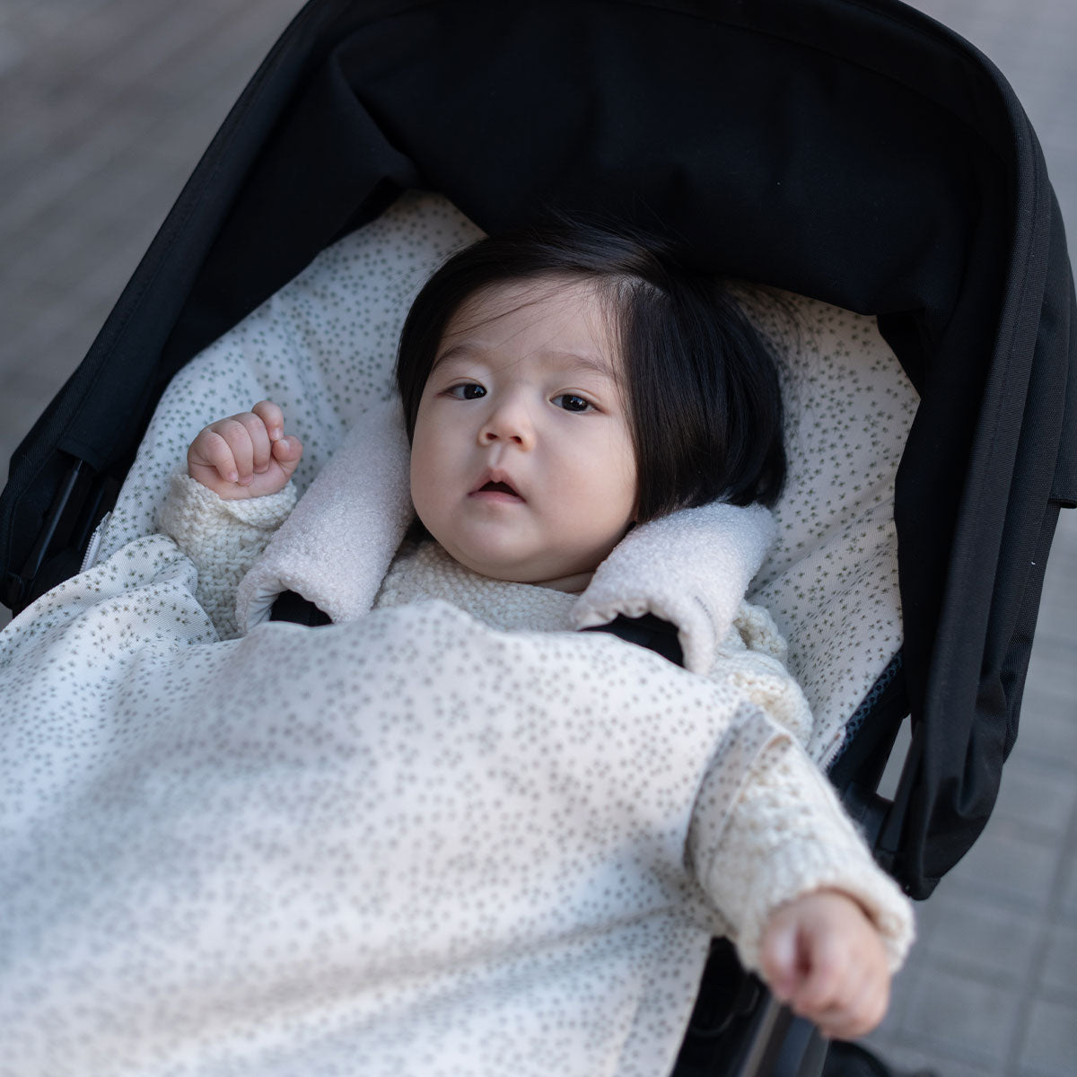 Wendbar, auf der einen Seite naturfarbener Musselin und auf der anderen Seite Lammfell.