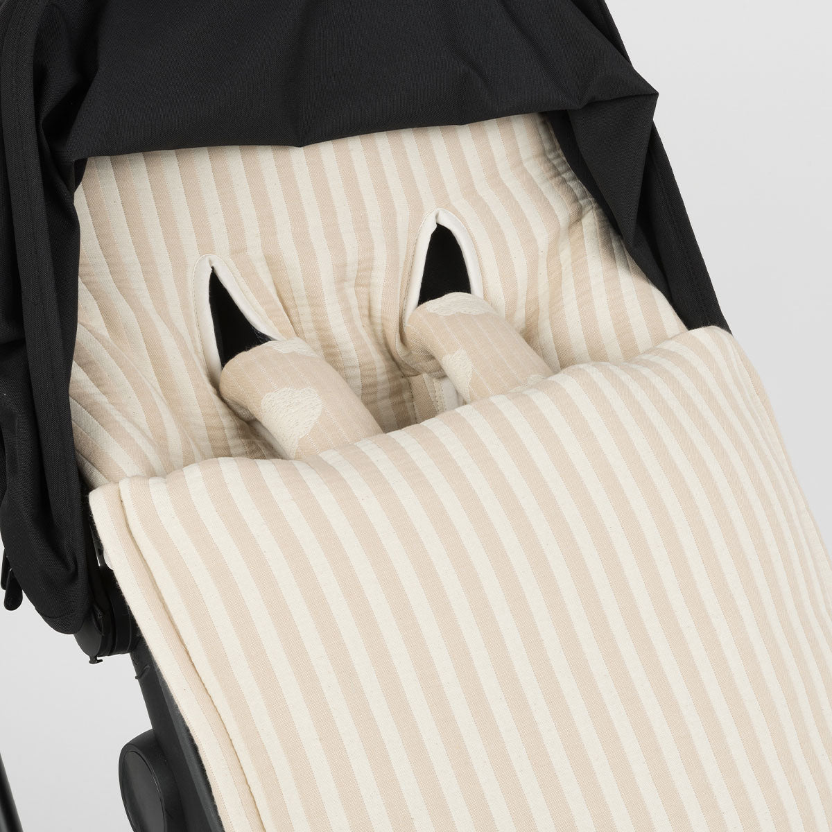 Wendbar, auf der einen Seite naturfarbener Musselin und auf der anderen Seite Lammfell.
