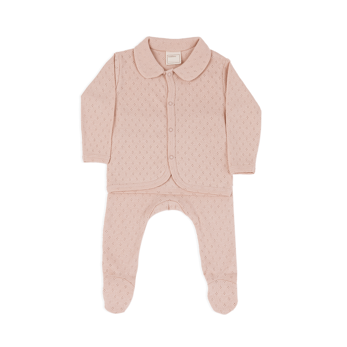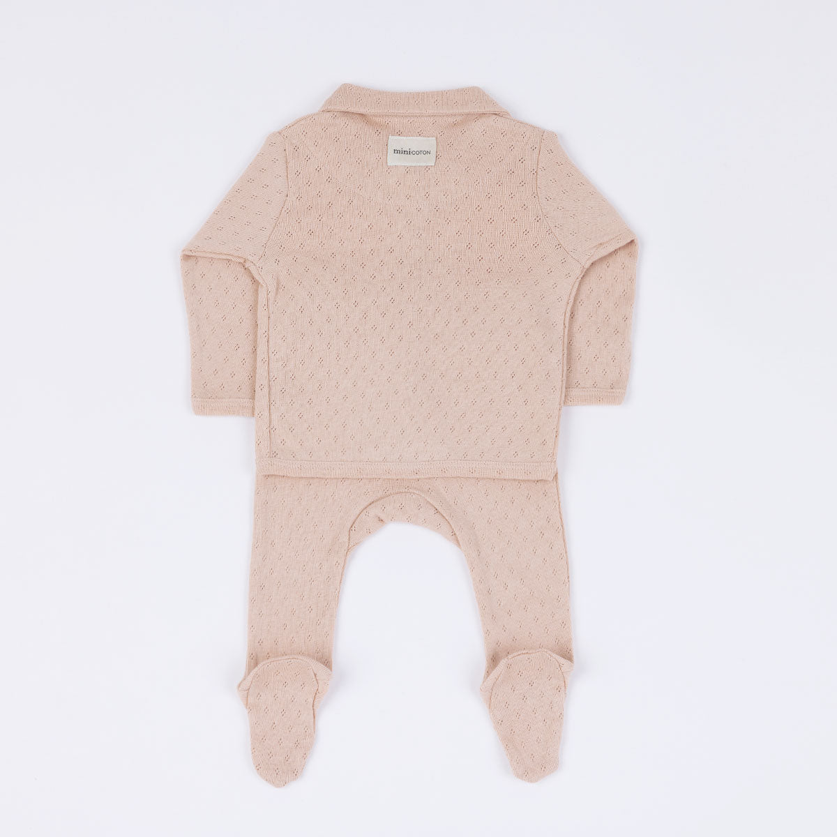 Erstausstattung, ein unverzichtbarer Begleiter in der Kliniktasche. Set bestehend aus Top mit Knöpfen und Beinling. Hergestellt aus Holey, weichem, durchlöchertem Baumwollstrick. Passend dazu gibt es auch die Mütze.