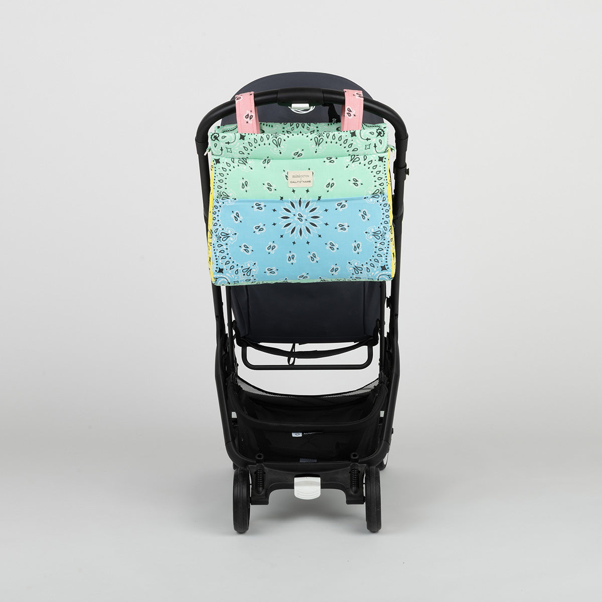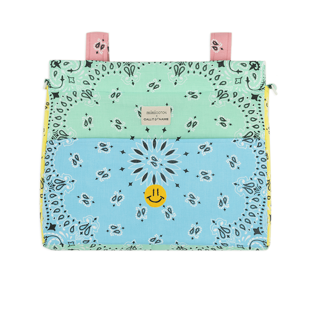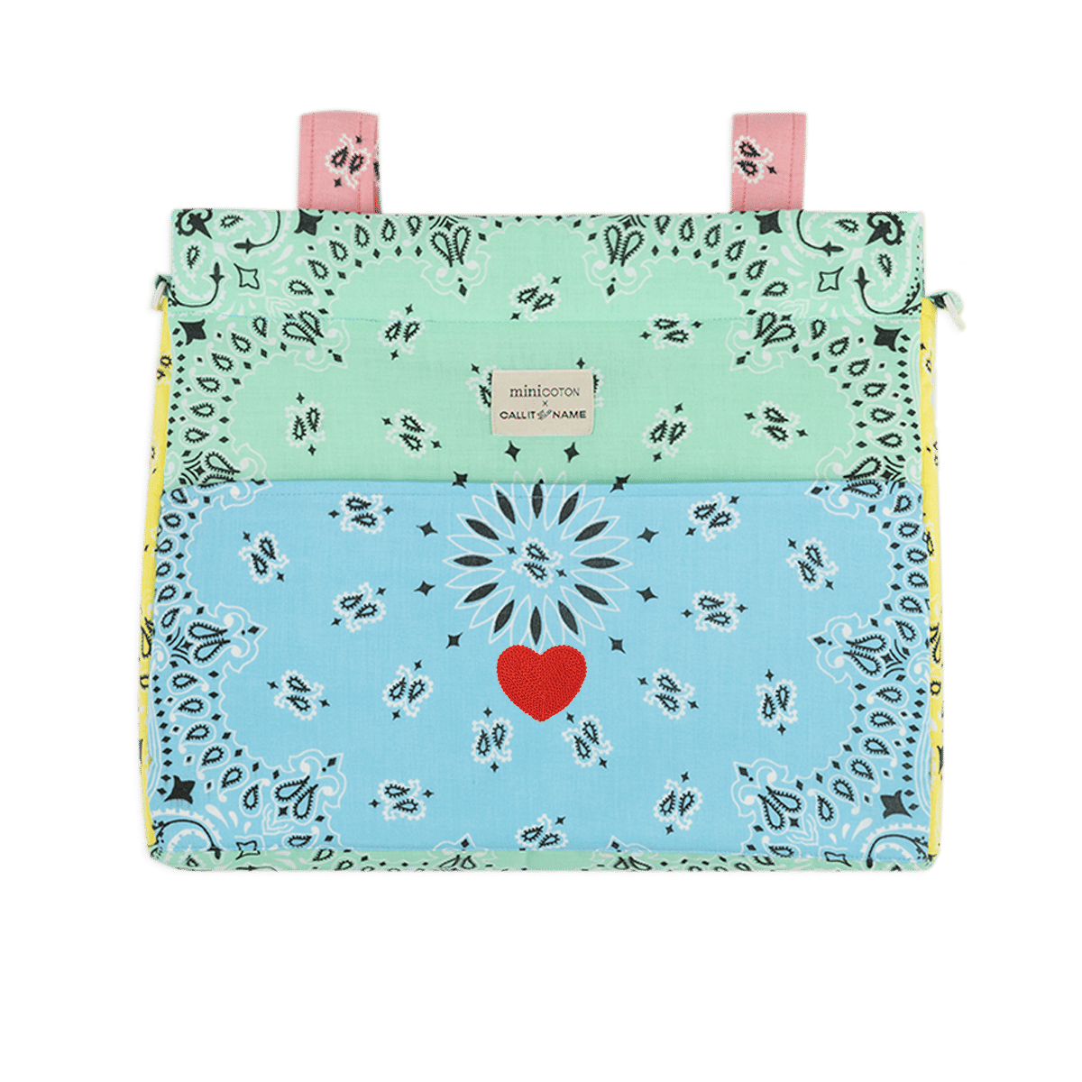 Unsere Icon Tasche für den Kinderwagen ist sehr leicht. Sie ist gepolstert, sodass die Produkte im Inneren geschützt sind. Das Innere besteht aus wasser- und schmutzabweisendem Stoff, der sich leicht mit einem feuchten Tuch reinigen lässt. Sie wird mit zwei Bändern, die mit einem Klickknopf befestigt werden, am Kinderwagen befestigt. Außerdem hat sie einen abnehmbaren Schultergurt, der ebenfalls mit einem Klickknopf verstellbar ist, um sie bequem über die Schulter oder als Umhängetasche zu tragen. Sowohl der obere Teil als auch die Vordertasche schließen mit einem Reißverschluss. Hergestellt aus Bandanas aus den USA aus 100 % Baumwolle.
