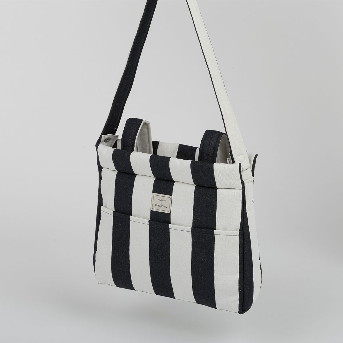 Unsere Icon-Tasche für den Kinderwagen ist sehr leicht. Sie ist gepolstert, sodass die Produkte im Inneren geschützt sind. Das Innenfutter besteht aus Frottee mit wasserdichter Rückseite, damit bei einem Flüssigkeitsauslauf diese aufsaugt und nicht durchdringt. Sie wird mit zwei Bändern, die mit Klickknöpfen befestigt werden, am Kinderwagen befestigt. Außerdem hat sie einen abnehmbaren Schultergurt, der ebenfalls mit Klickknöpfen verstellbar ist, um sie bequem über die Schulter oder als Umhängetasche zu tragen. Sowohl der obere Teil als auch die Vordertasche werden mit einem Reißverschluss geschlossen.