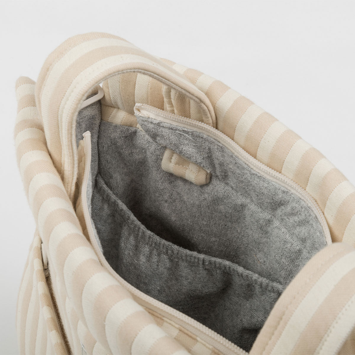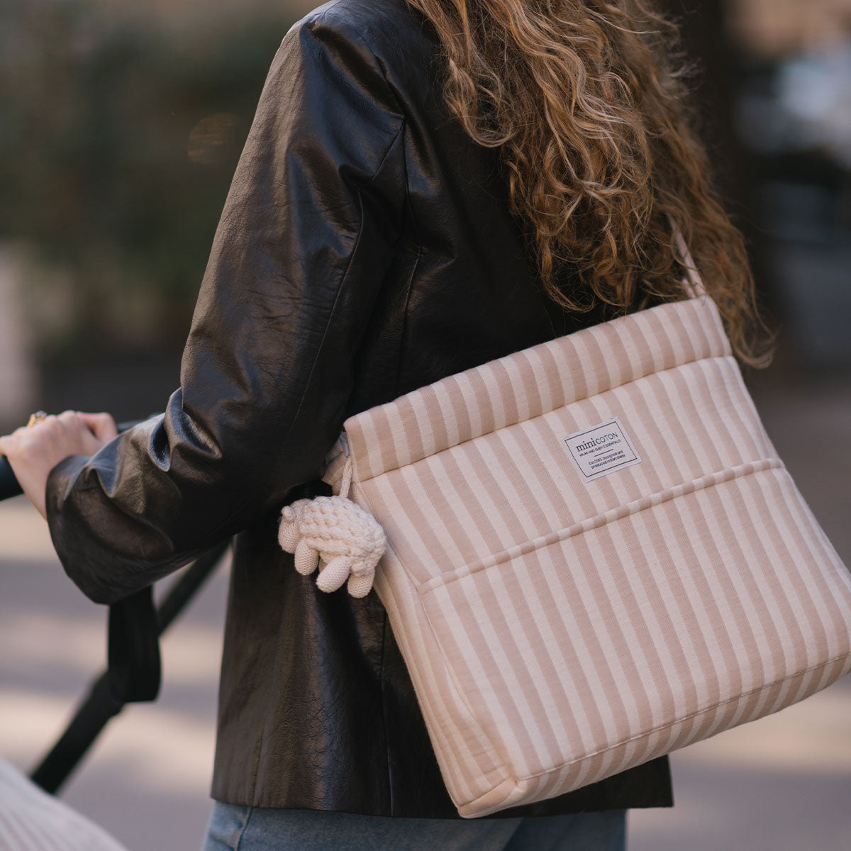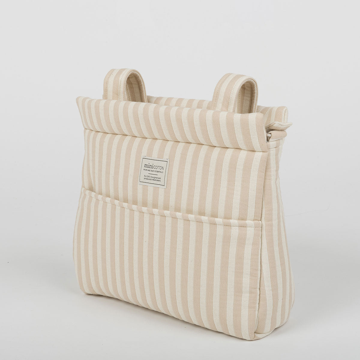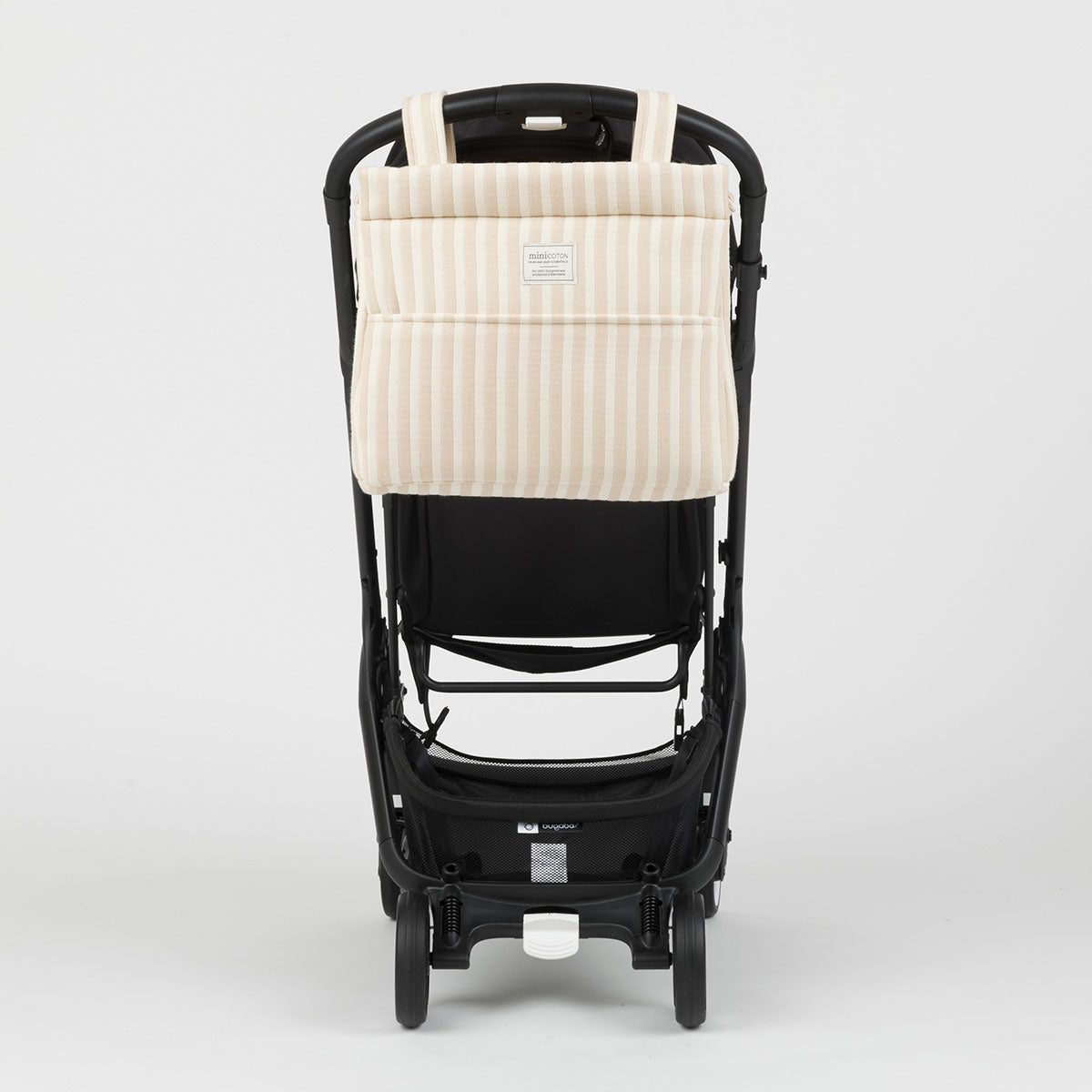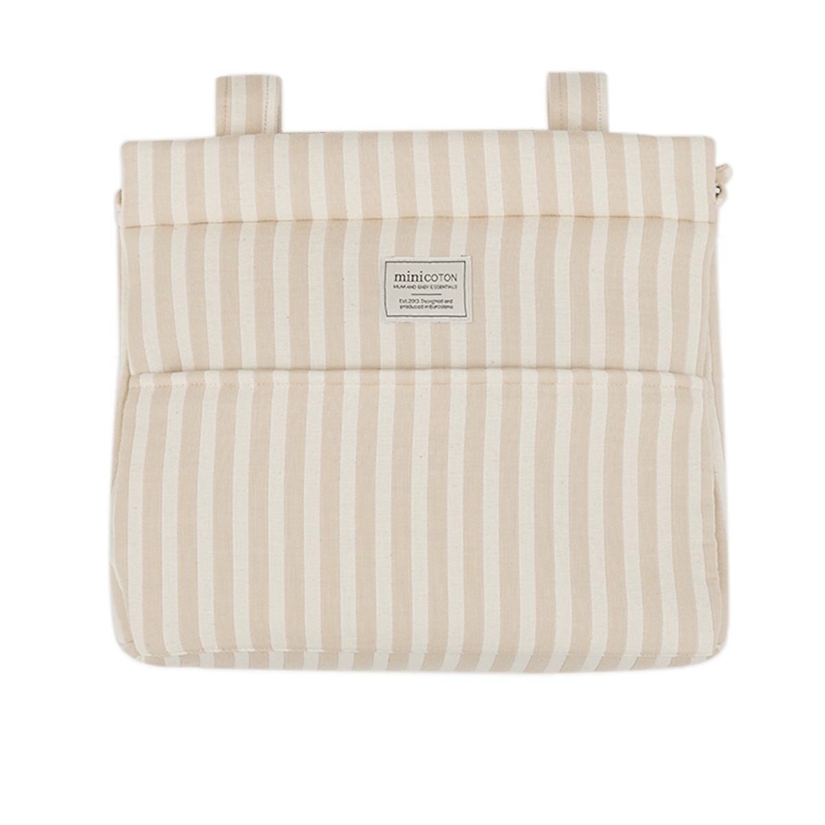 Unsere Icon Tasche für den Kinderwagen ist sehr leicht. Sie ist gepolstert, sodass die Produkte im Inneren geschützt sind. Das Innenfutter besteht aus Frottee mit wasserdichter Rückseite, damit bei einem verschütteten Flüssigkeit diese aufsaugt und nicht durchdringt. Sie wird mit zwei Bändern, die mit Klickknöpfen befestigt werden, am Kinderwagen befestigt. Außerdem hat sie einen abnehmbaren Schultergurt, der ebenfalls mit Klickknöpfen verstellbar ist, um sie bequem über die Schulter oder als Umhängetasche zu tragen. Sowohl der obere Teil als auch die Vordertasche schließen mit einem Reißverschluss.
