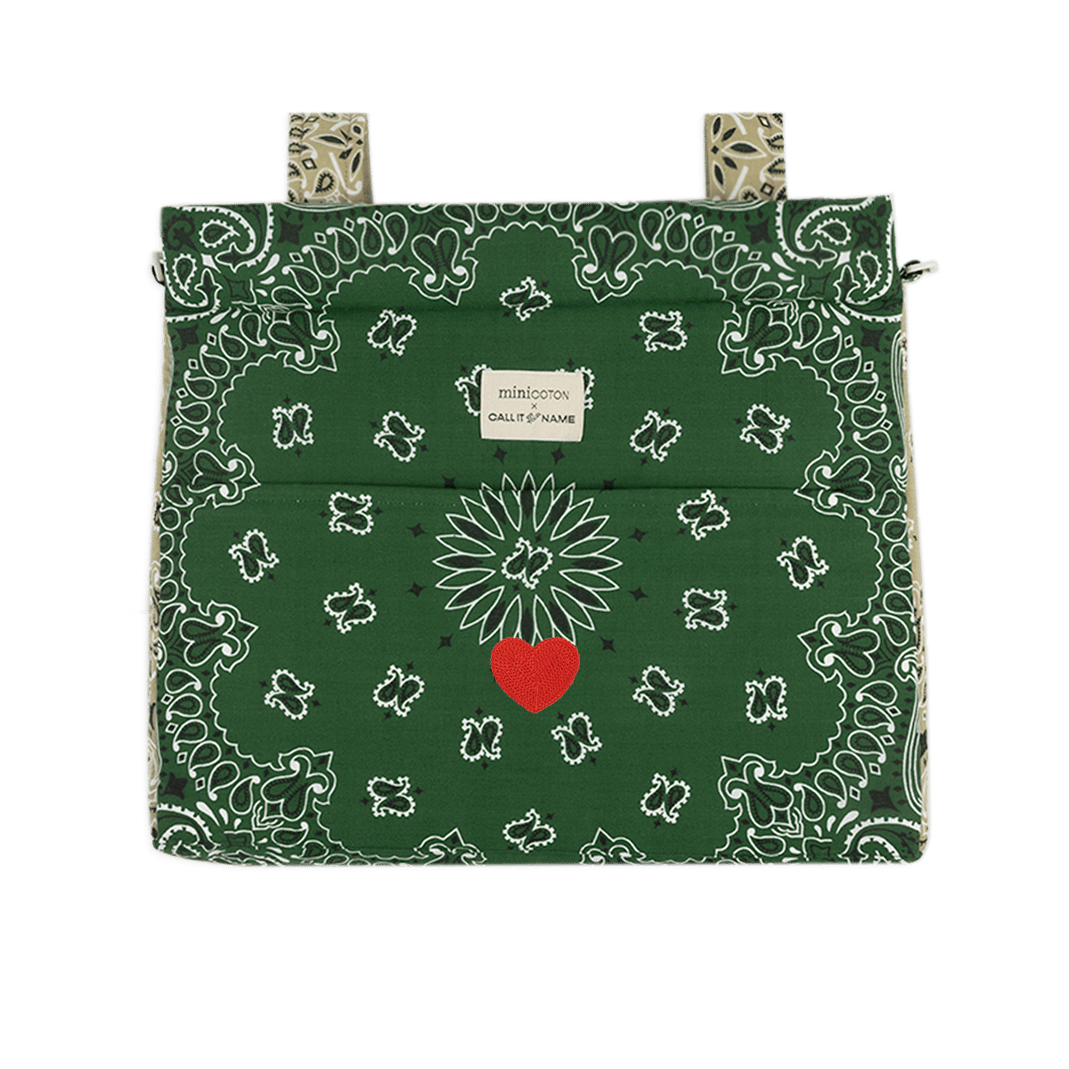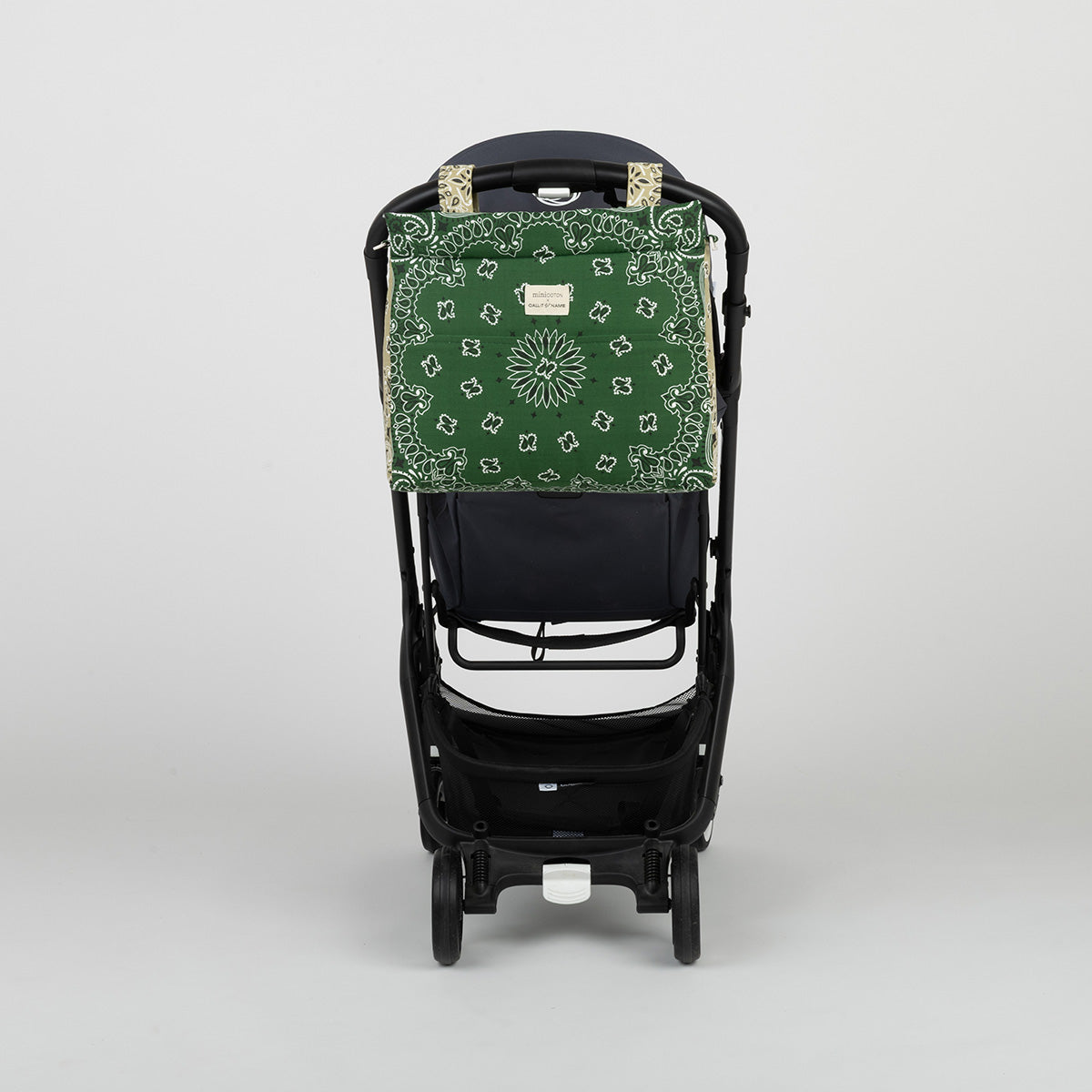 Unsere Icon Tasche für den Kinderwagen ist sehr leicht. Sie ist gepolstert, sodass die Produkte im Inneren geschützt sind. Das Innere besteht aus wasser- und schmutzabweisendem Stoff, der sich leicht mit einem feuchten Tuch reinigen lässt. Sie wird mit zwei Bändern, die mit einem Klickknopf befestigt werden, am Kinderwagen befestigt. Außerdem hat sie einen abnehmbaren Schultergurt, der ebenfalls mit einem Klickknopf verstellbar ist, um sie bequem über der Schulter oder als Umhängetasche zu tragen. Sowohl der obere Teil als auch die Vordertasche schließen mit einem Reißverschluss. Hergestellt aus Bandanas aus den USA aus 100 % Baumwolle.