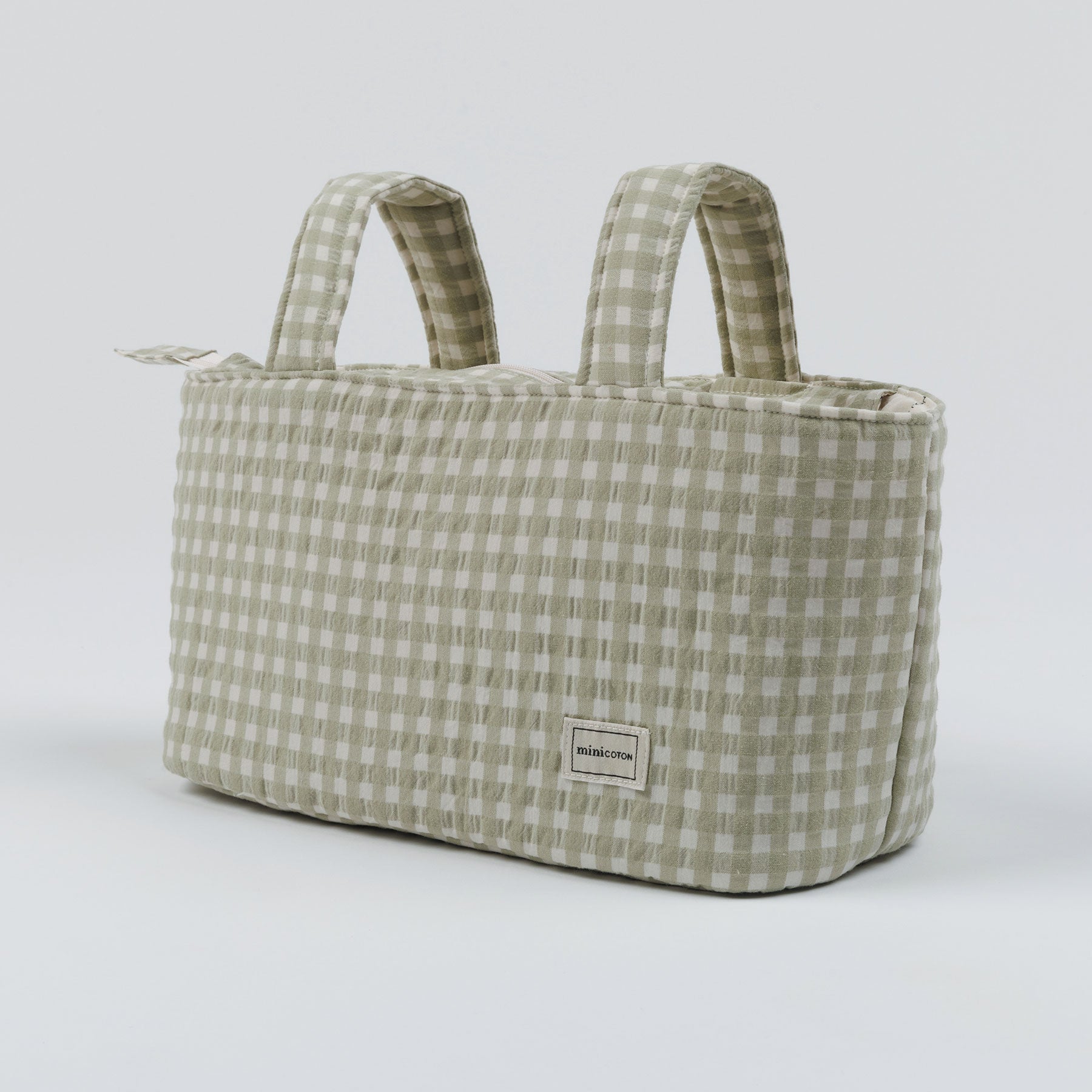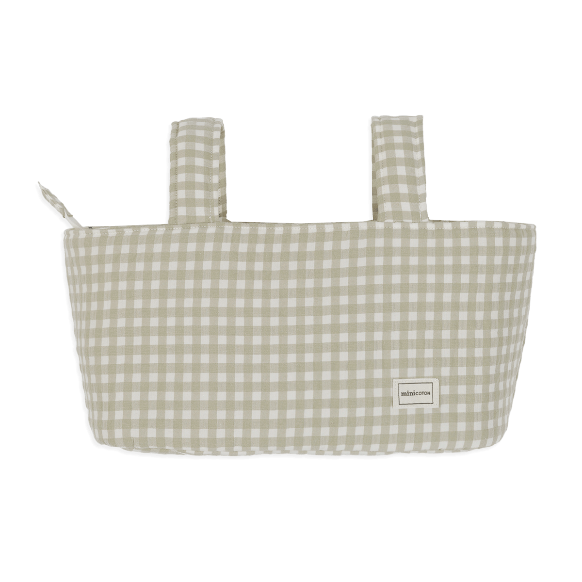 Dies ist unsere Pocket Tasche für den Kinderwagen. Sie ist sehr leicht, mit Reißverschluss und zwei Innentaschen. Sie ist gepolstert, sodass die Produkte im Inneren geschützt sind. Sie wird mit Druckknöpfen am Griff des Kinderwagens befestigt.