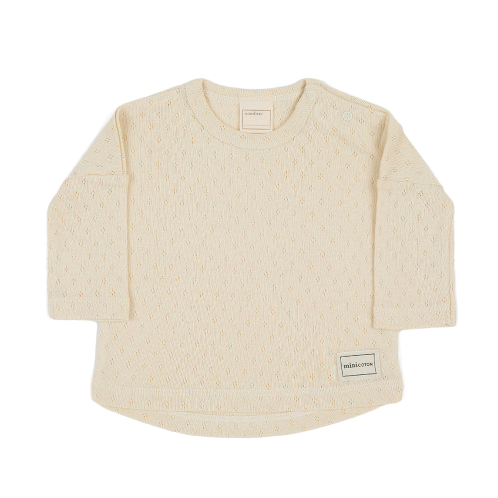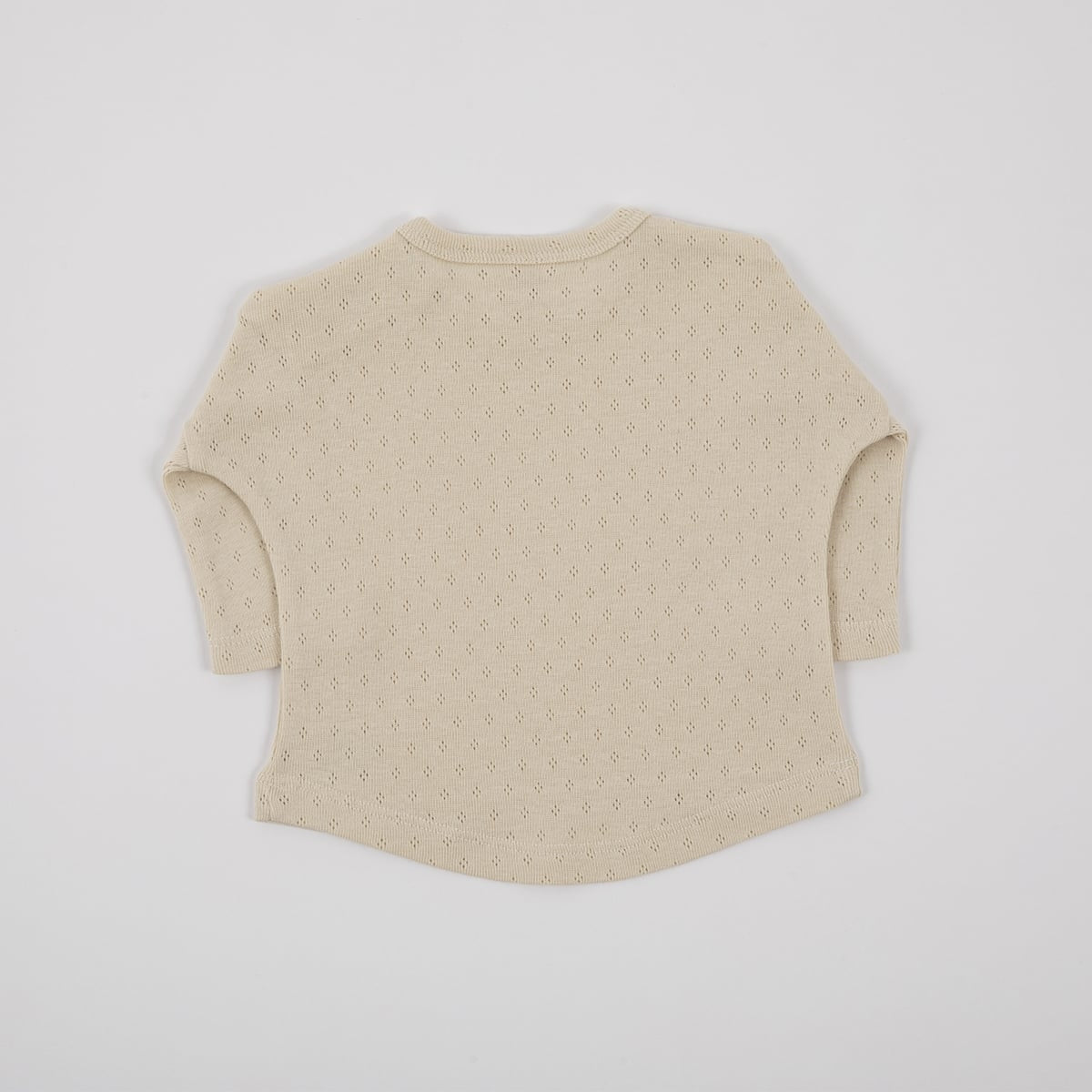 Top aus Baumwollstrickstoff holey. Es ist asymmetrisch, wobei der Rücken abgerundet und länger ist für bequeme und stylische Looks. Es wird an der Schulter mit farblich passenden Druckknöpfen geschlossen.