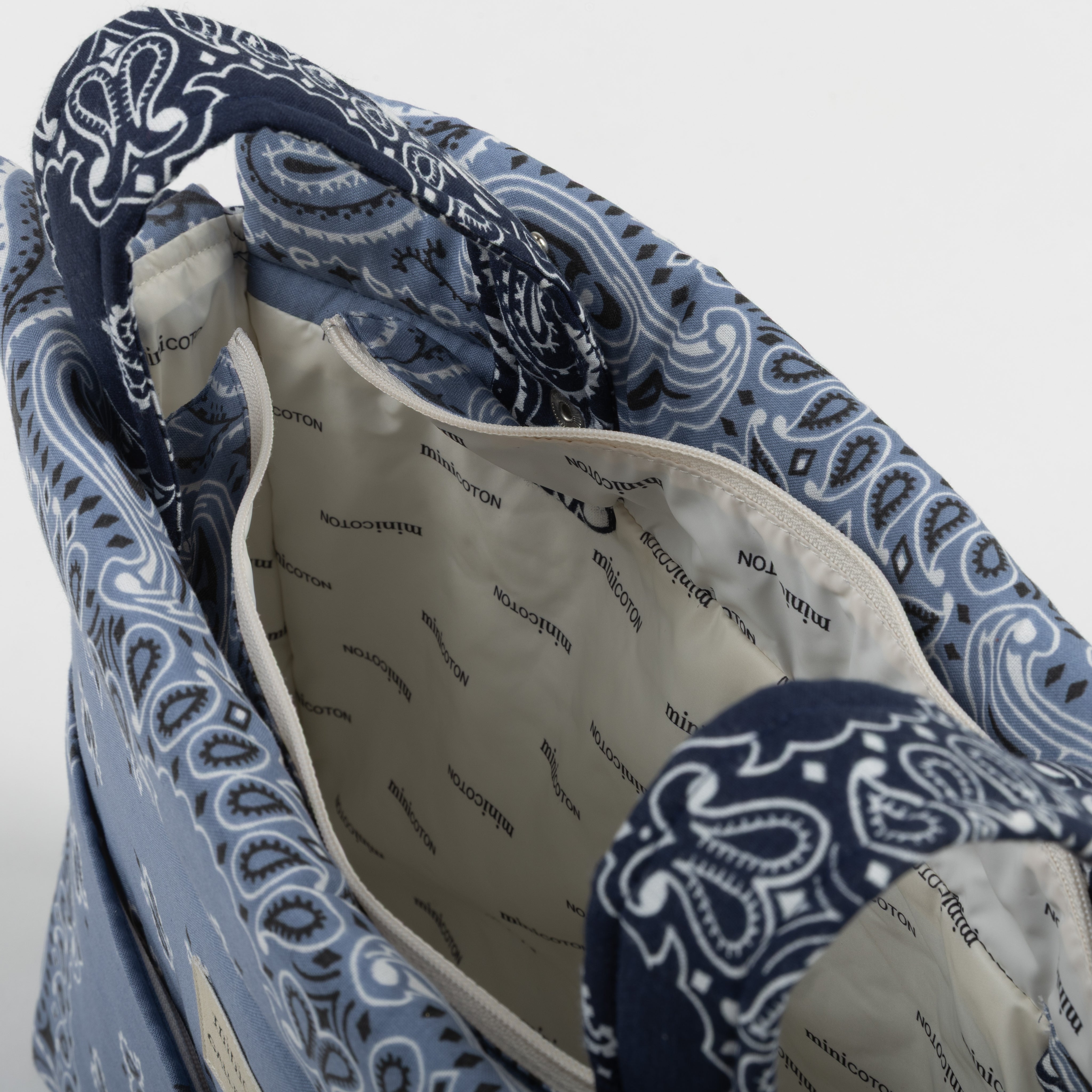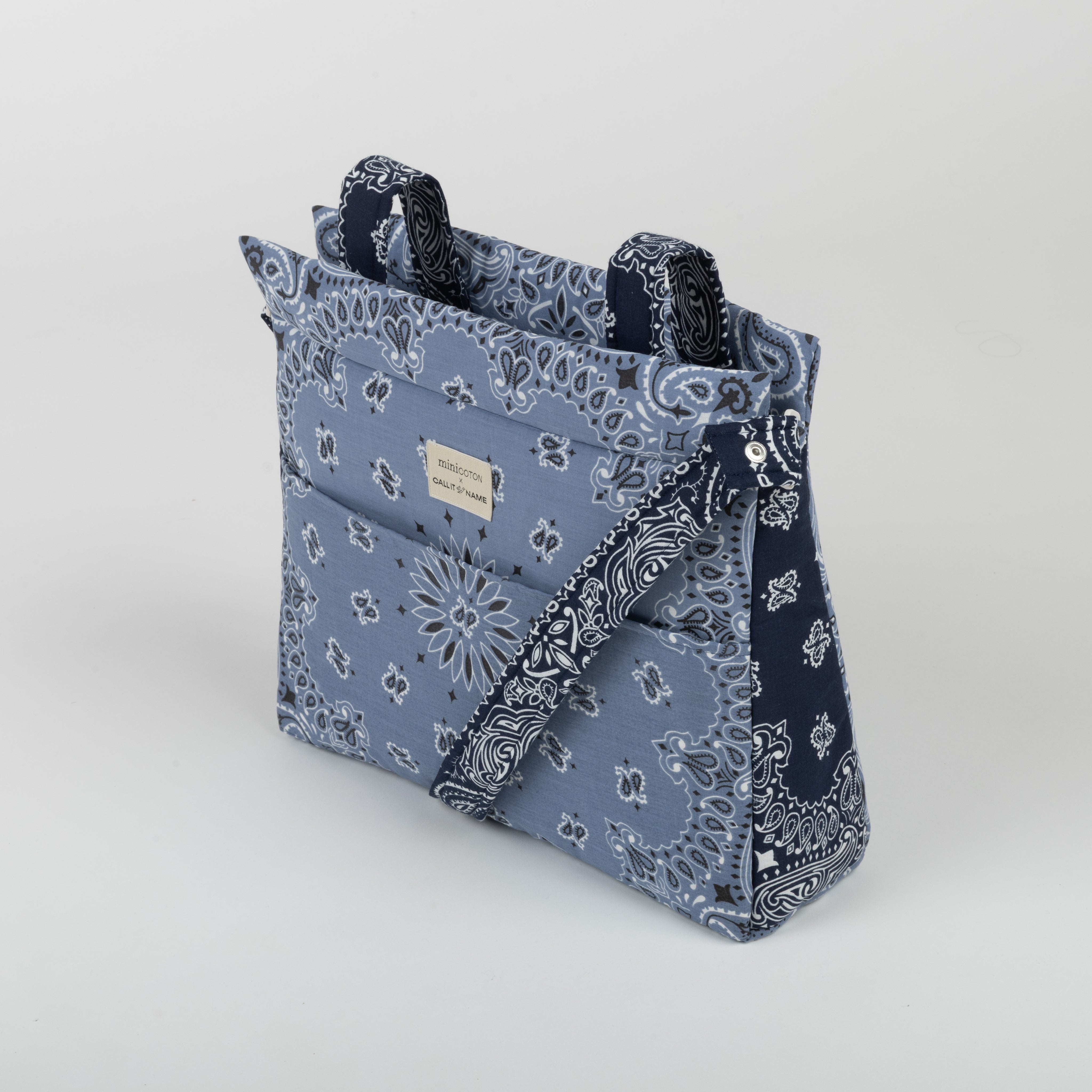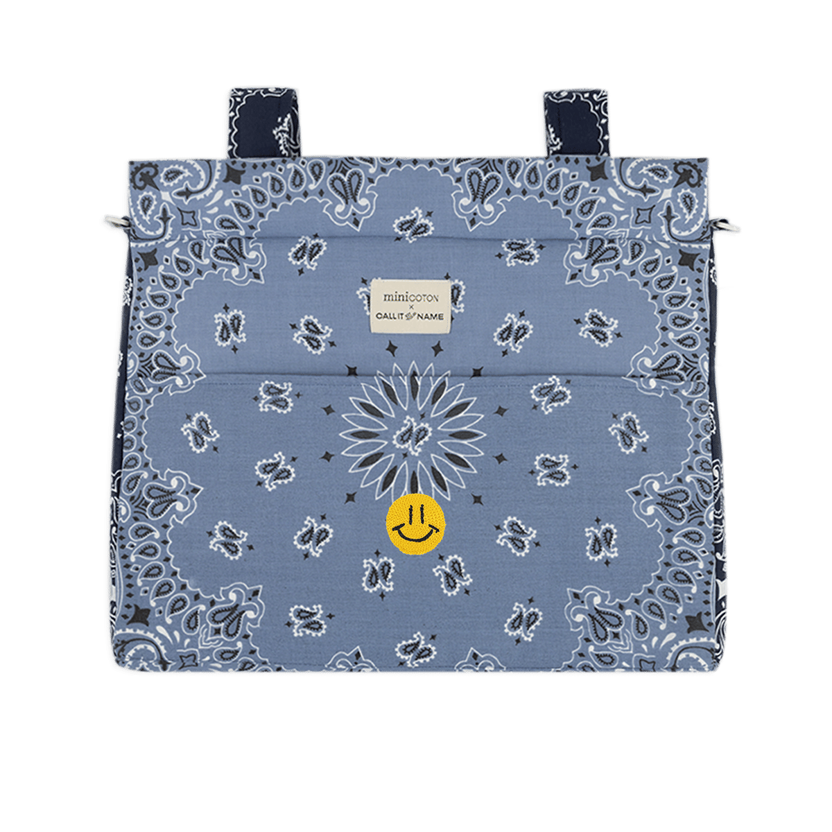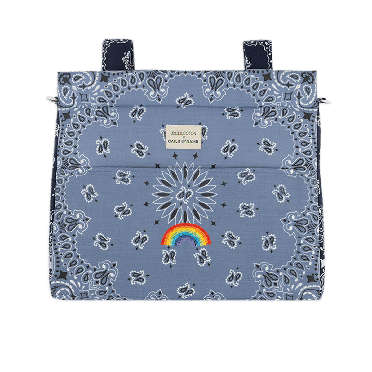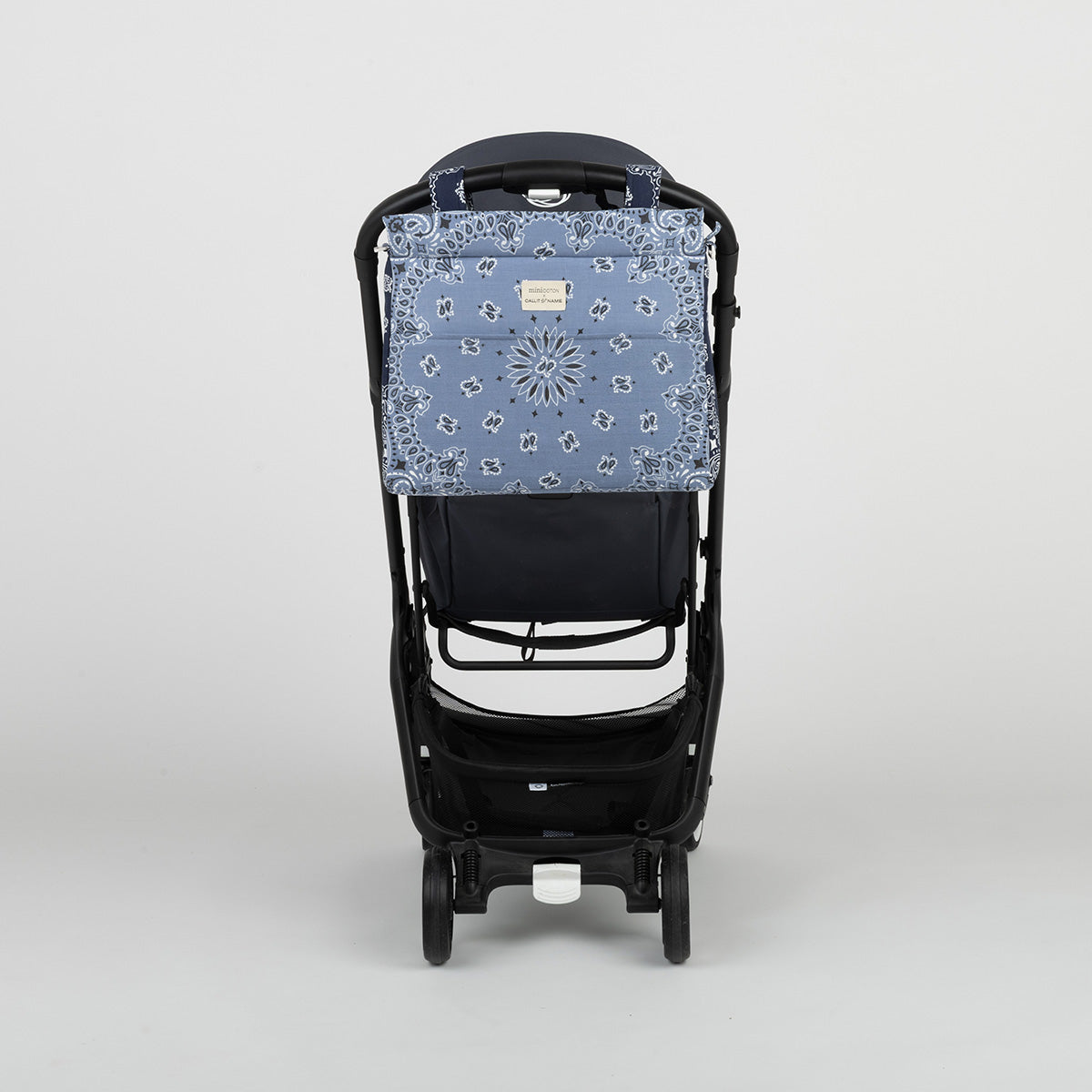 Our Icon stroller bag is very lightweight. It is padded so the products inside are protected. The interior is made of water and stain-repellent fabric, easy to clean with a damp cloth. It attaches to the stroller with two straps that fasten with a click button. It also has a removable shoulder strap, which also adjusts with a click button, to carry it comfortably on the shoulder or as a crossbody bag. It closes with a zipper on both the top and its front pocket. Made with bandanas made in the USA from 100% cotton.