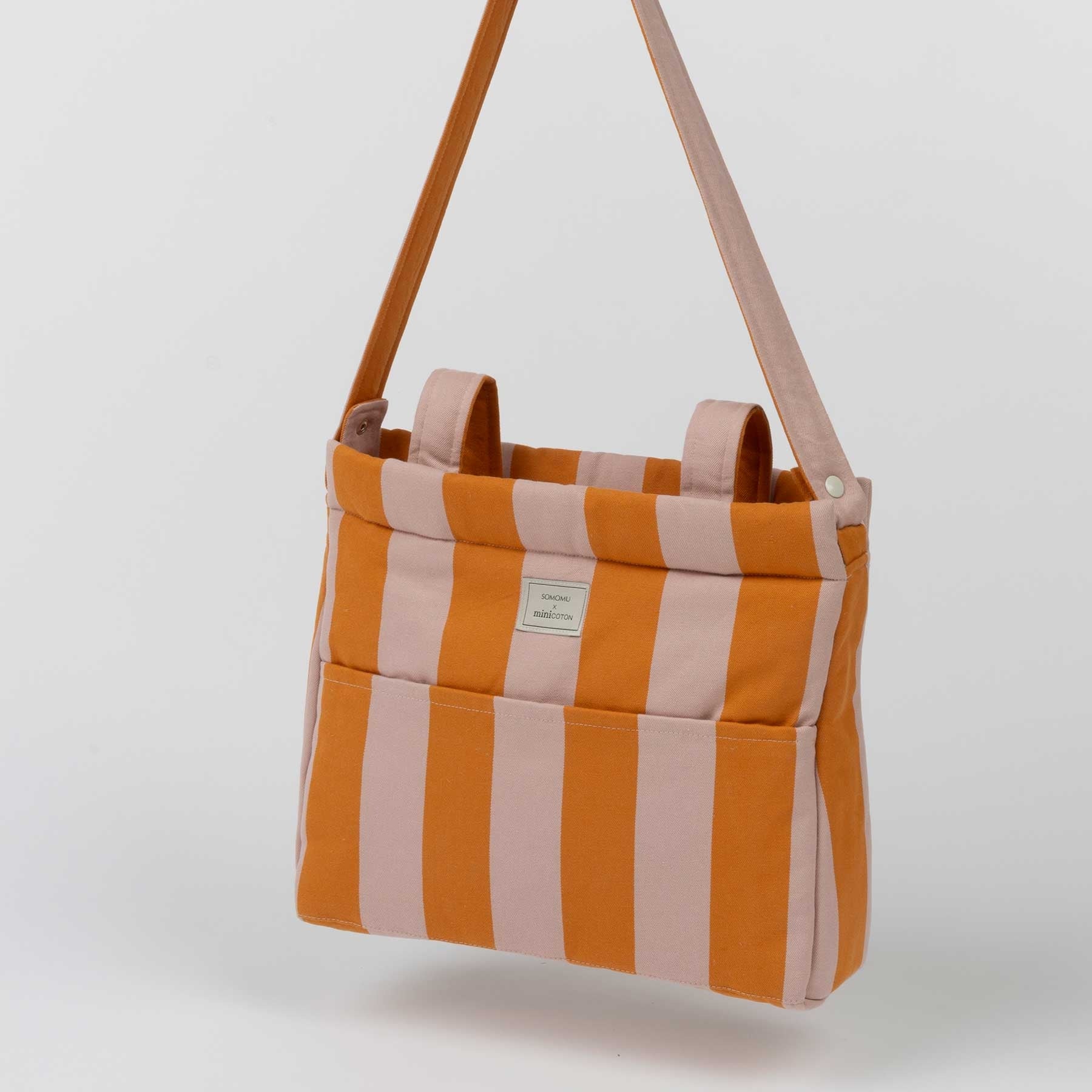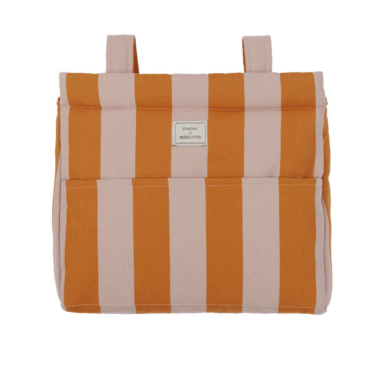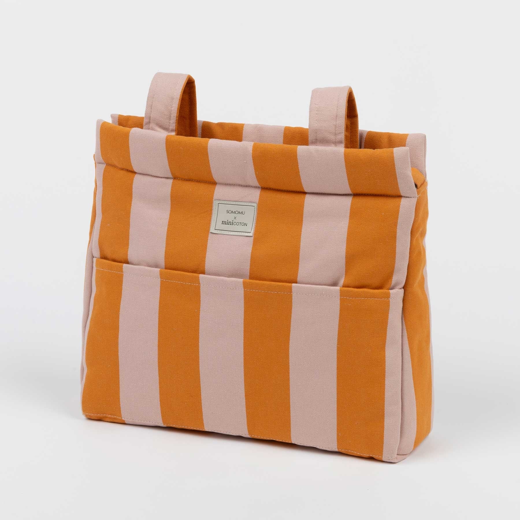 Our Icon bag for the stroller is very lightweight. It is padded so the products inside are protected. It has a terry cloth interior with a waterproof backing so that if any liquid spills, it soaks up and does not leak through. It attaches to the stroller with two straps that fasten with a click button. It also has a removable shoulder strap, which also adjusts with a click button, to carry it comfortably on the shoulder or as a crossbody bag. Both the top part and its front pocket close with a zipper.