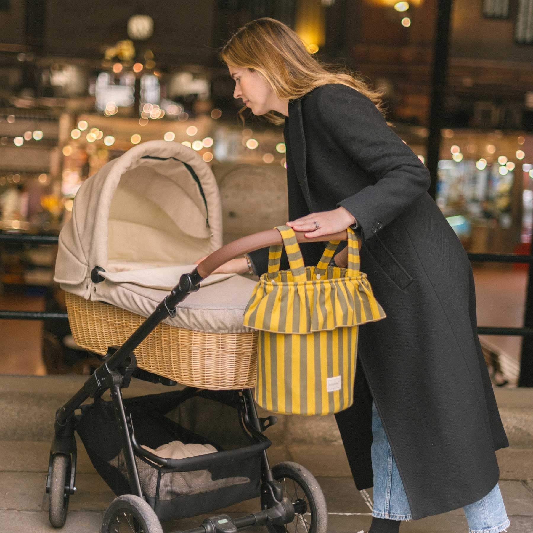 A very special bag with removable handles that take different positions to be perfect as a handbag or stroller bag. With just two clicks, your bag changes format to accompany you in the best way. It closes very practically with its cords at the top, like a snack bag. It has great capacity and its interior is made of water-repellent fabric. The exterior is 100% cotton.