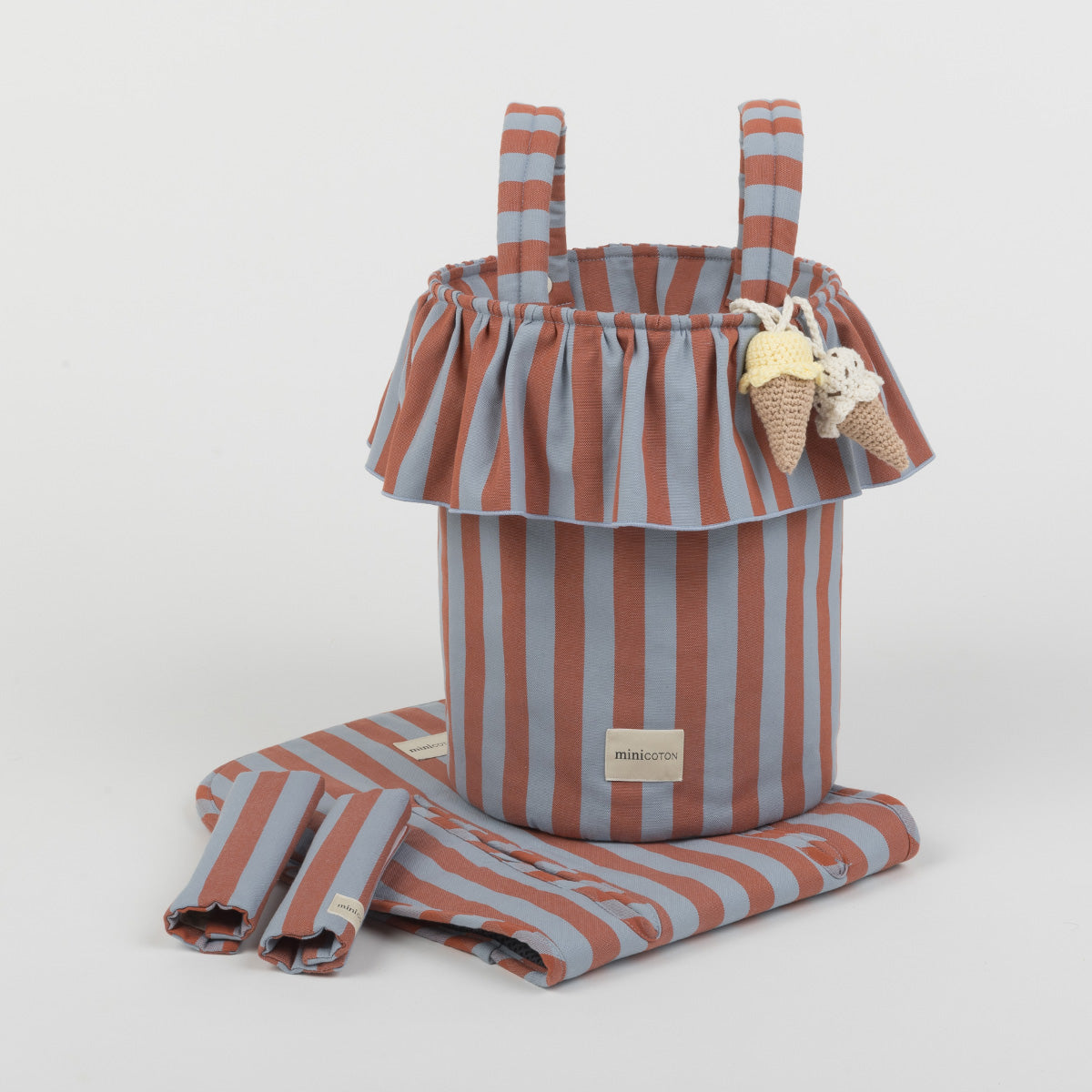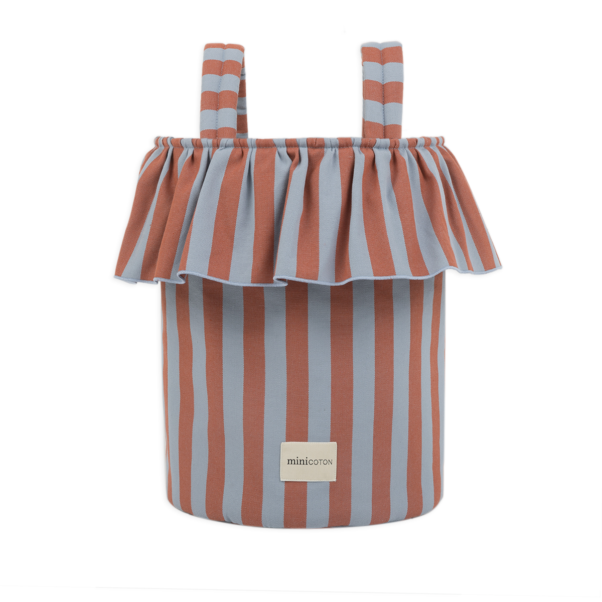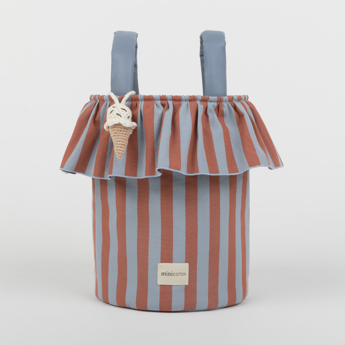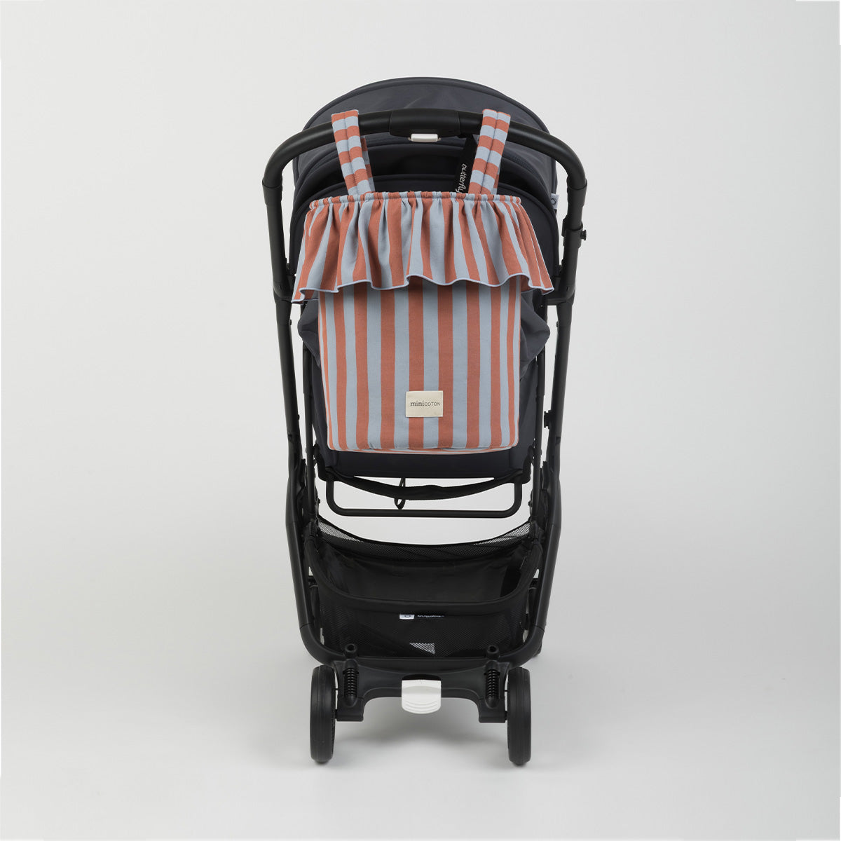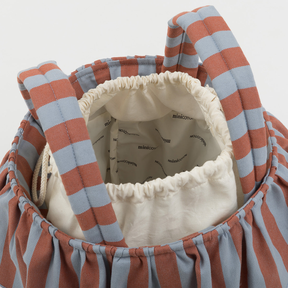 A very special bag because of its removable handles, which can be positioned differently to make it perfect as a handbag or stroller bag. With just two clicks, your bag changes format to accompany you in the best way. It closes very practically with its cords at the top, like a snack bag. It has great capacity and its interior is made of water-repellent fabric. The exterior is 100% cotton.