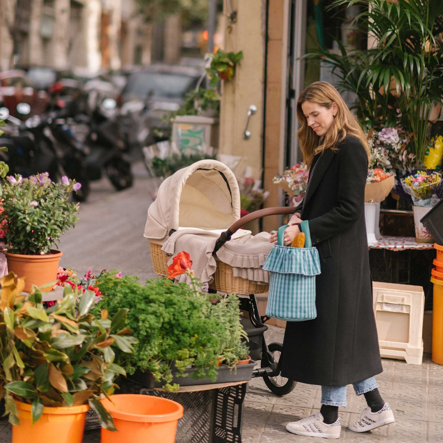 A very special bag because of its removable handles, which can be positioned differently to make it perfect as a handbag or stroller bag. With just two clicks, your bag changes shape to accompany you in the best way. It closes very practically with its cords at the top, like a snack bag. It has great capacity and its interior is made of water-repellent fabric. Outer fabric 100% cotton.