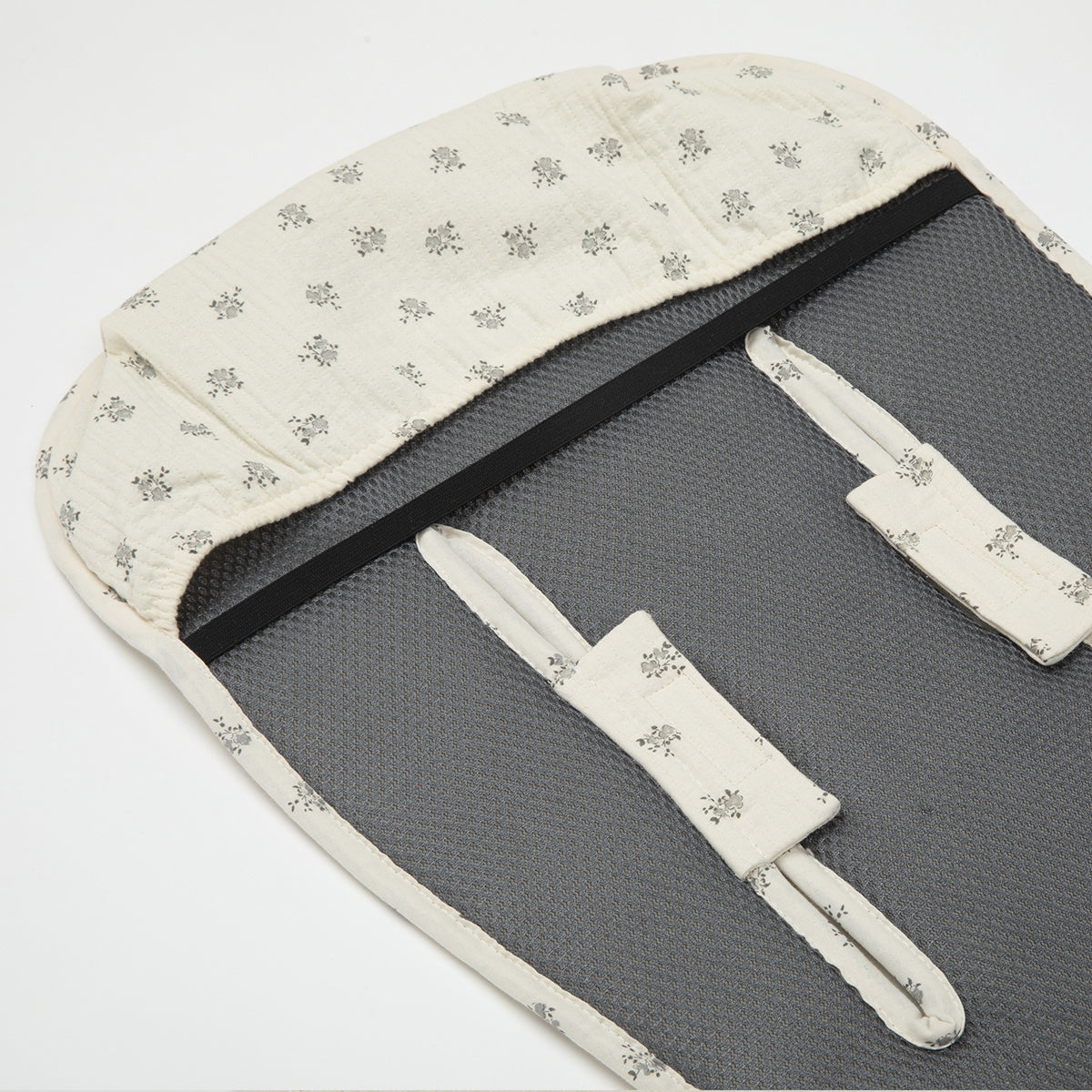 100% Gots and Oeko tex 100 organic cotton. The back in 3D technical fabric makes it very breathable, as well as making the seat more comfortable. It can be washed with cold water and neutral liquid soap on a delicate cycle. Measurements: 84 x 36 cm