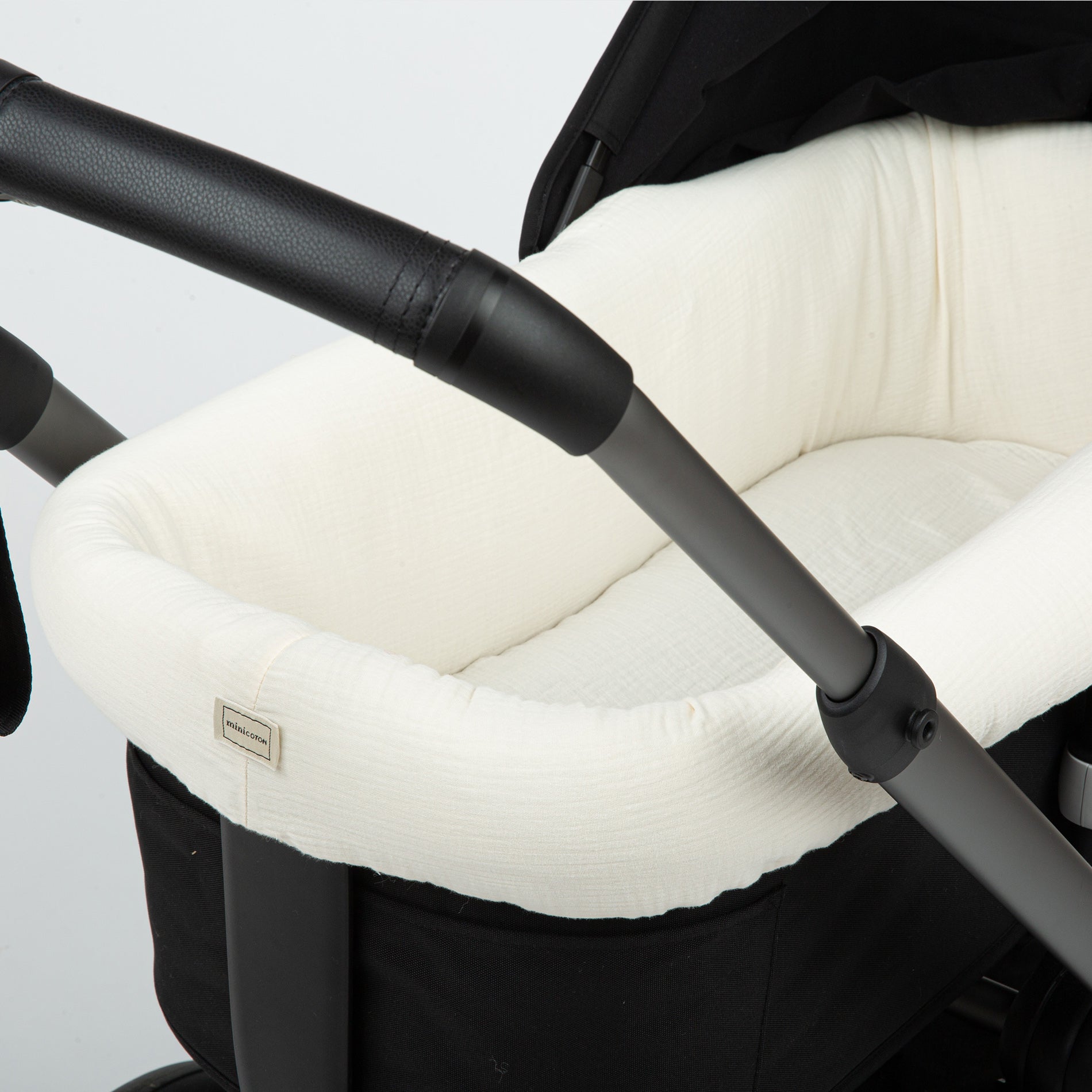This is our carrycot cover for the Bugaboo Fox, Cameleon, and Donkey. Minimal, just as we like it. It fits integrated into the carrycot and adapts both with and without the footmuff cover, thanks to its side straps and elastic edge. It covers the entire carrycot and is placed under the mattress, so we recommend purchasing the fitted sheet to match (or by combining colors and patterns) to ensure the entire interior is dressed. To finish dressing the carrycot, the oval sleeping bag, a swaddle, or a muslin cloth is ideal… depending on your needs. Fabric made of 100% organic cotton gauze with Gots and Oeko-tex® certification