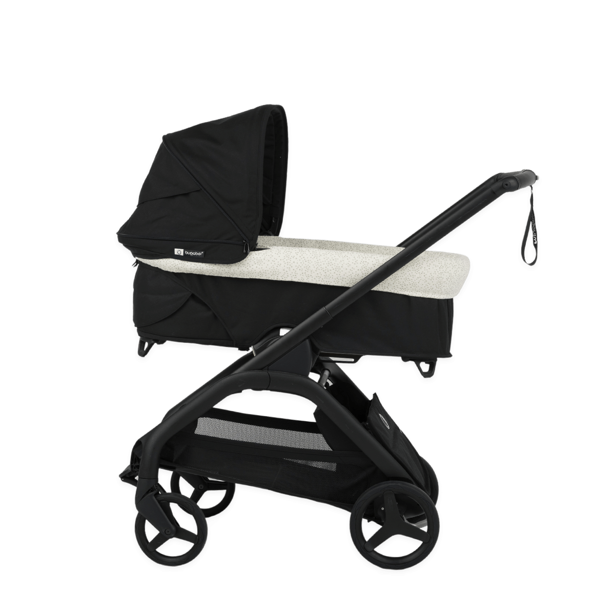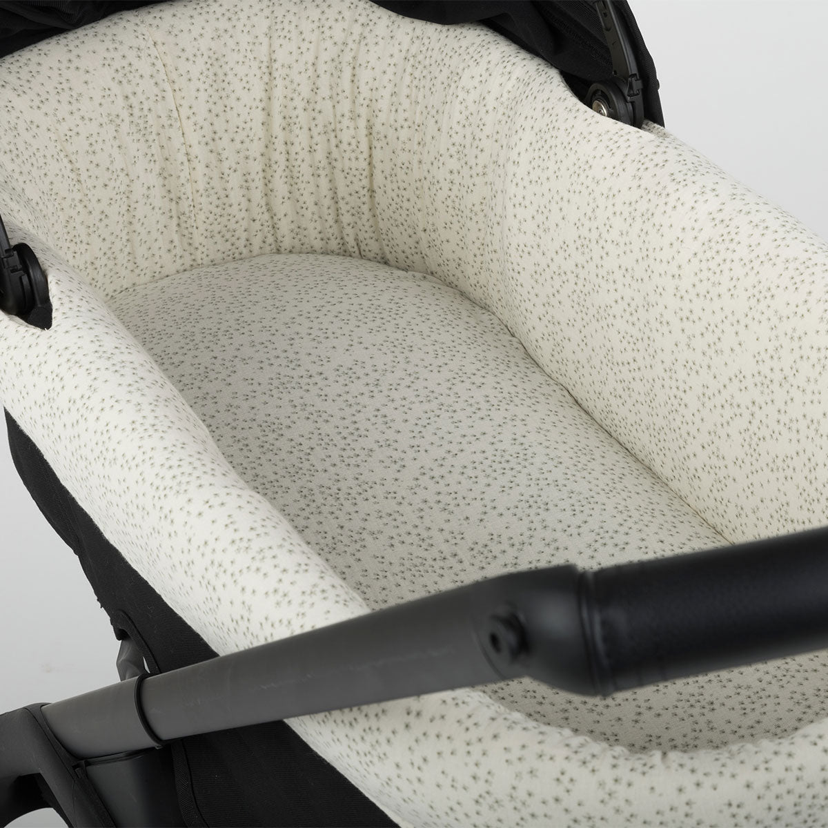 This is our carrycot cover for Bugaboo Dragonfly. Minimal, just the way we like it. It fits seamlessly into the carrycot and adapts both with and without the footmuff cover, thanks to its elastic edge. It covers the entire carrycot and is placed under the mattress, so we recommend purchasing the matching fitted sheet to ensure the entire interior is dressed. It is available in different colors and prints. To complete the carrycot's look, the oval sleeping bag, a swaddle, or a muslin cloth are ideal... depending on your needs.