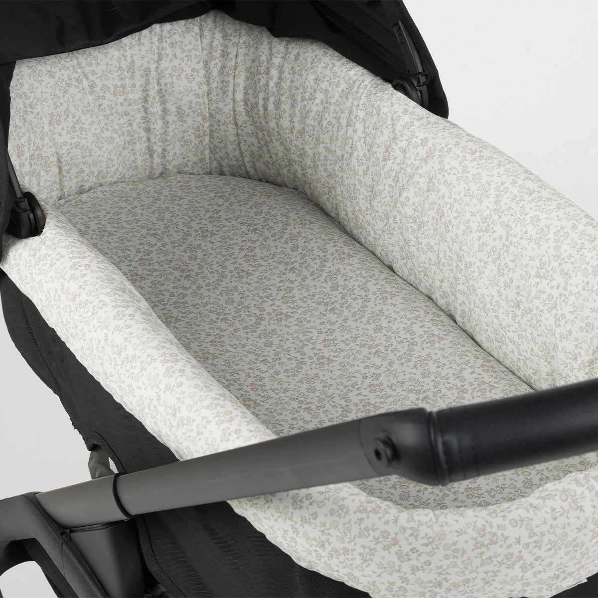 This is our carrycot cover for Bugaboo Dragonfly. Minimal, just the way we like it. It fits seamlessly into the carrycot and adapts both with and without the footmuff cover, thanks to its elastic edge. It covers the entire carrycot and is placed under the mattress, so we recommend purchasing the matching fitted sheet to ensure the entire interior is dressed. It is available in different colors and patterns. To complete the carrycot's look, the oval sleeping bag, a swaddle, or a muslin cloth are ideal... depending on your needs.