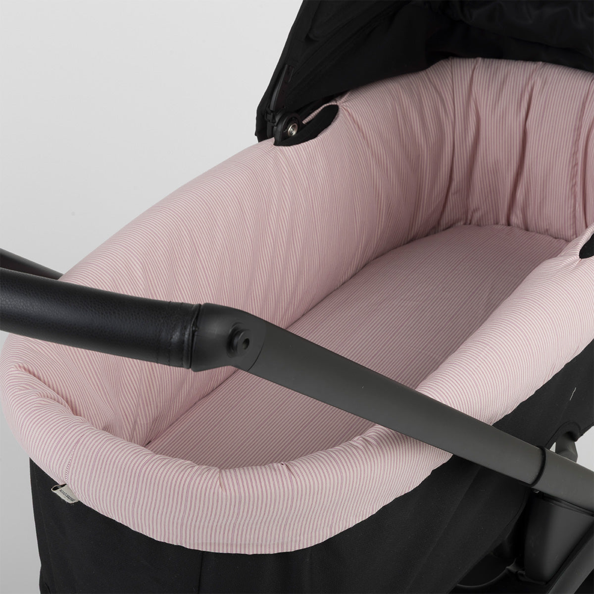 It fits integrated into the carrycot and adapts both with and without the foot cover, thanks to its elastic edge. It covers the entire carrycot and is placed under the mattress, so we recommend purchasing the matching fitted sheet to ensure the entire interior is dressed. It is available in different colors and patterns.