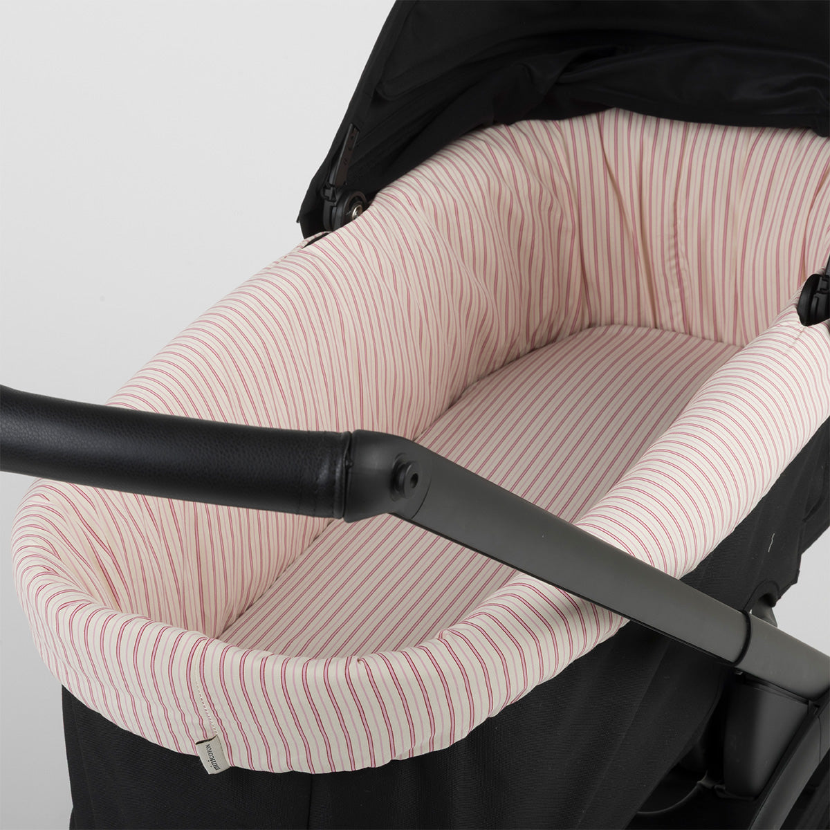 It fits integrated into the carrycot and adapts both with and without the foot cover, thanks to its elastic edge. It covers the entire carrycot and is placed under the mattress, so we recommend purchasing the matching fitted sheet to ensure the entire interior is dressed. It is available in different colors and prints.