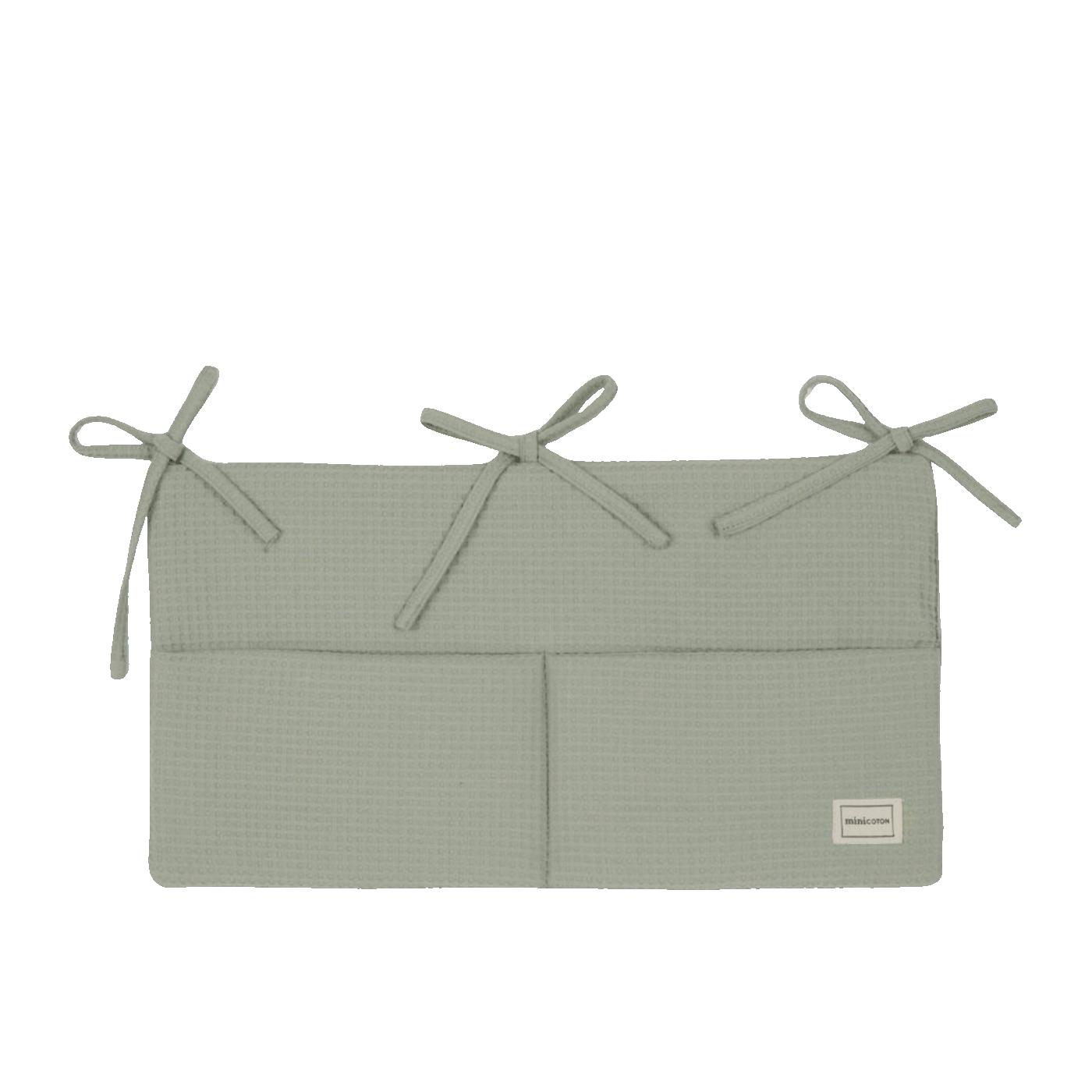 Organizer for cribs. It ties to the crib with three little ribbons. The two pockets will allow you to have your baby's little things at hand: pacifiers, diapers, pajamas… Measurements: 46 x 24 cm.