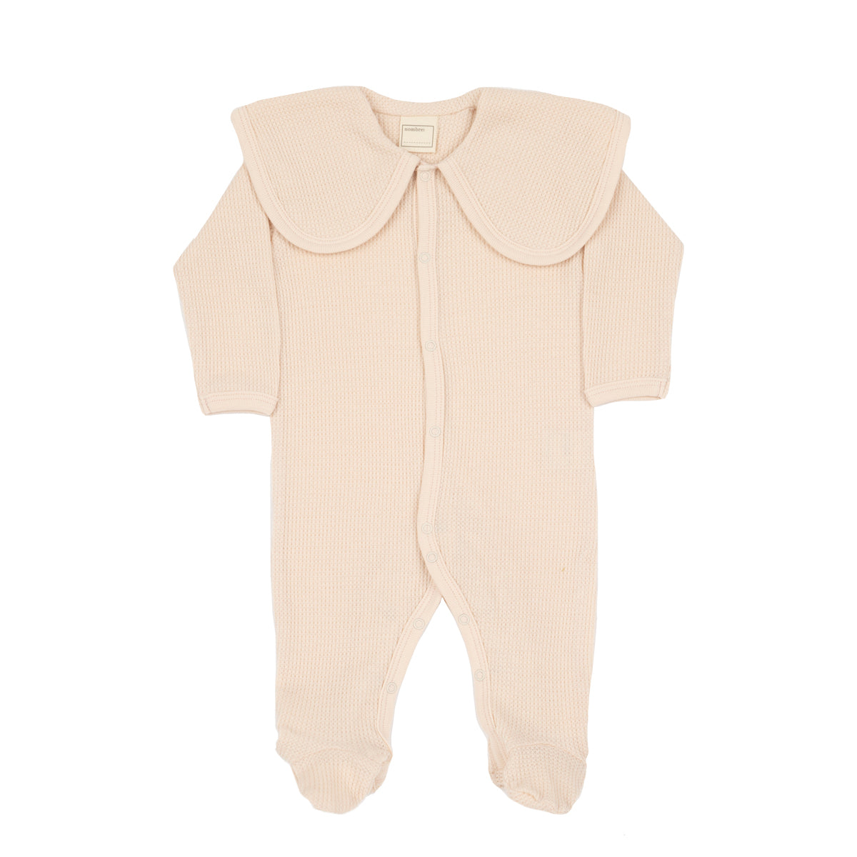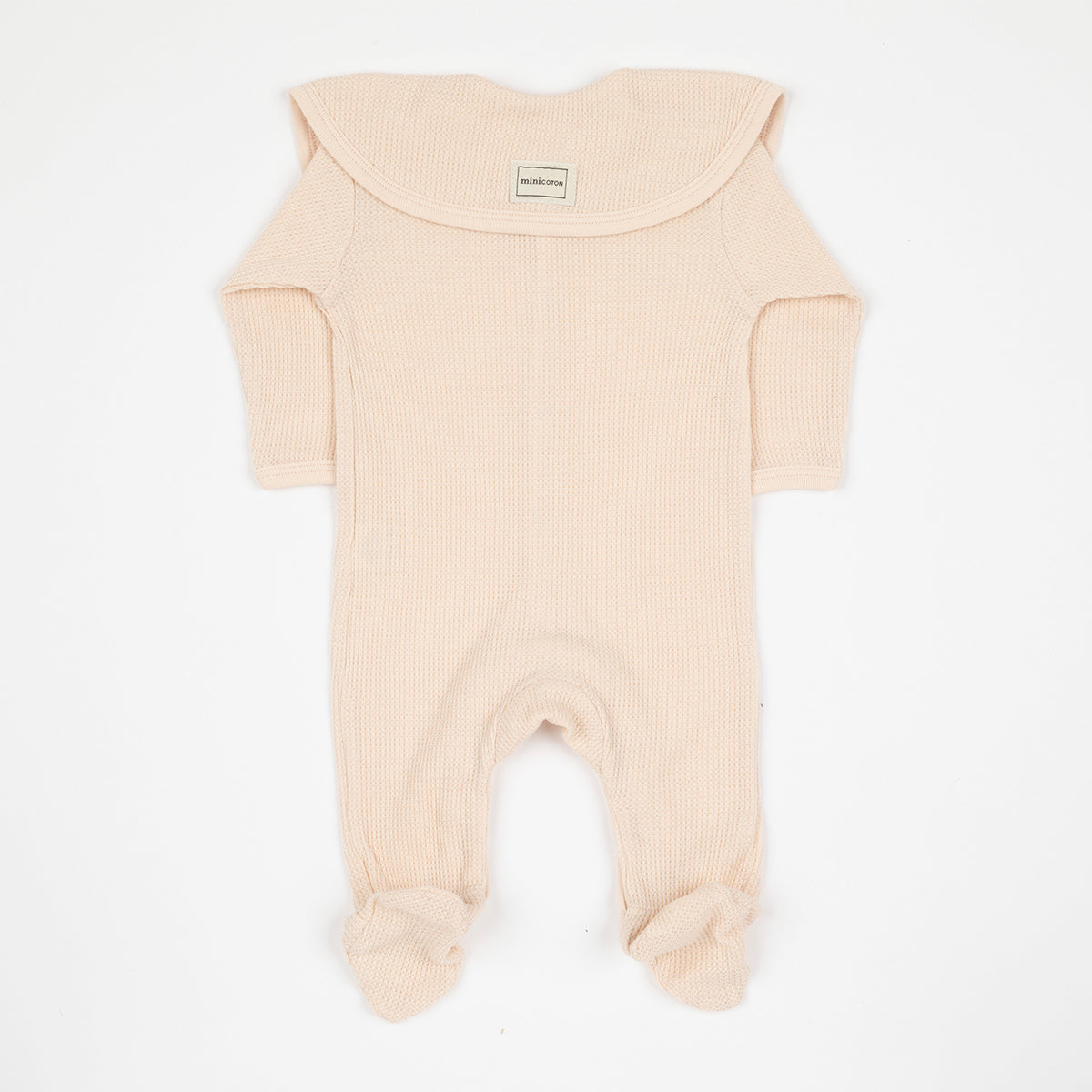Jumpsuit with collar. It fastens with tone-on-tone snap buttons and opens completely to make dressing and undressing the baby very practical without discomfort. Made of cotton knit with Lula texture. One size 0-3 months.