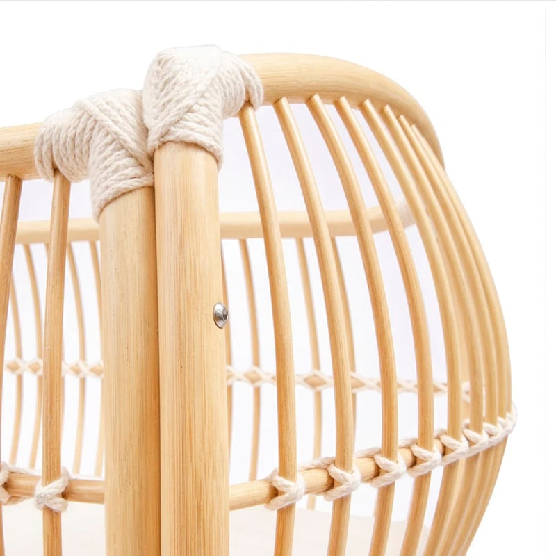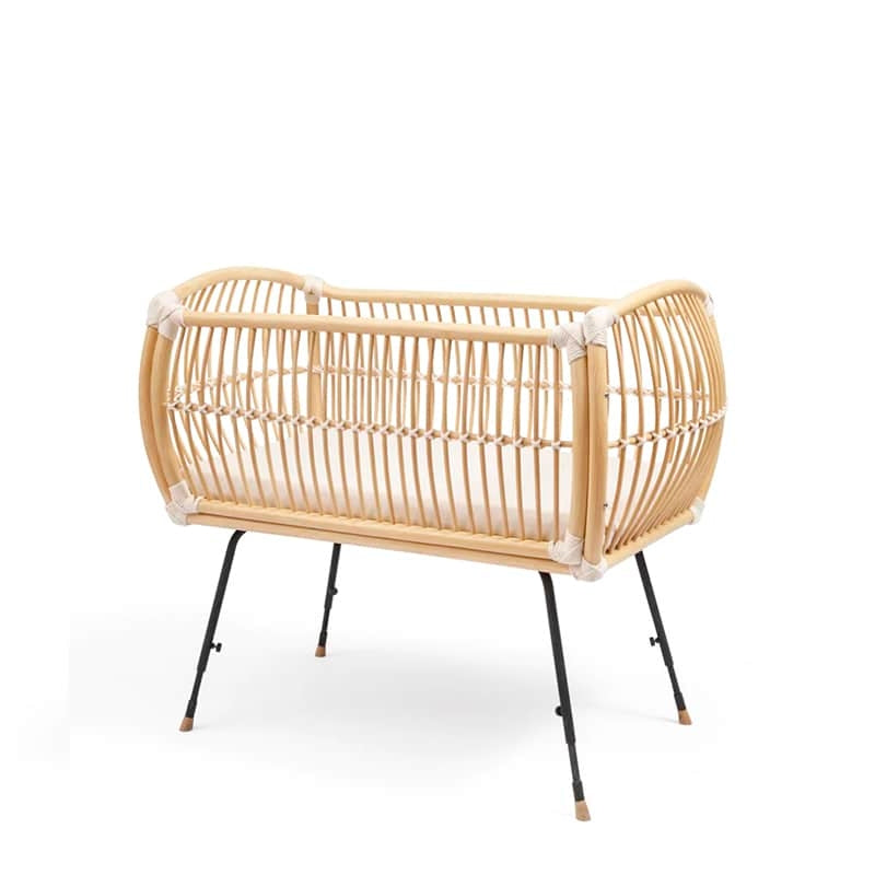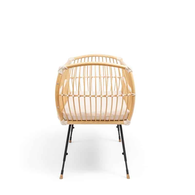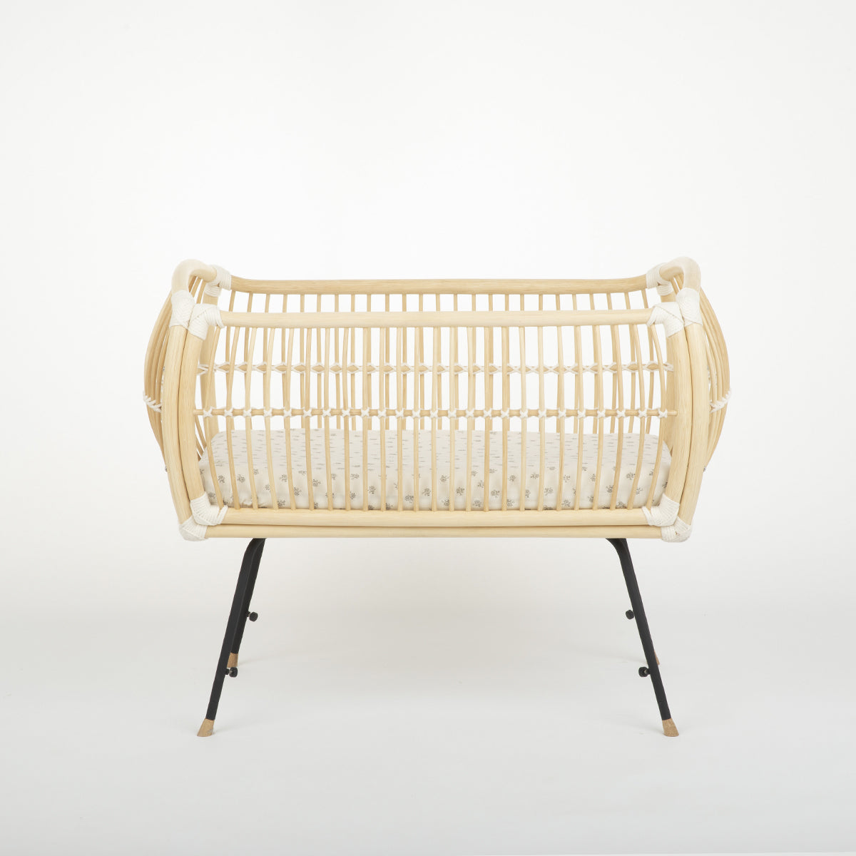 This Bermbach® mini crib can also be used for co-sleeping. It is ideal for newborns up to six months. It is made of hand-woven rattan and cotton rope. With steel legs and mango wood bases for good stability, plus its legs are adjustable to the height of the parents' bed. The mattress is eco-friendly, with a coconut core covered in cotton and natural latex with a cover of organic virgin wool (500 gr/m2, Oko Tex® Standard 100) with KBA certification. Additionally, this mattress is moisture-resistant due to its properties.
