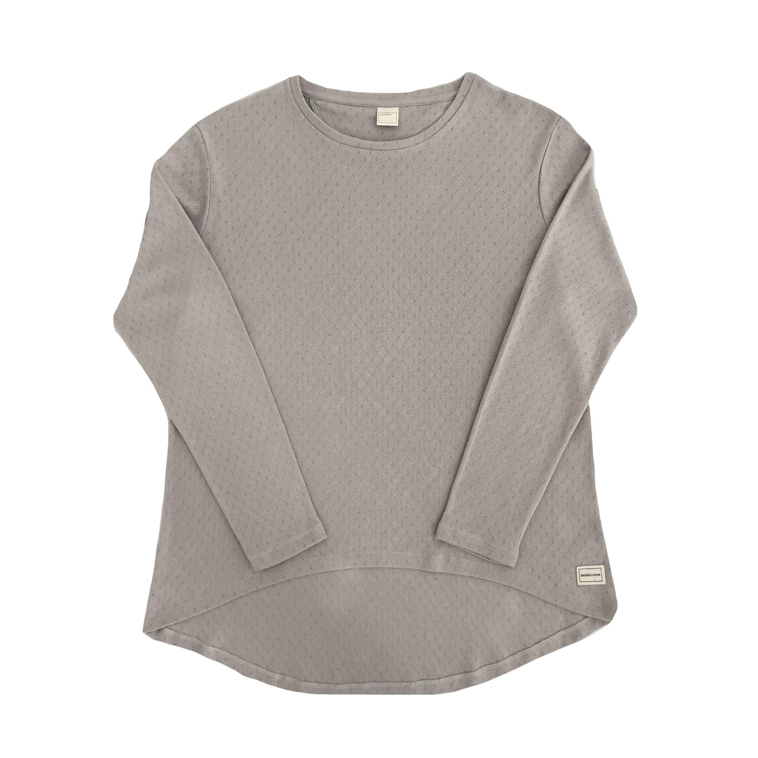 To match the little ones at home. A sweatshirt with a stylish cut, longer at the back, dropped armholes, and long sleeves. In terry texture. Available in the four colors of the collection: Crudo, Rosa, Nube, and Musgo.
