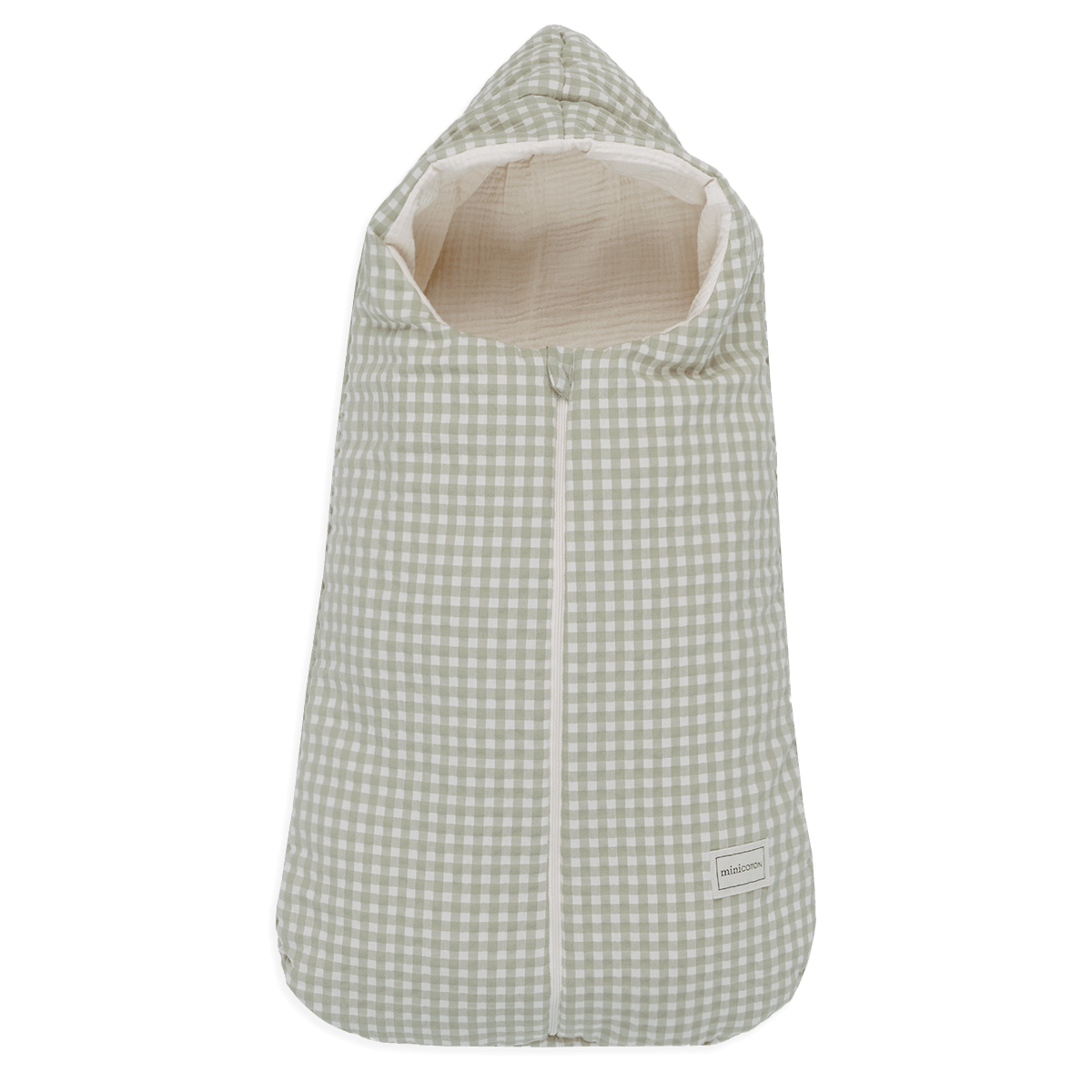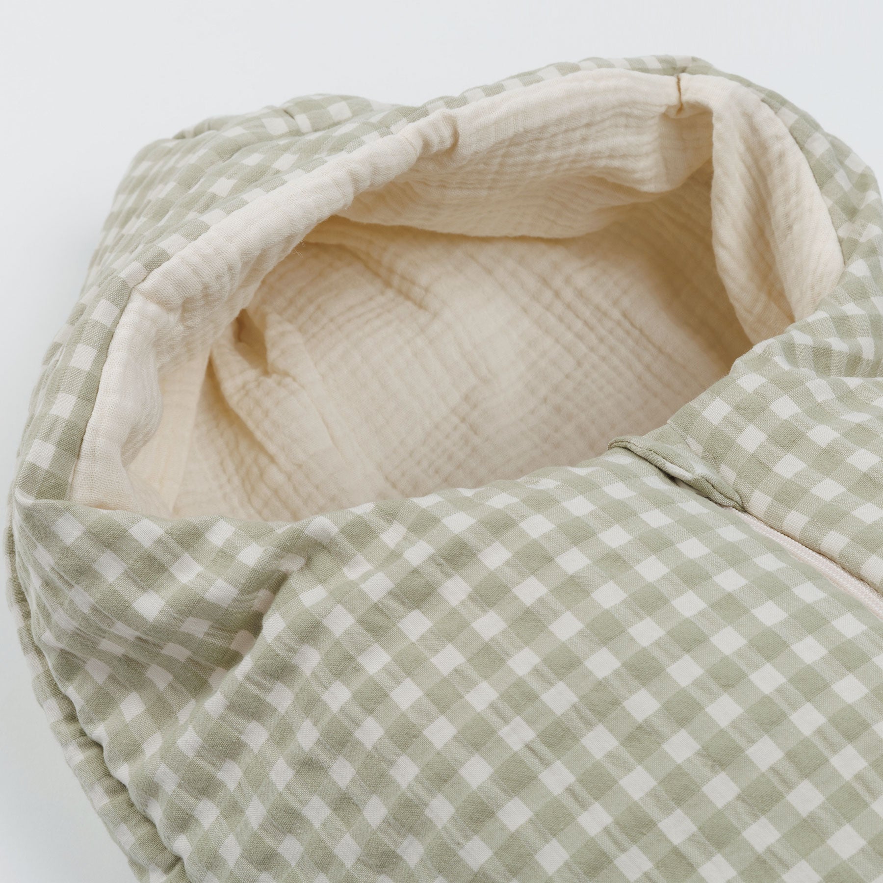 The oval sleeping bag is round and creates well-being for the baby, as it protects them from the wind and isolates them from noise by keeping their little head protected.