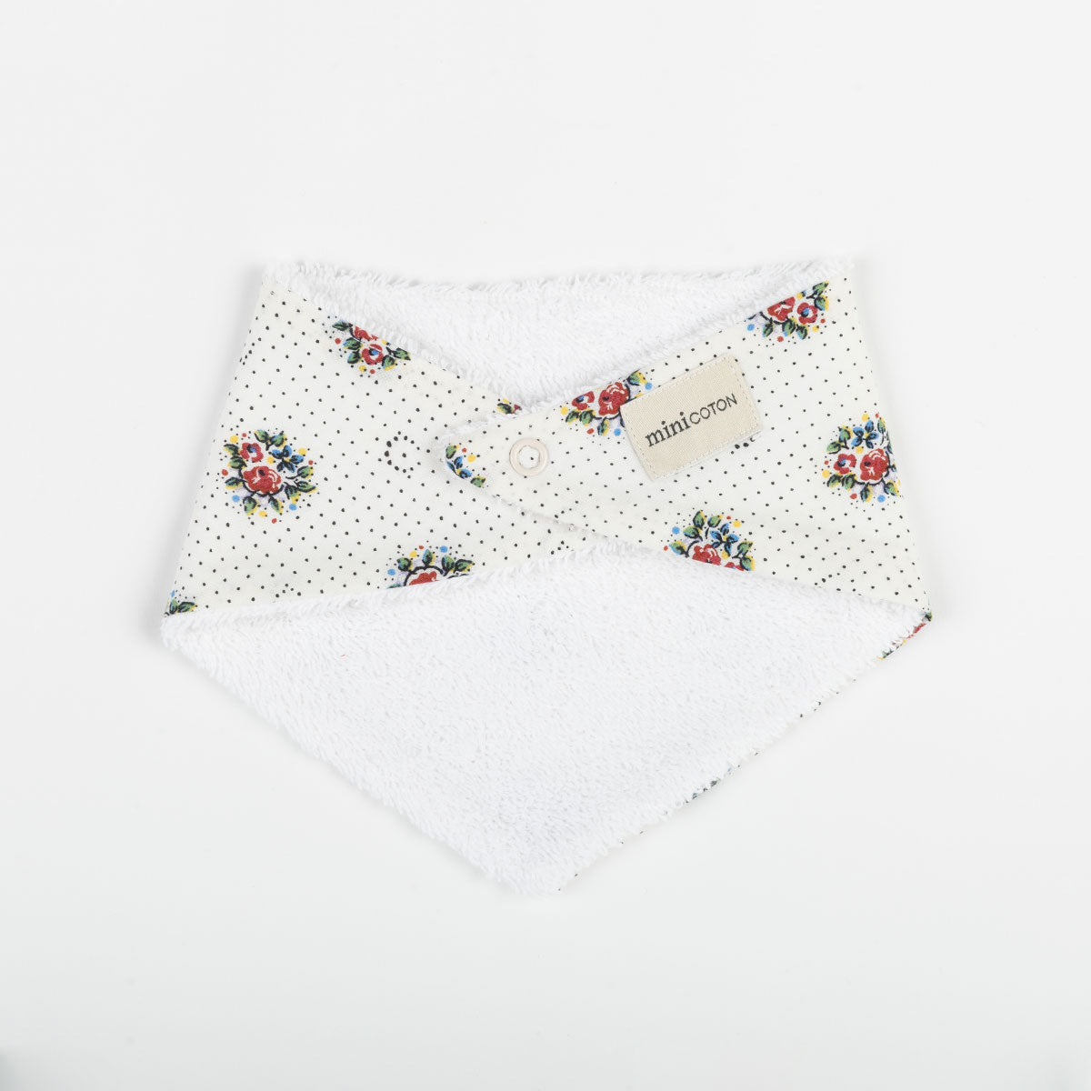 The bib is especially practical to prevent the baby's clothes from getting wet from drool. The baby will feel comfortable and we will avoid irritations and redness. It fastens with a practical click button, has two adjustment positions to regulate the neck circumference size. It is made without seams to avoid chafing. 100% cotton fabric.