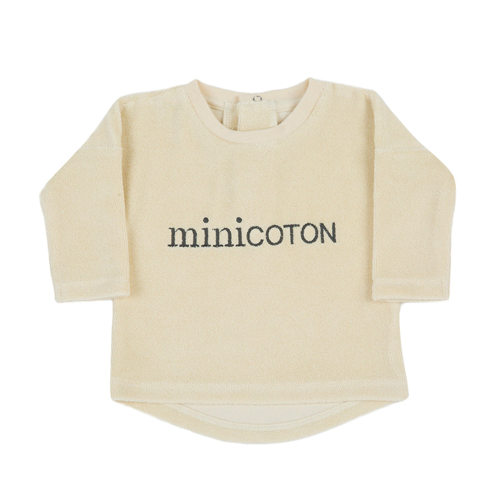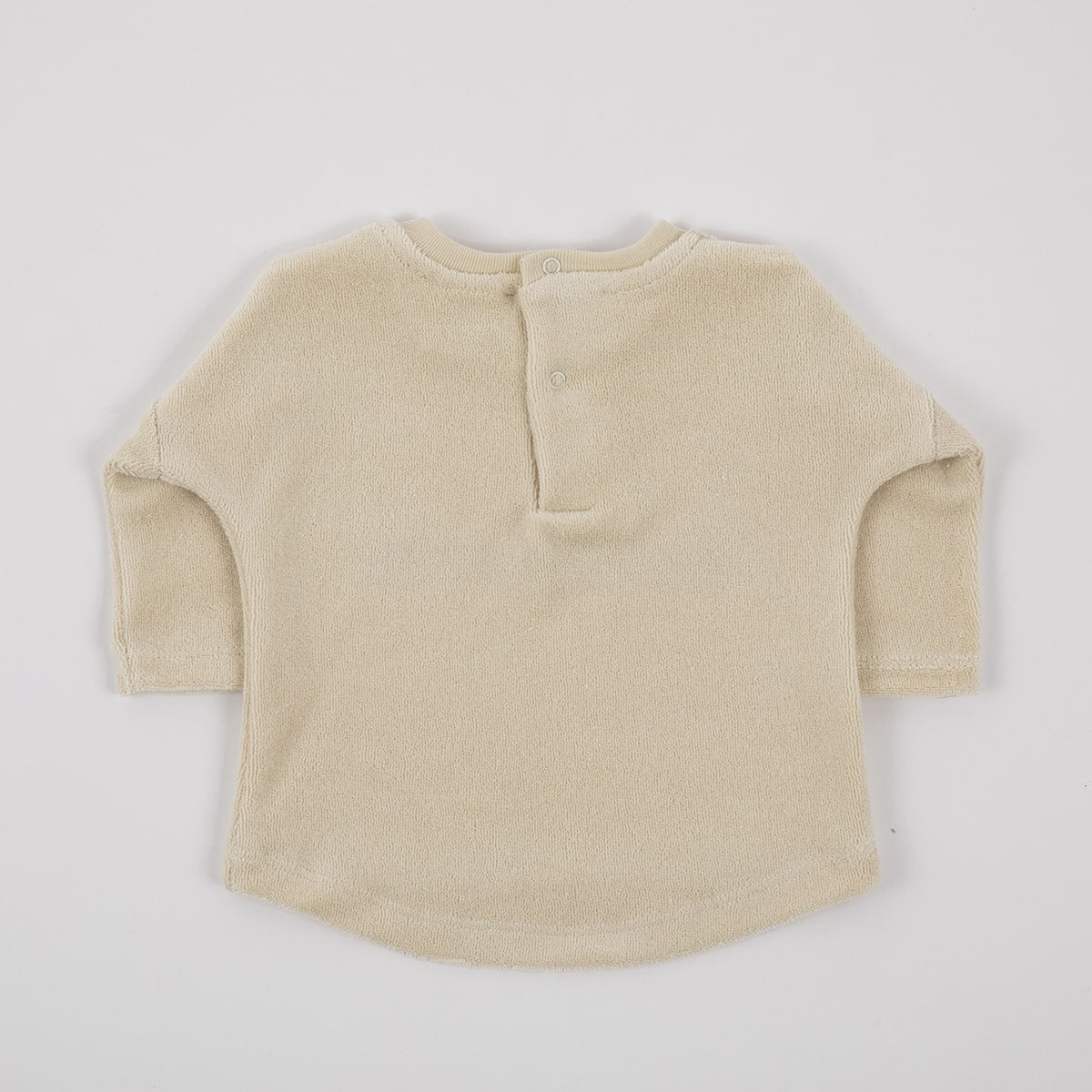 Loopback sweatshirt from the NEWBORN collection. It is made of loopback cotton knit with our logo embroidered in tone. It is asymmetrical, with the back part shaped and longer, for a comfortable and stylish baby look. It fastens at the shoulder with tone snap buttons. Size 0-3 months.