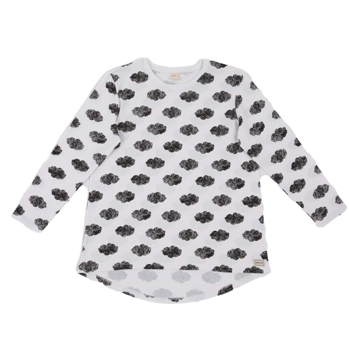 Cotton knit t-shirt with Minicoton clouds. Stylish French sleeve, just above the wrist, and asymmetrical hem with the back part longer. One size: S-M. Matching t-shirts available for baby and dad.