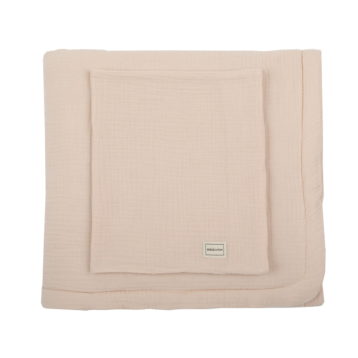 Housse de coussin 50 x 30 cm + Couverture 116 x 90 cm adaptée aussi bien aux lits bébé de 120x60cm qu'à ceux de 140x70cm. Très légère et toute douce pour le confort du bébé. Tissu principal et intérieur en mousseline de coton biologique 100%.