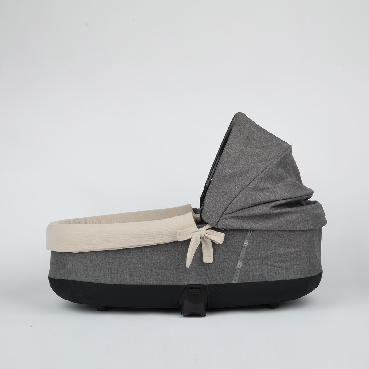 Ceci est notre housse pour la nacelle du Cybex Priam. Elle couvre toute la nacelle et se place sous le matelas, c’est pourquoi nous recommandons d’acheter le drap-housse assorti ou de combiner d’autres couleurs ou motifs pour habiller tout l’intérieur. Elle est disponible en différentes couleurs et motifs. Pour parfaire l’habillage de la nacelle, le sac ovale, une couverture légère ou une mousseline sont idéaux… selon vos besoins.