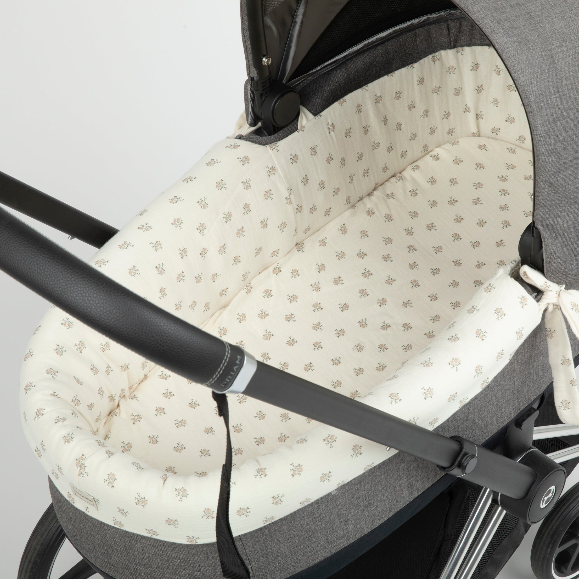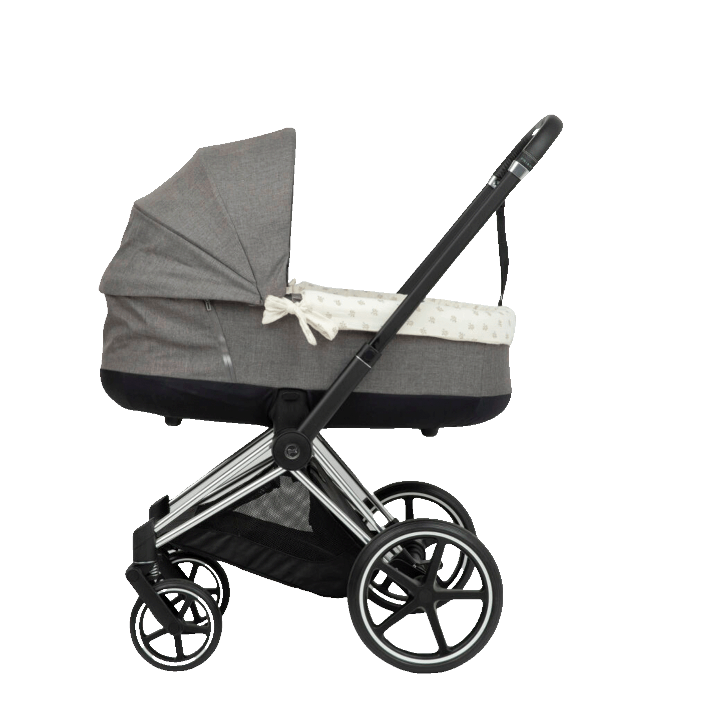 Voici notre housse pour la nacelle du Cybex Priam. Elle couvre toute la nacelle et se place sous le matelas, c’est pourquoi nous recommandons d’acheter le drap-housse assorti ou de combiner d’autres couleurs ou motifs pour que tout l’intérieur soit habillé. Elle est disponible en différentes couleurs et motifs. Pour parfaire l’habillage de la nacelle, le sac ovale, une couverture ou une mousseline sont idéaux… selon vos besoins.