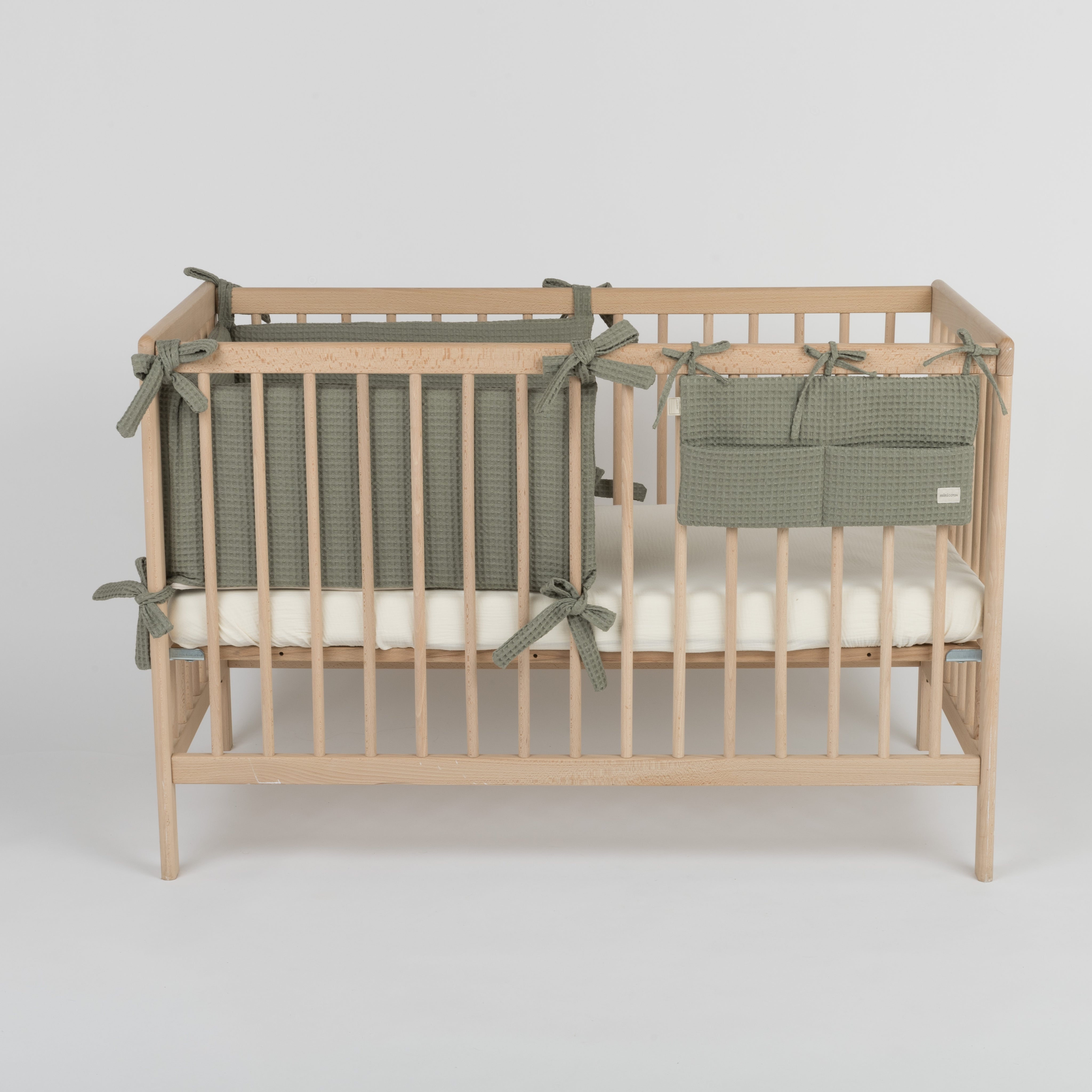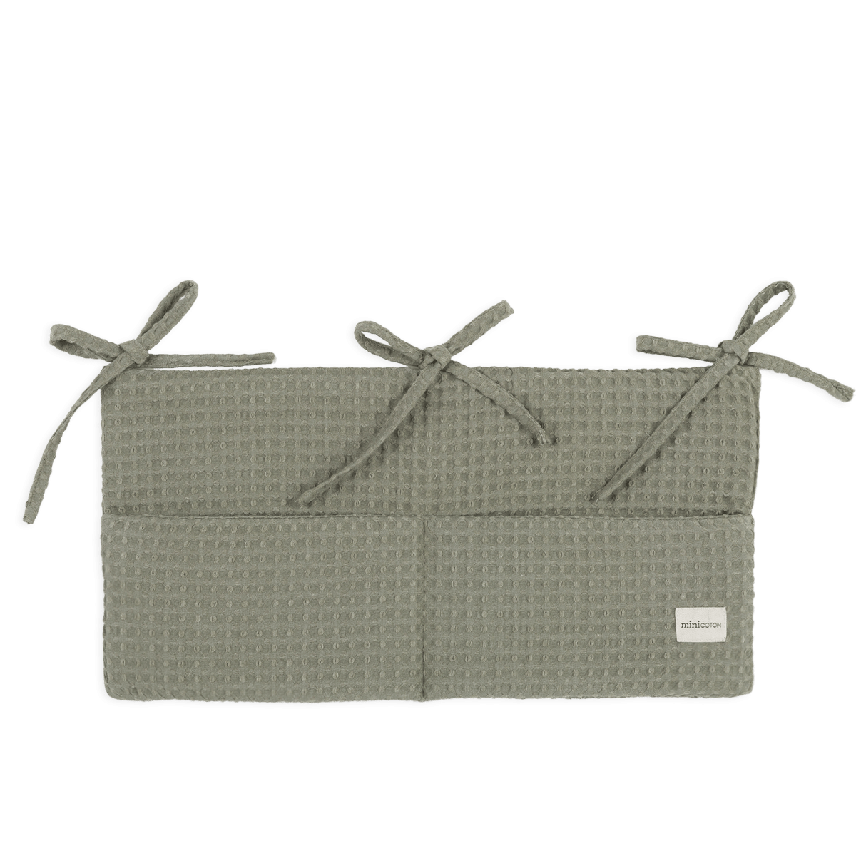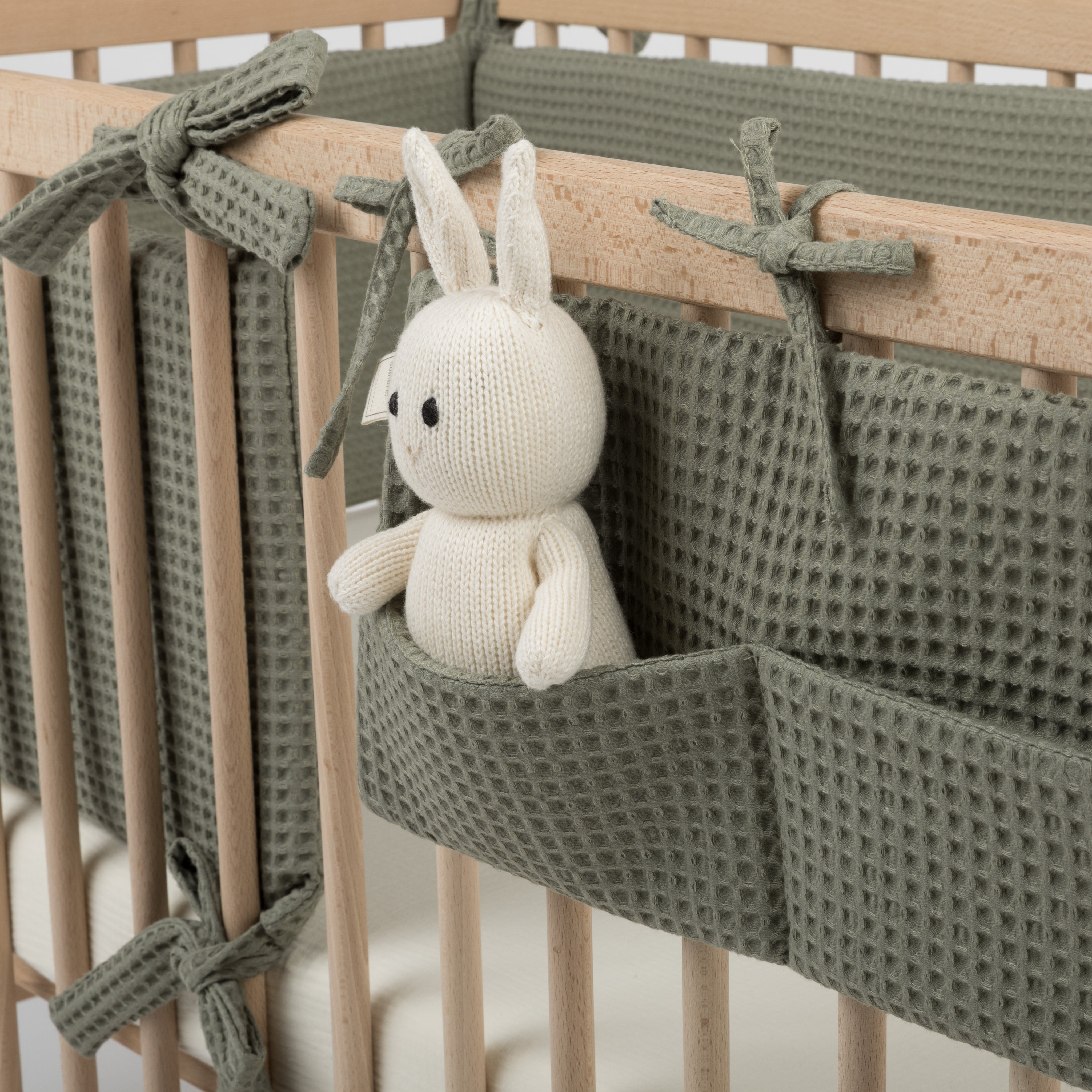 Organisateur pour lits bébé. Il se fixe avec trois petits rubans au lit.