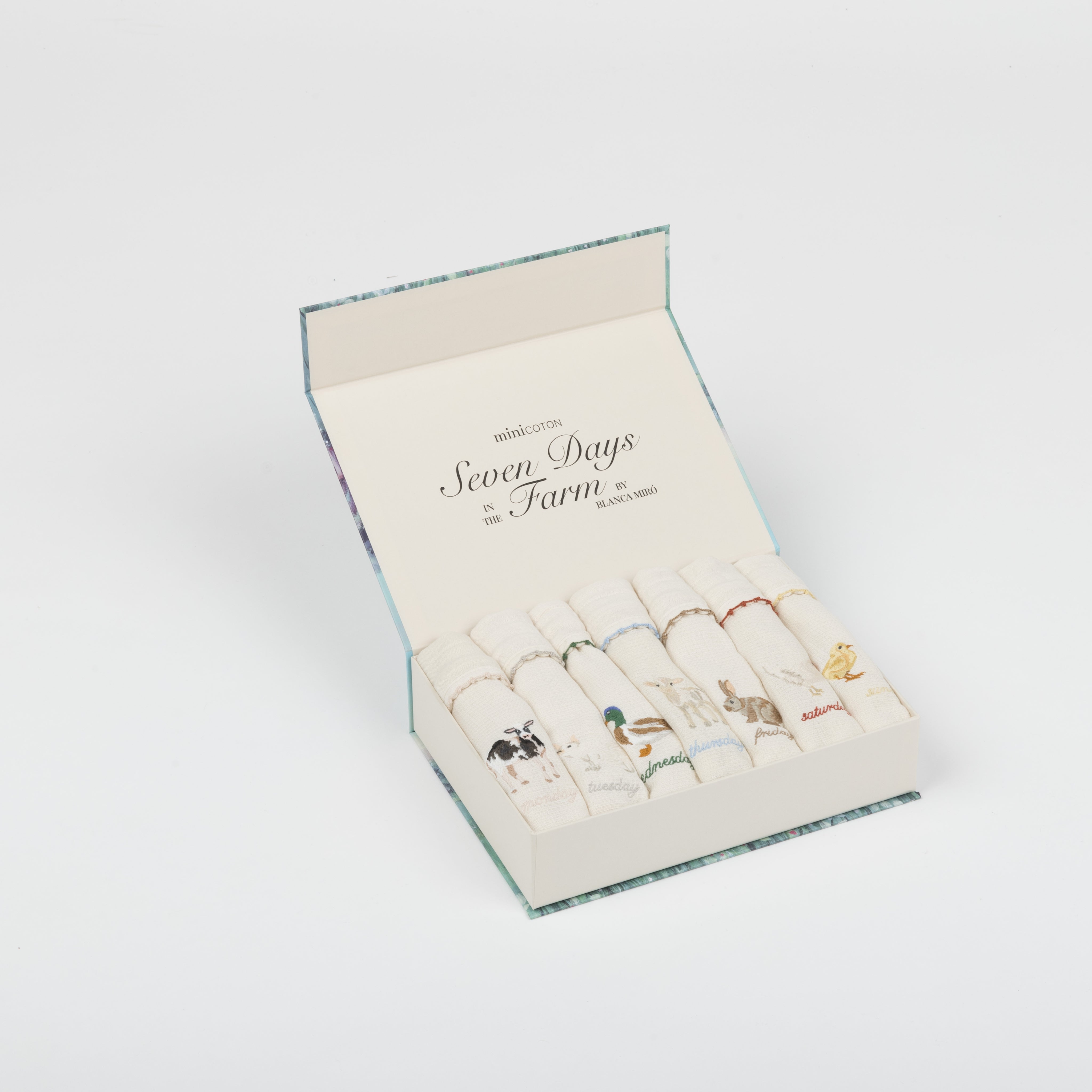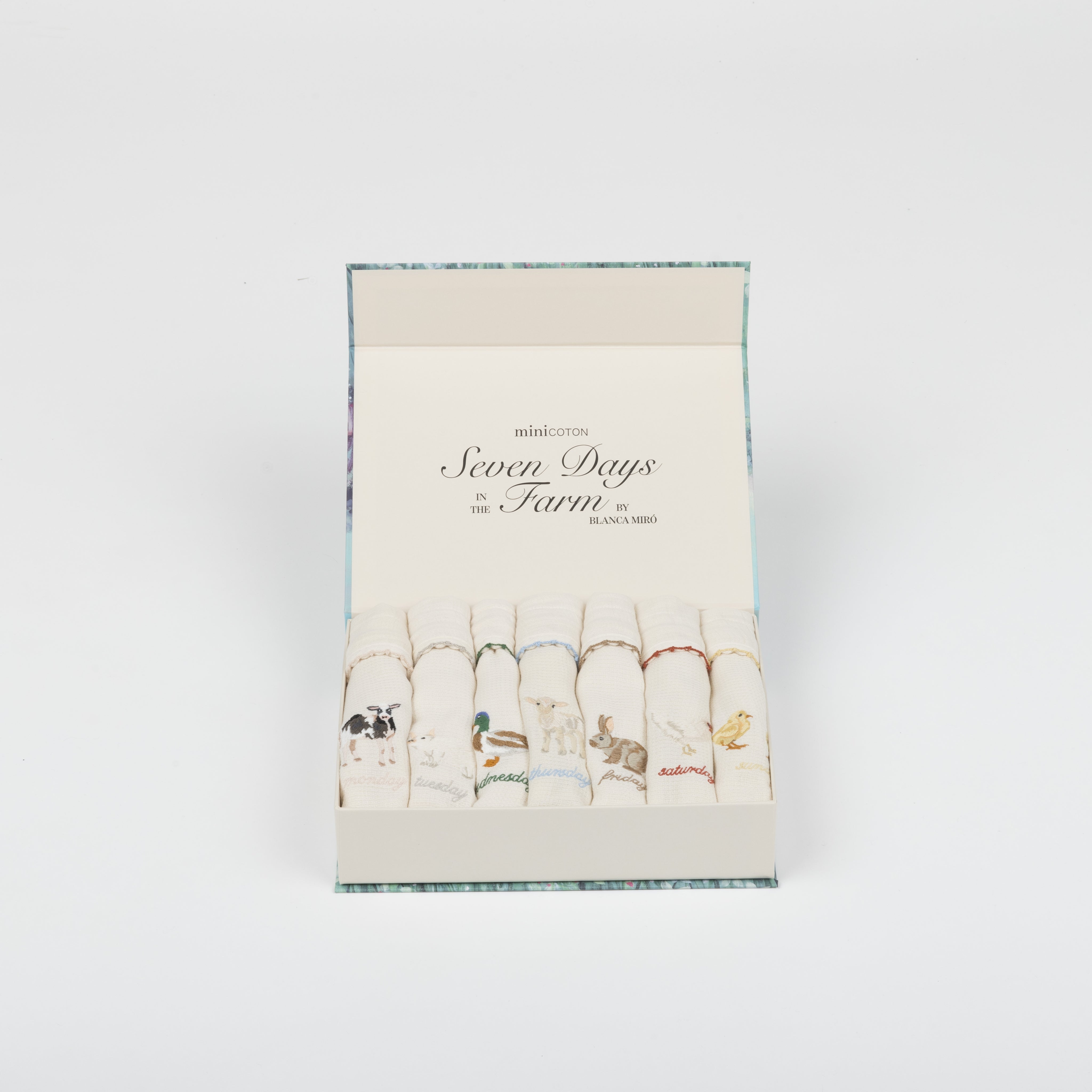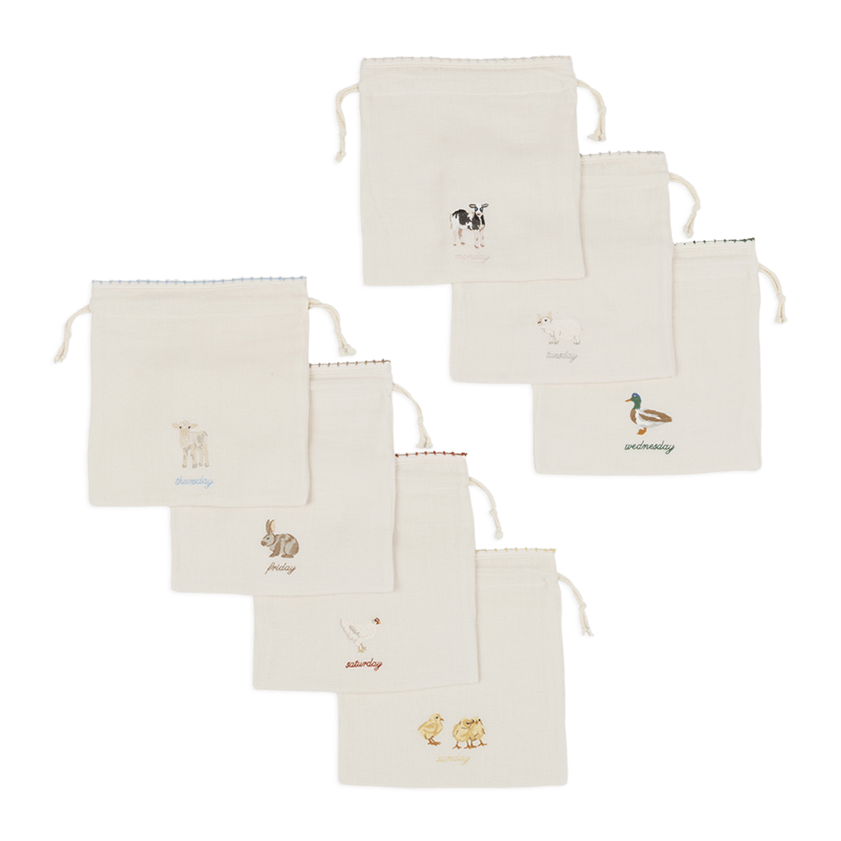 Set de 7 pochettes avec les jours de la semaine, brodées et bordées avec un fil de coton doux. Elles sont très pratiques pour les changes ou comme pochettes pour le goûter. Des pochettes multi-usages qui aideront à tout bien organiser.