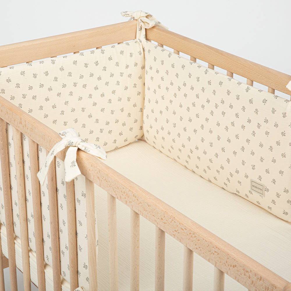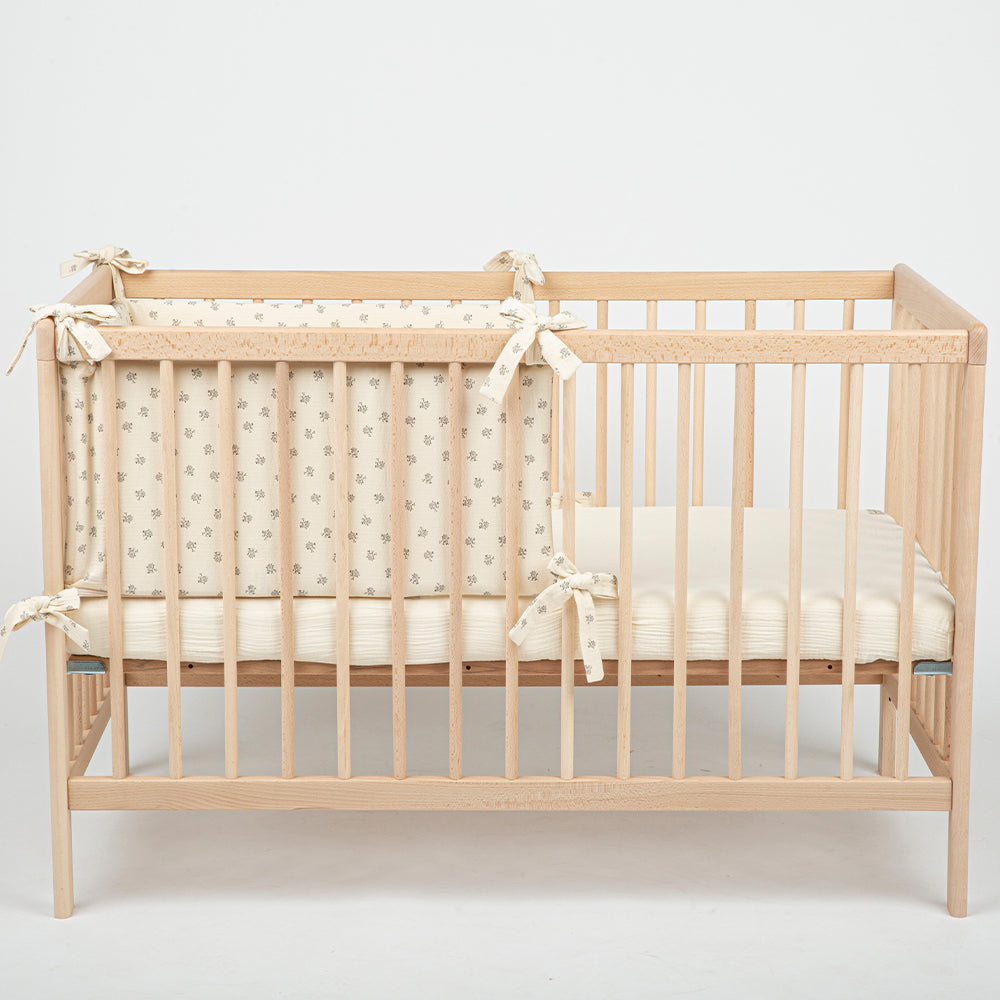 Questo paracolpi per culla “Half” è per culle da 120 x 60cm. Copre metà della culla nella parte della testata. Nel caso tu preferisca, puoi coprire tutto il perimetro della culla acquistando due unità.