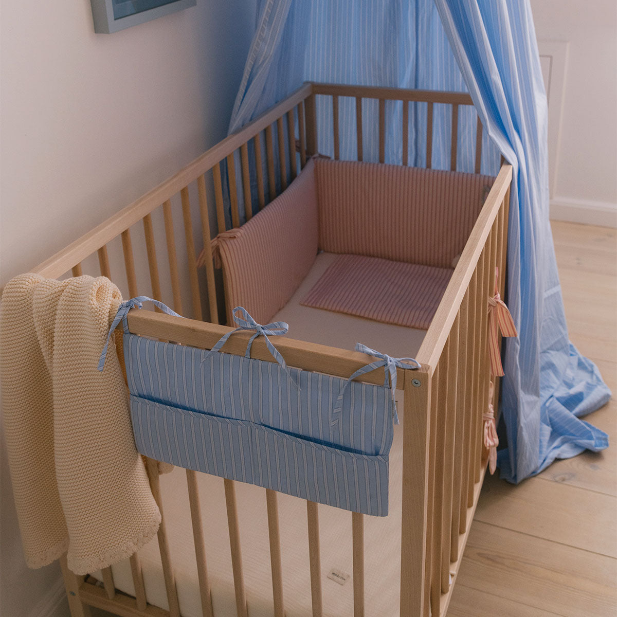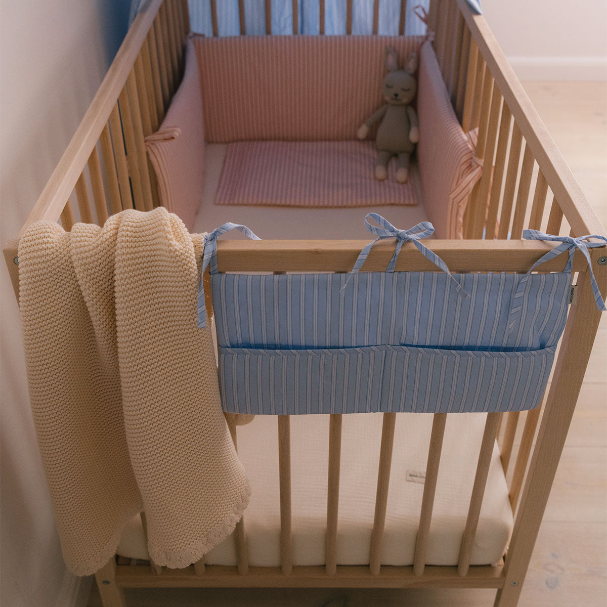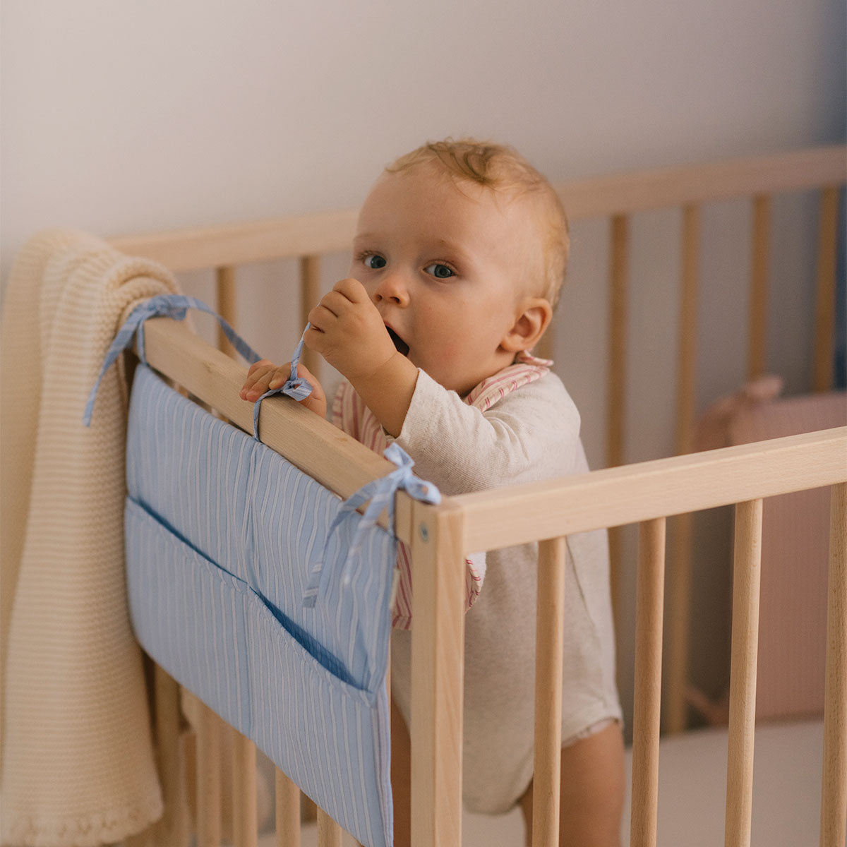 Organizzatore per culle. Si lega con tre nastrini alla culla. Le due tasche ti permetteranno di avere a portata di mano le cose per il tuo bambino: ciucci, pannolini, pigiamini…