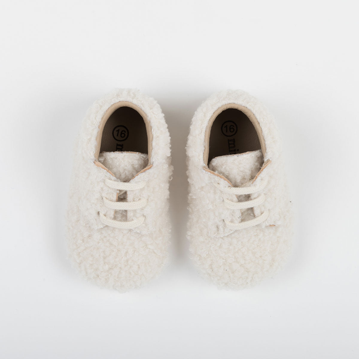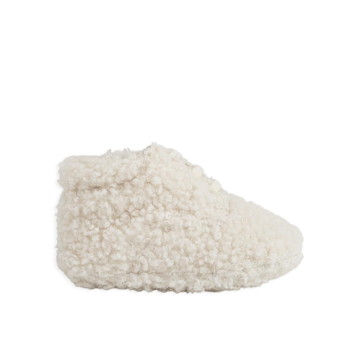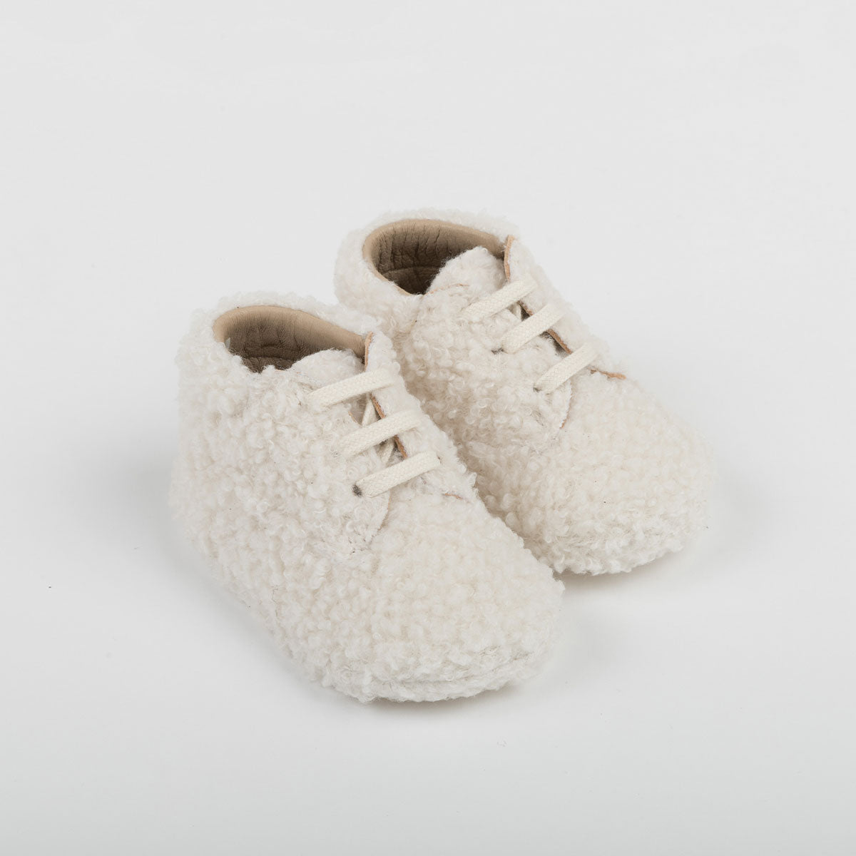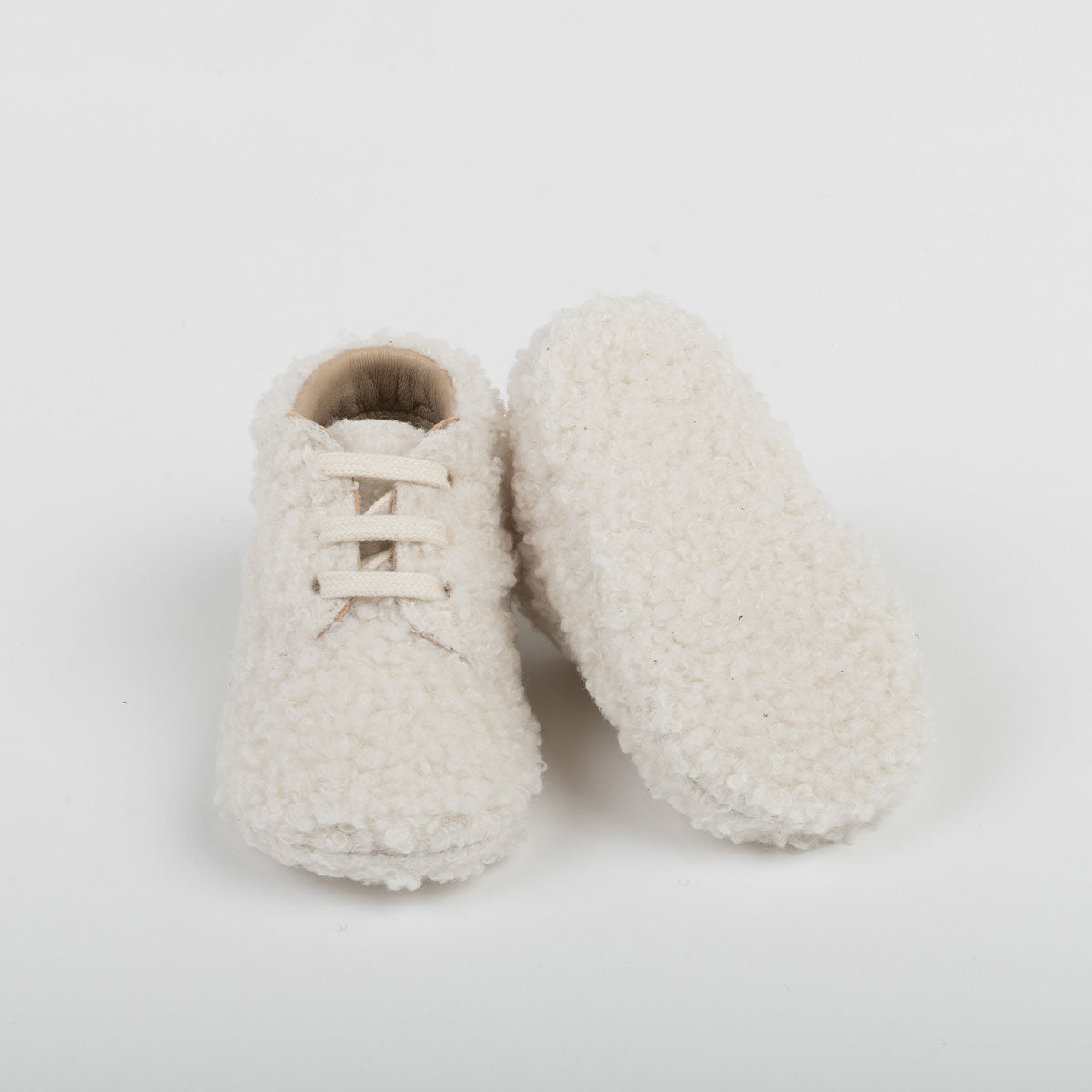 Stivaletto in tessuto shearling di colore grezzo. Chiusura con lacci per una maggiore tenuta. Soletta imbottita e suola flessibile in pelle 100%. Grazie alla sua flessibilità e morbidezza, è rispettoso dei piedi e molto confortevole, diventando una seconda pelle.