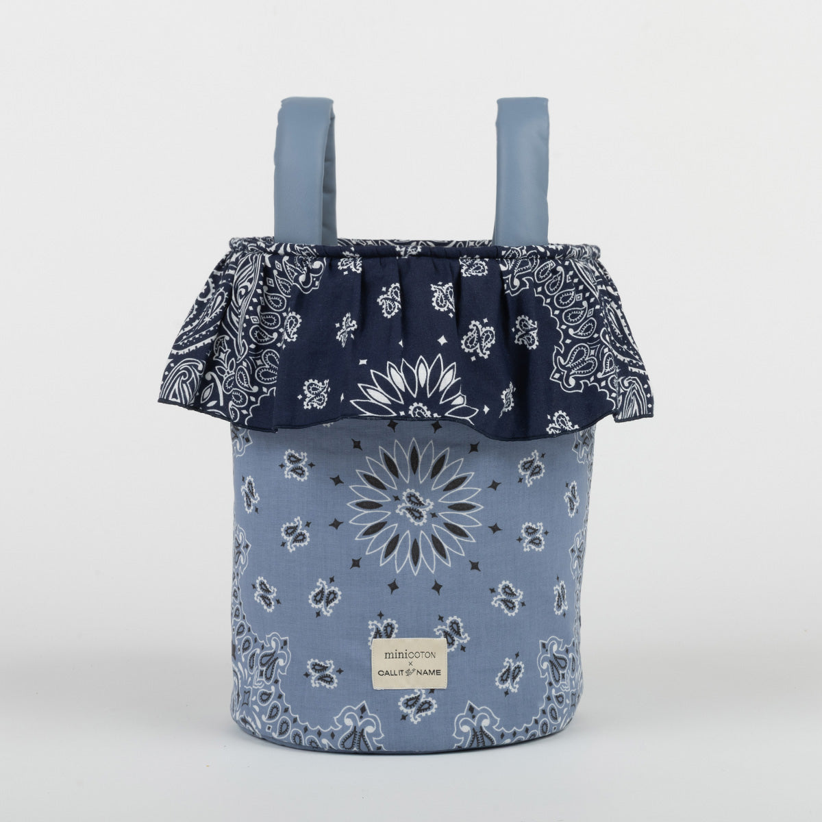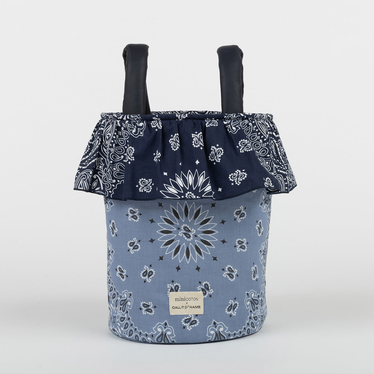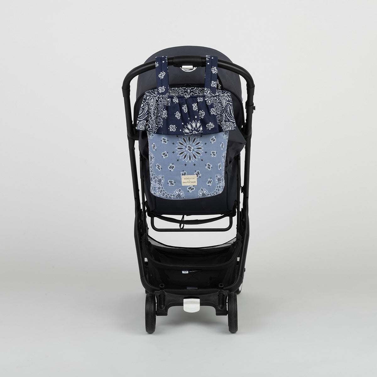 Una bolsa muy especial por sus asas quita y pon, que adoptan diferentes posiciones para que sea perfecta como bolso de mano o bolsa para el cochecito. Con solo dos clics, tu bolsa cambia de formato para acompañarte de la mejor manera. Se cierra de manera muy práctica con sus cuerdas en la parte superior, como una bolsa de la merienda. Tiene gran capacidad y su interior es de tejido repelente al agua y a las manchas, fácil de lavar con un paño húmedo. Confeccionada con bandanas hechas en USA de 100% algodón.