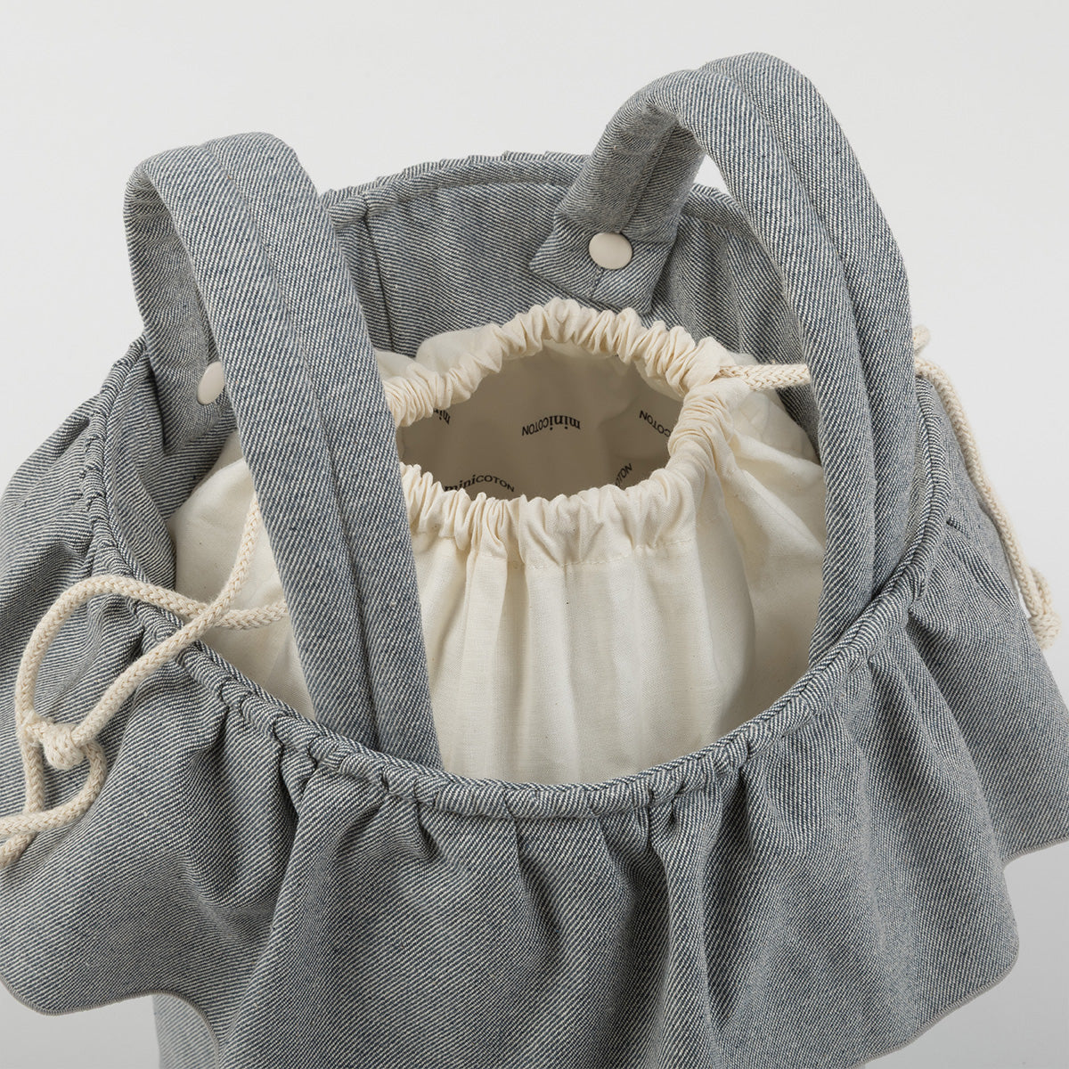 Una bolsa muy especial por sus asas quita y pon, que adoptan diferentes posiciones para que sea perfecta como bolso de mano o bolsa para el cochecito. Con solo dos clicks tu bolsa cambia de formato para acompañarte de la mejor manera. Se cierra de manera muy práctica con sus cuerdas en la parte superior, como una bolsa de la merienda. Tiene gran capacidad y su interior es de tejido repelente al agua y a las manchas, fácil de lavar con un paño húmedo. El exterior es 53% algodón y 47% Recycled Denim.