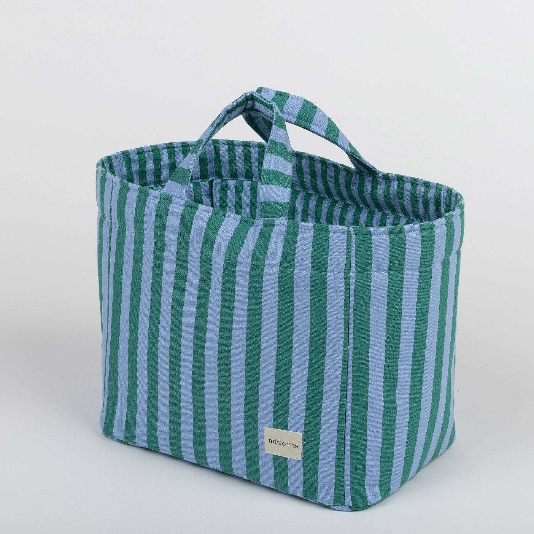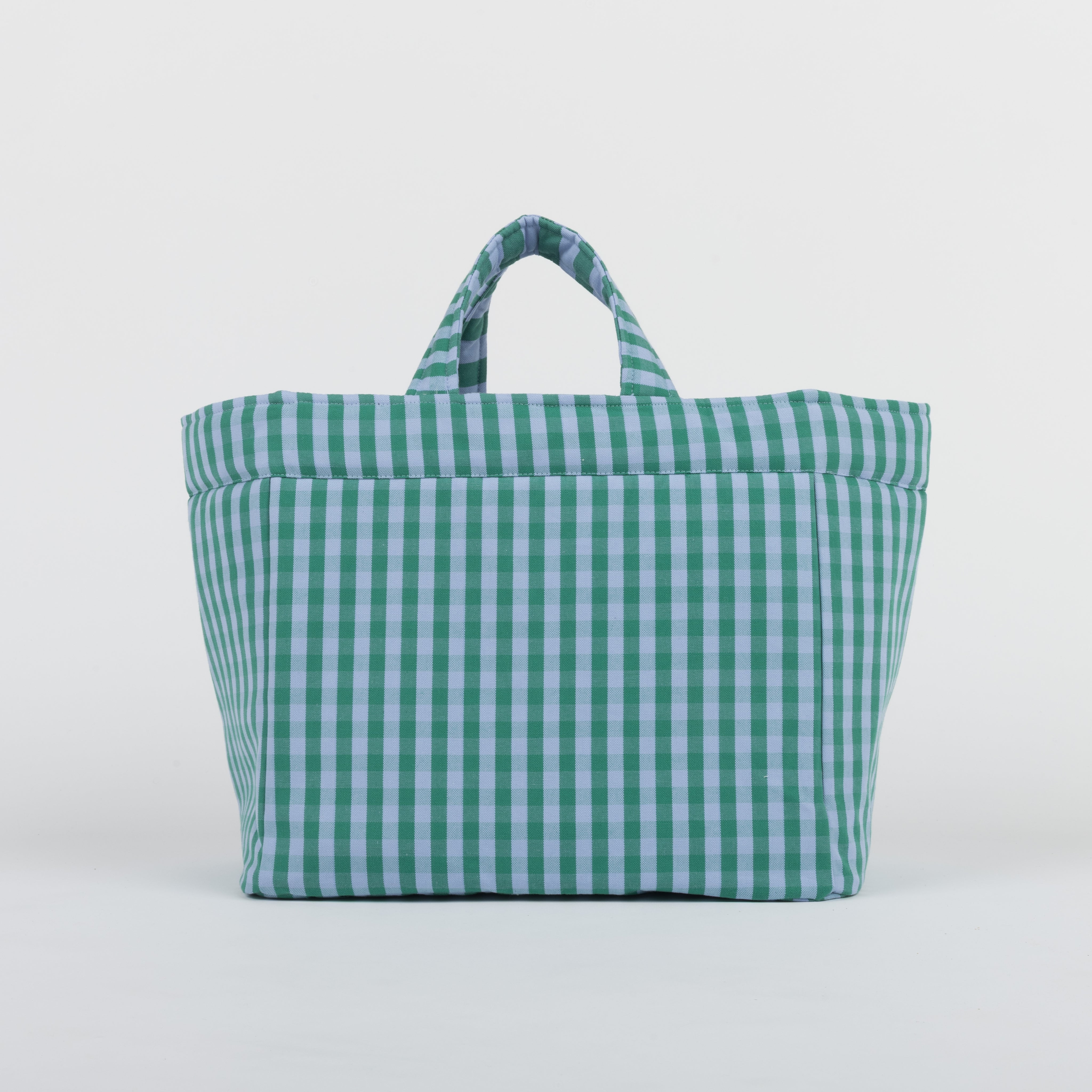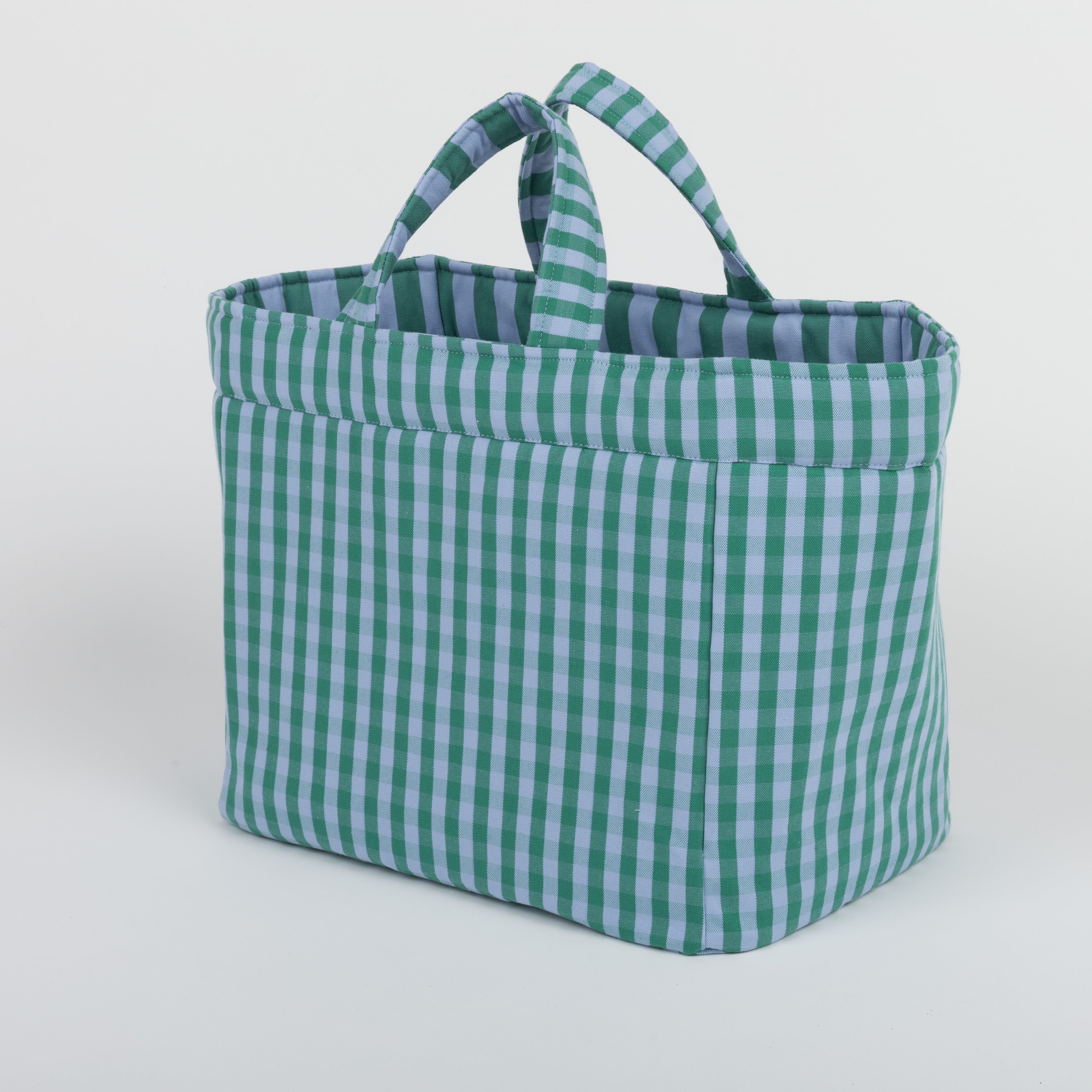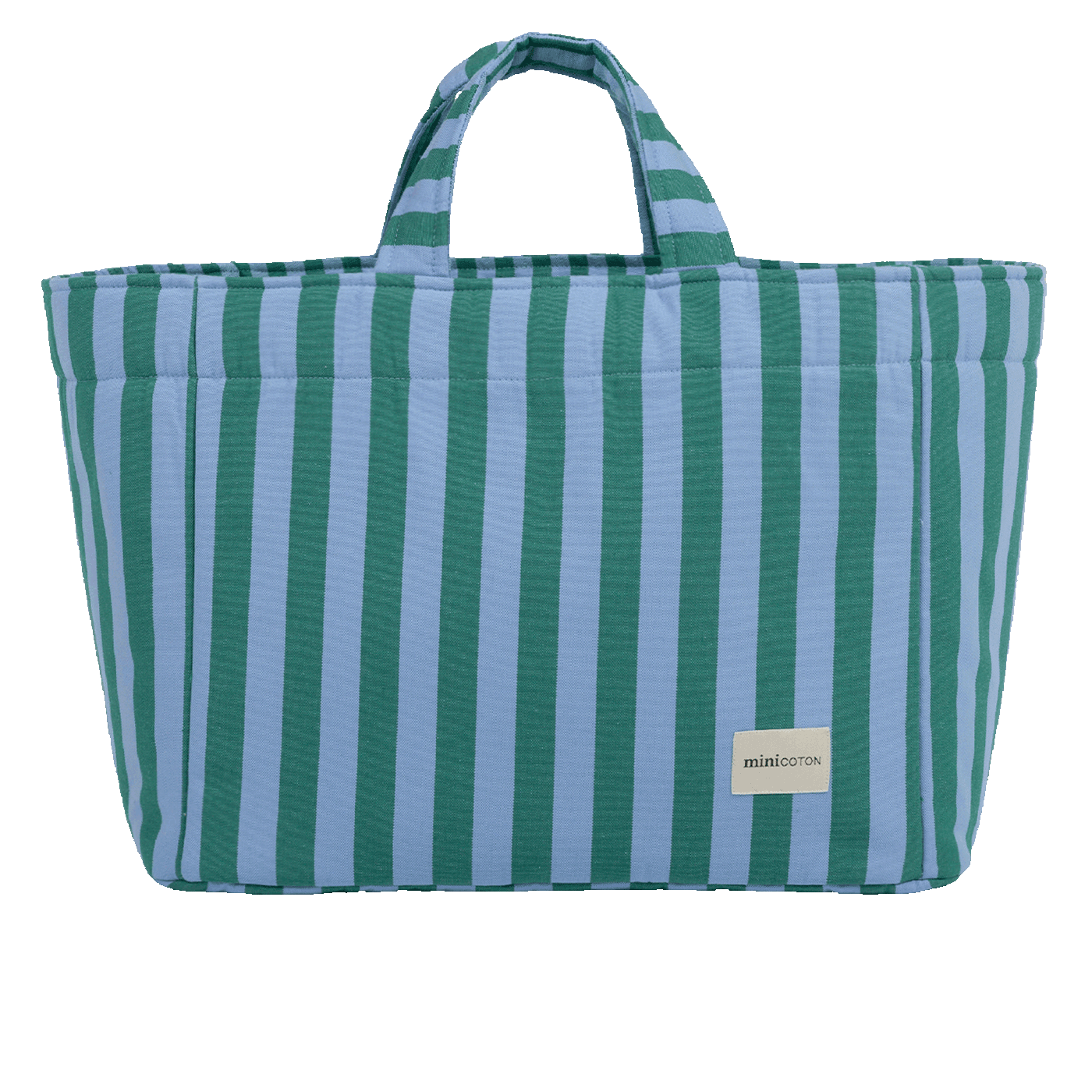 Reversible, por un lado rayas y por el otro vichy. Una bolsa ligera con mucha capacidad y acolchada, ideal para esas escapadas.