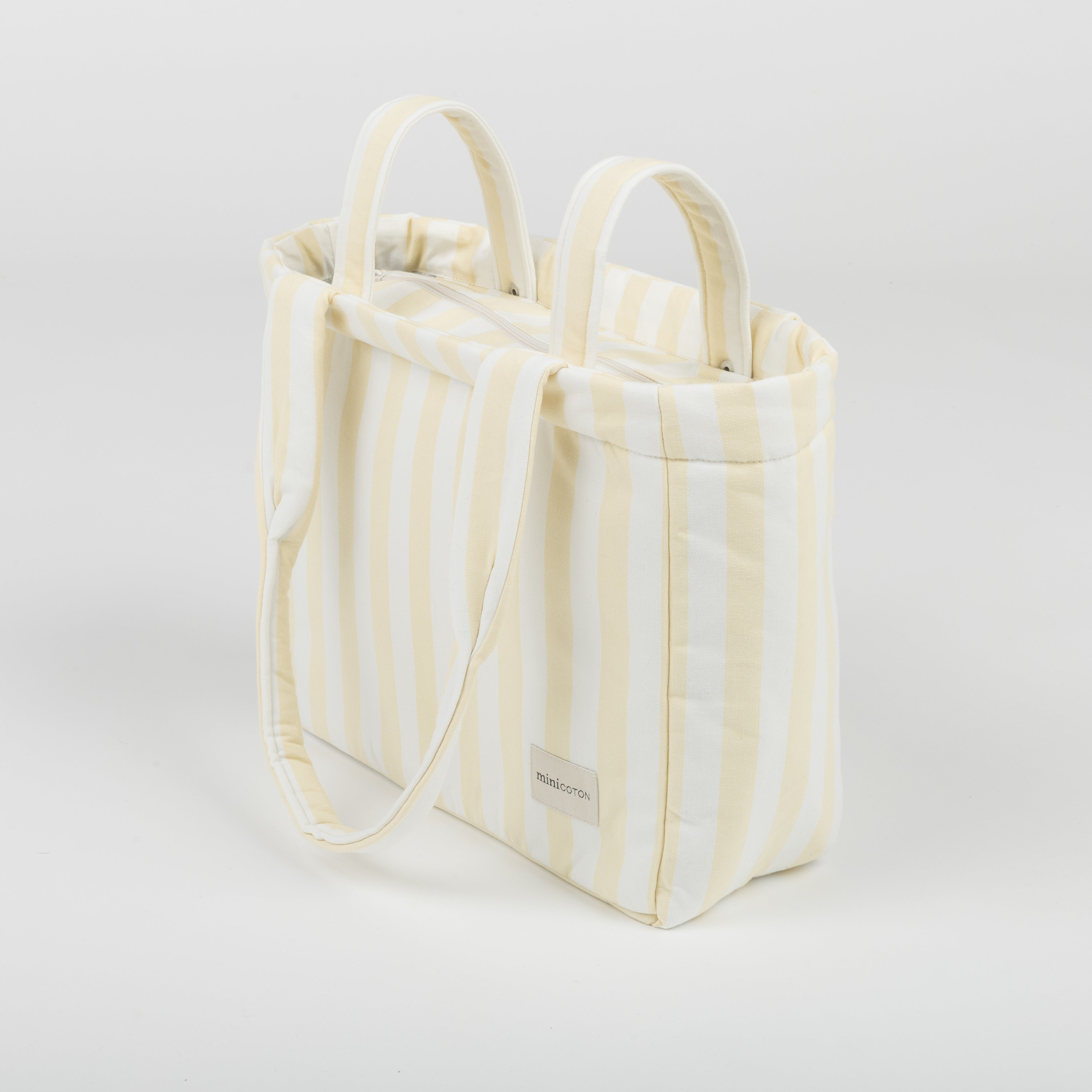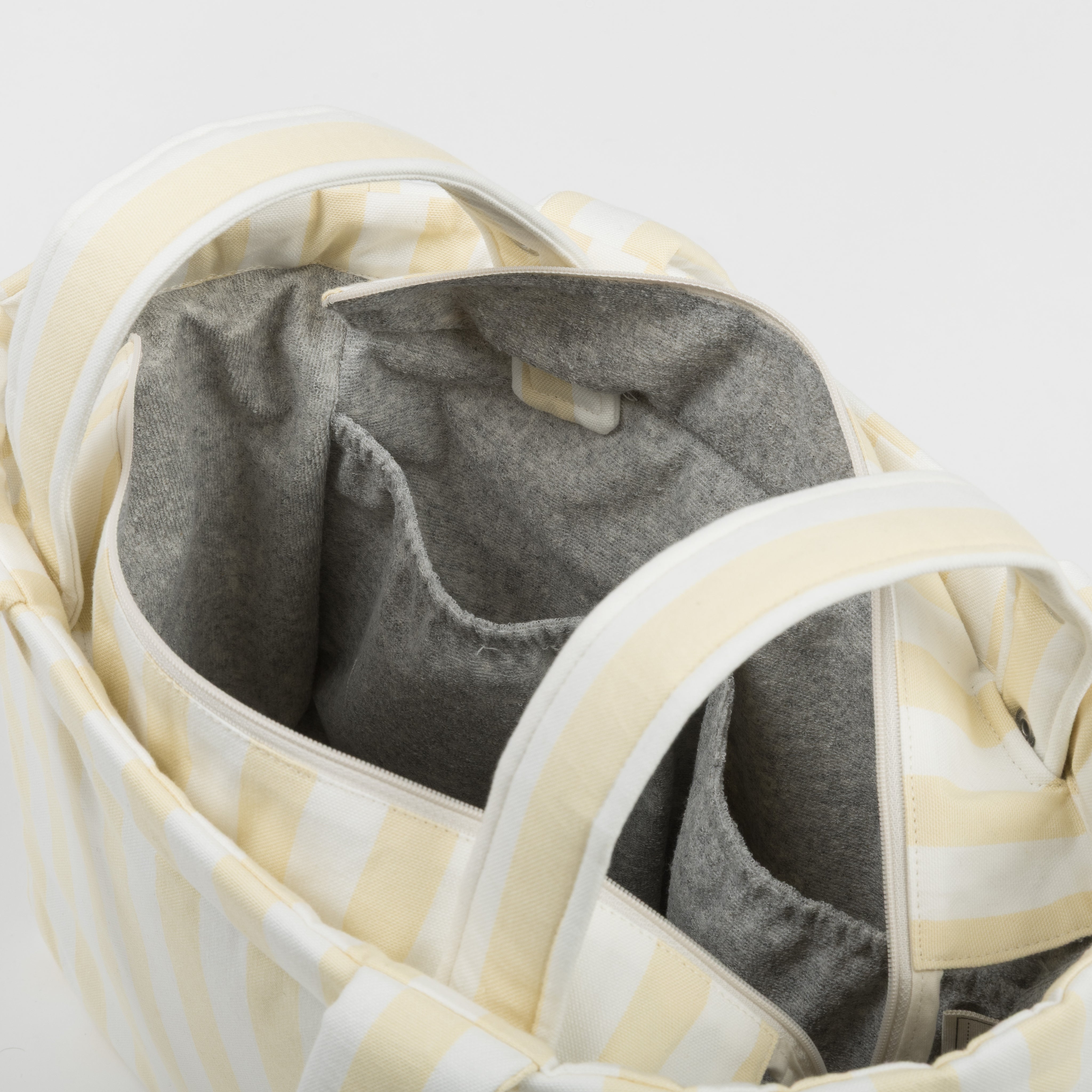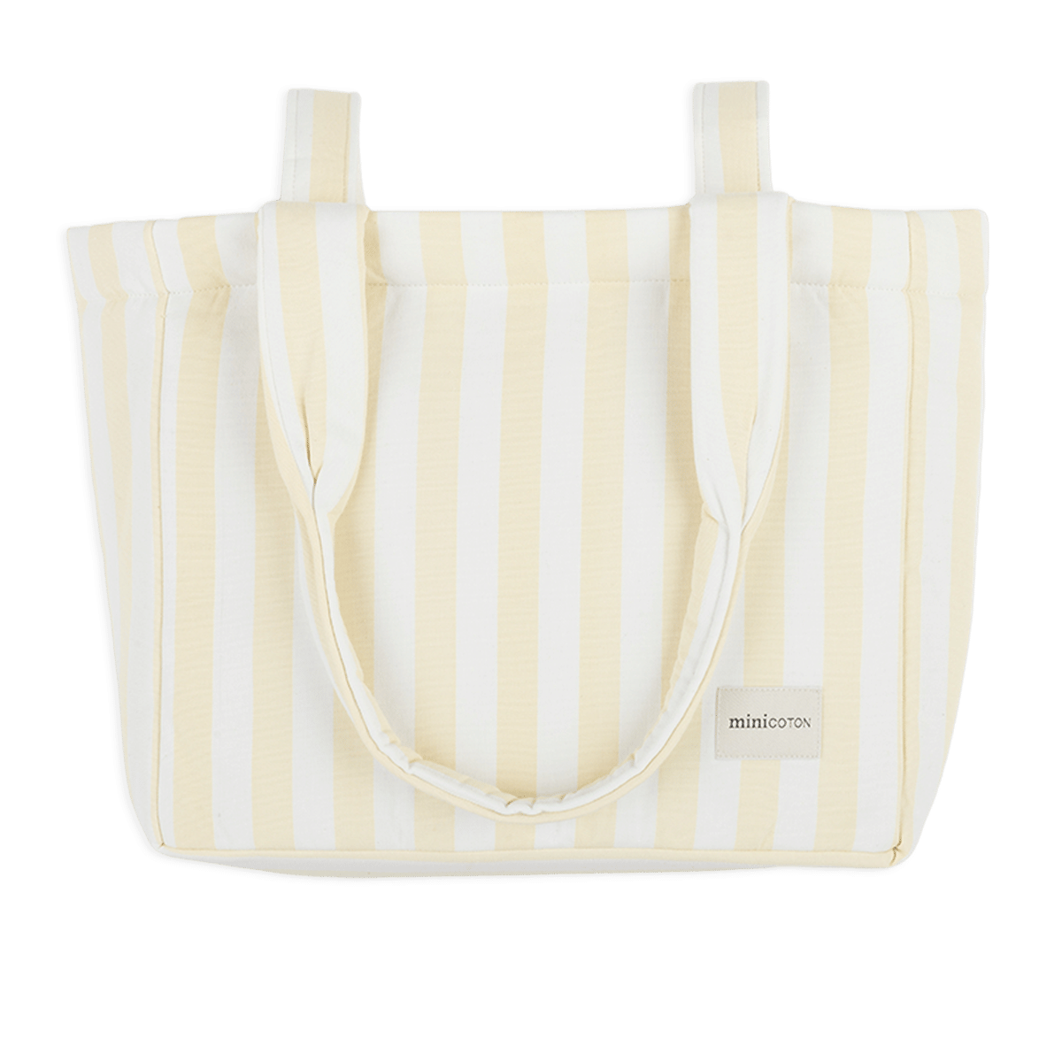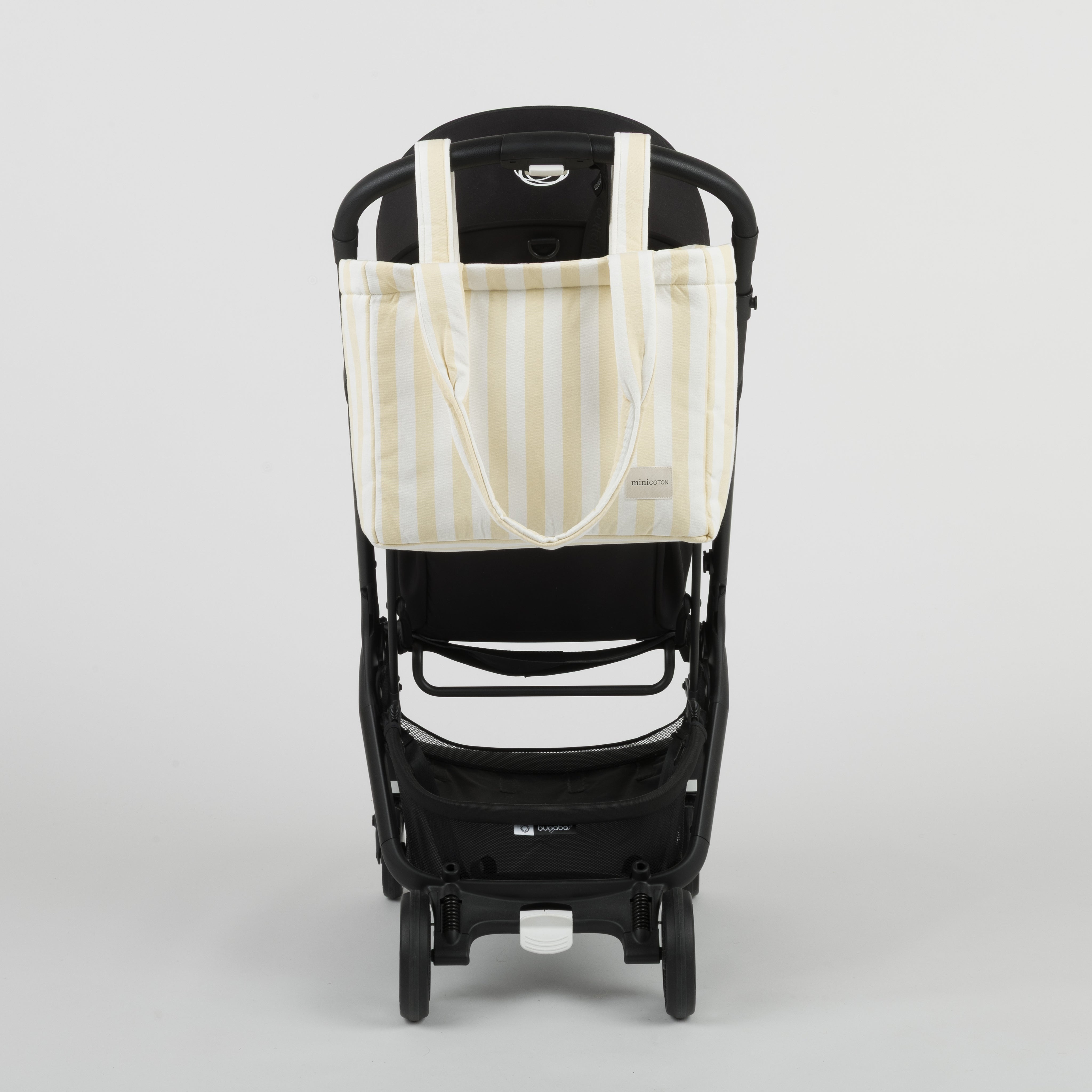 Una bolsa espaciosa y muy ligera. Con cintas para el manillar del cochecito que se esconden a través de sus ojales, para convertirse en un práctico tote para llevar al hombro. Con dos bolsillos interiores y cierre con cremallera.
